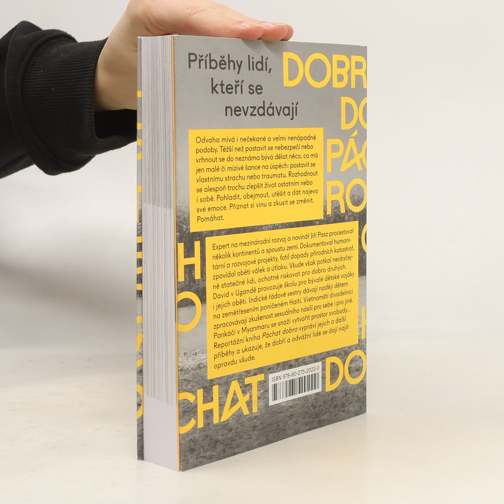Reportáže o lidech, kteří se nevzdávají Odvaha mívá i nečekané a velmi nenápadné podoby. Těžší než postavit se nebezpečí nebo vrhnout se do neznáma bývá dělat něco, co má jen malé či mizivé šance na úspěch: postavit se vlastnímu strachu nebo traumatu. Rozhodnout se vykonat něco pro sebe i pro ostatní. Pohladit, obejmout, utěšit a dát najevo své emoce. Přiznat si vinu a zkusit se změnit. Pomáhat. Expert na mezinárodní rozvoj a novinář Jiří Pasz procestoval několik kontinentů a spoustu zemí. Dokumentoval humanitární a rozvojové projekty, fotil dopady přírodních katastrof, zpovídal oběti válek a útlaku. Všude však potkal neobyčejně statečné lidi, ochotné riskovat pro dobro druhých. David v Ugandě provozuje školu pro bývalé dětské vojáky i jejich oběti. Indické řádové sestry dávají naději dětem na zemětřesením poničeném Haiti. Vietnamští divadelníci zpracovávají zkušenost sexuálního násilí, pro sebe i pro jiné. Pankáči v Barmě se snaží vytvořit prostor svobody. Reportážní kniha Páchat dobro vypráví jejich příběhy a ukazuje, že dobří a odvážní lidé se dají najít opravdu všude.