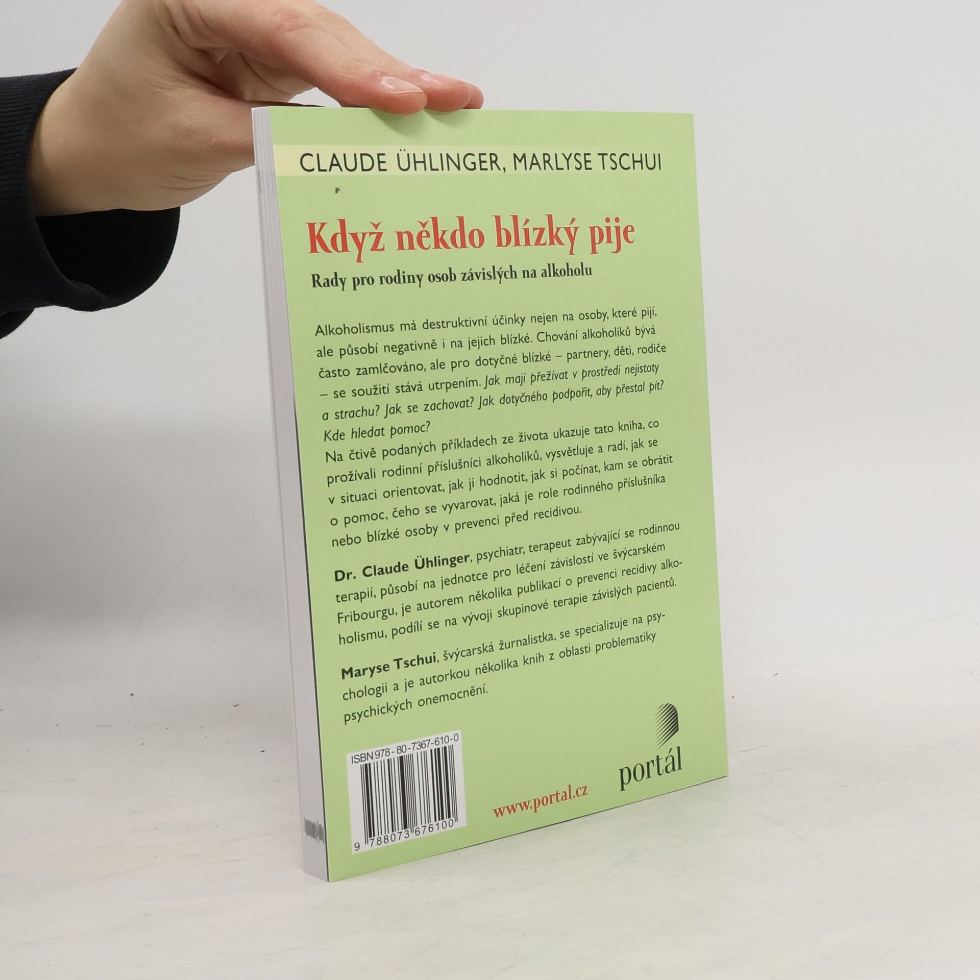 Alkoholismus má destruktivní účinky nejen na osoby, které pijí, ale působí negativně i na jejich blízké. Diagnózu alkoholik má v České republice 300 000 lidí (do tohoto počtu ovšem nejsou zahrnuti ti, kdo nikde evidováni nejsou). Počet takových lidí u nás narůstá, v současnosti je čekací doba na ústavní léčení několik měsíců. Chování alkoholiků, způsobené touto chorobou, bývá často zamlčováno, ale pro jejich blízké – partnery, děti, rodiče – se soužití stává utrpením. Kniha je určena rodinným příslušníkům osob, které se potýkají se závislostí na alkoholu, také lidem jim blízkým a lidem z jejich okolí. Dr. Claude Ühlinger, psychiatr, terapeut zabývající se rodinnou terapií, působí na jednotce pro léčení závislostí ve švýcarském Fribourgu, je autorem několika publikací o prevenci recidivy alkoholismu, podílí se na vývoji skupinové terapie závislých pacientů. Marlyse Tschui, švýcarská žurnalistka, se specializuje se na psychologii a je autorkou několika knih, např. o psychických onemocněních.