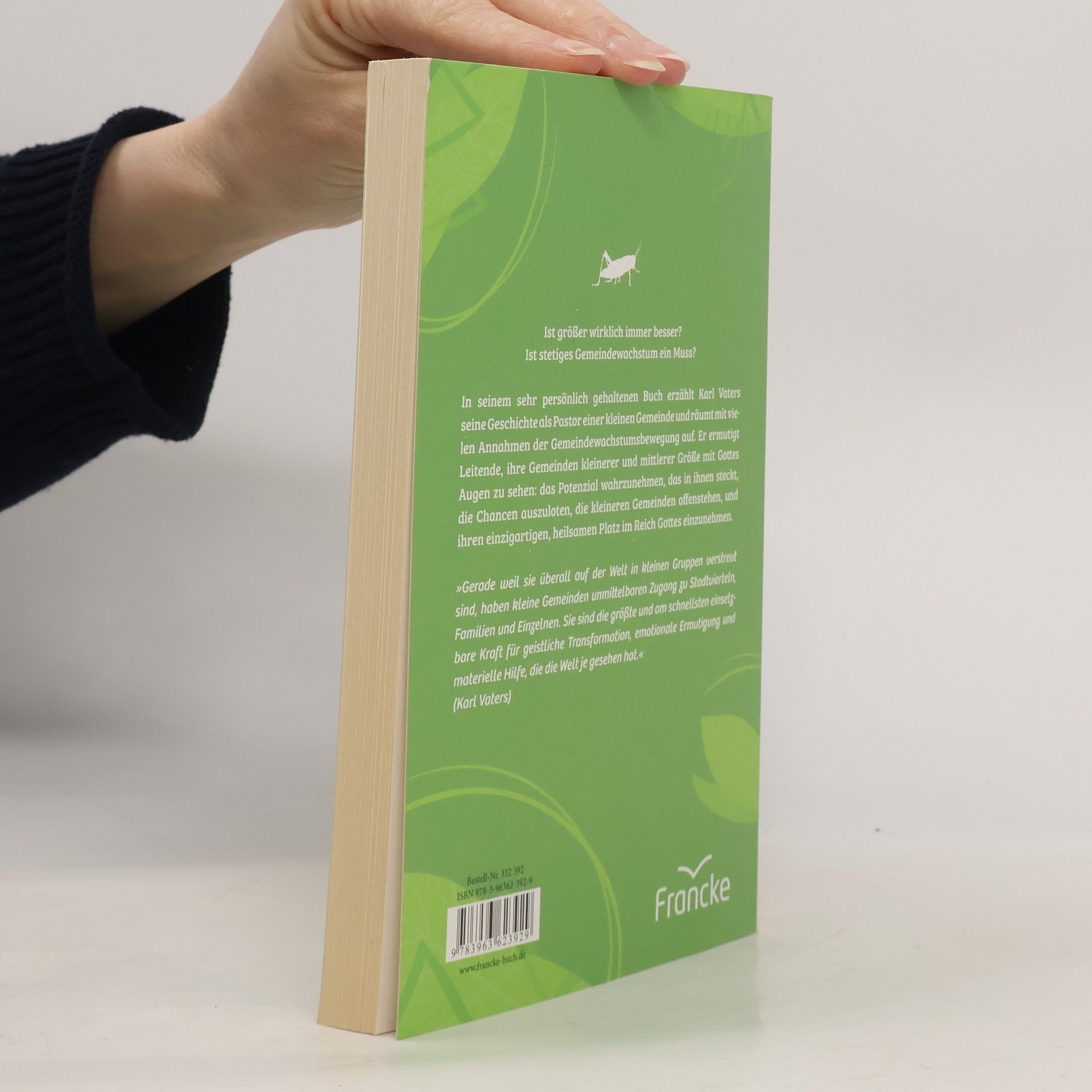 Ist größer wirklich immer besser? Ist stetiges Gemeindewachstum ein Muss? In seinem sehr persönlich gehaltenen Buch erzählt Karl Vaters seine Geschichte als Pastor einer kleinen Gemeinde und räumt mit vielen Annahmen der Gemeindewachstumsbewegung auf. Er ermutigt Leitende, ihre Gemeinden kleinerer und mittlerer Größe mit Gottes Augen zu sehen: das Potenzial wahrzunehmen, das in ihnen steckt, die Chancen auszuloten, die kleineren Gemeinden offenstehen, und ihren einzigartigen, heilsamen Platz im Reich Gottes einzunehmen. »Gerade weil sie überall auf der Welt in kleinen Gruppen verstreut sind, haben kleine Gemeinden unmittelbaren Zugang zu Stadtvierteln, Familien und Einzelnen. Sie sind die größte und am schnellsten einsetzbare Kraft für geistliche Transformation, emotionale Ermutigung und materielle Hilfe, die die Welt je gesehen hat.« (Karl Vaters)