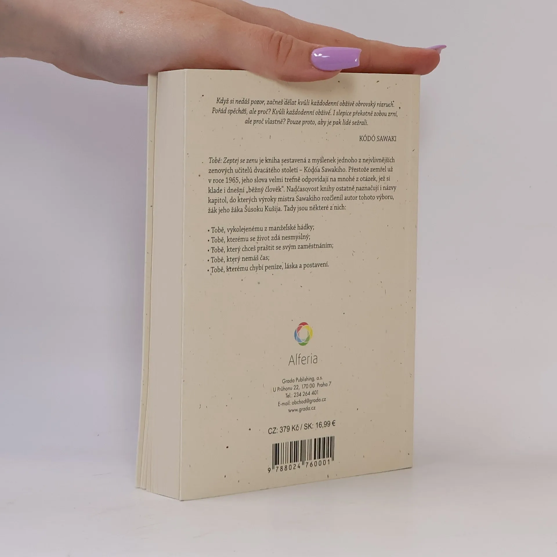 Tobě: Zeptej se zenu je kniha sestavená z myšlenek jednoho z nejvlivnějších zenových učitelů dvacátého století – Kódóa Sawakiho. Přestože zemřel už v roce 1965, jeho slova velmi trefně odpovídají na mnohé z otázek, jež si klade i dnešní „běžný člověk“. Nadčasovost knihy ostatně naznačují i názvy kapitol, do kterých výroky mistra Sawakiho rozčlenil autor tohoto výboru, žák jeho žáka Šúsoku Kušija. Tady jsou některé z nich: Tobě, vykolejenému z manželské hádky; Tobě, kterému se život zdá nesmyslný; Tobě, který chceš praštit se svým zaměstnáním; Tobě, který nemáš čas; Tobě, kterému chybí peníze, láska a postavení.