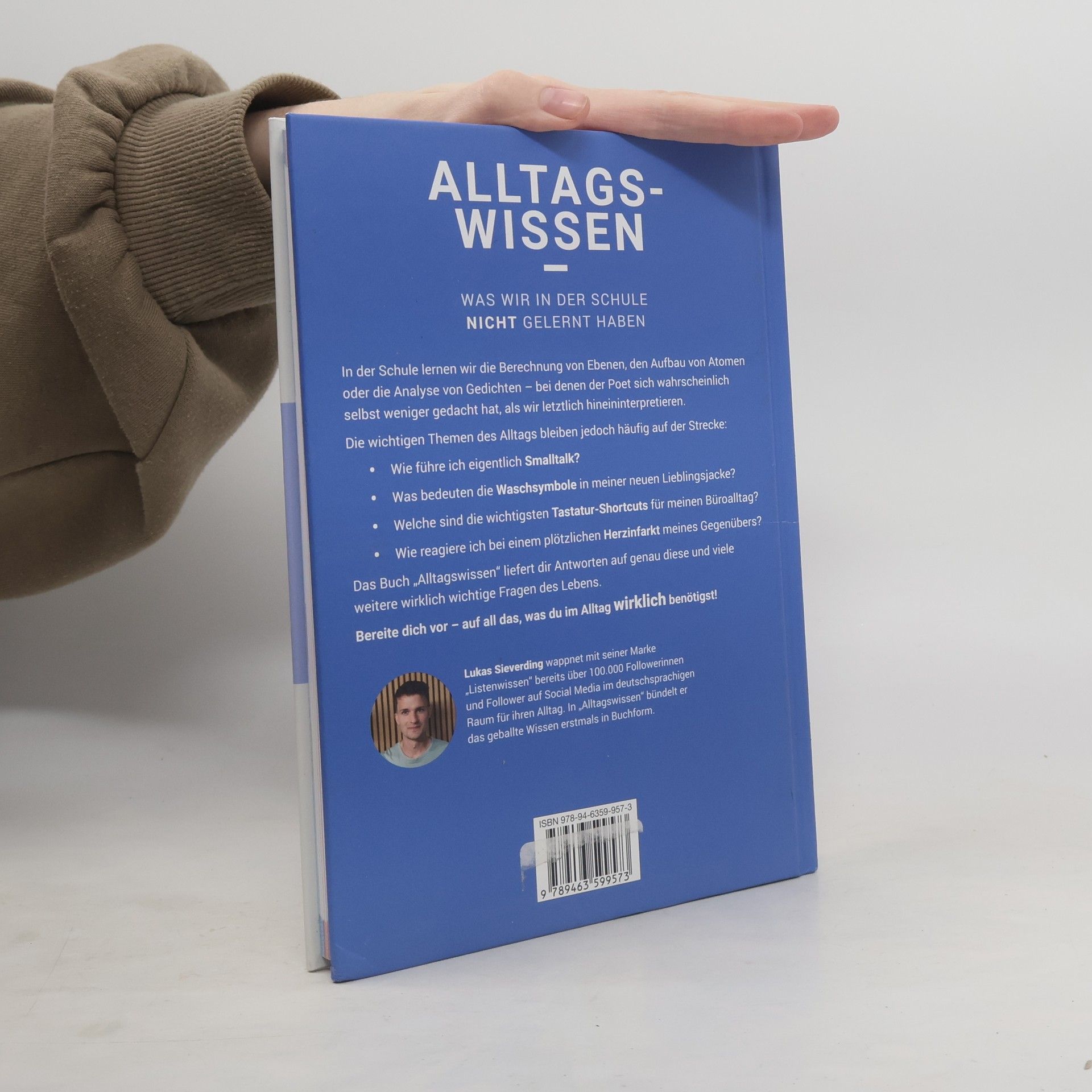 In der Schule lernen wir die Berechnung von Ebenen, den Aufbau von Atomen oder die Analyse von Gedichten – bei denen der Poet sich wahrscheinlich selbst weniger gedacht hat, als wir letztlich hineininterpretieren. Die wichtigen Themen des Alltags bleiben jedoch häufig auf der Strecke: • Wie führe ich eigentlich Smalltalk? • Was bedeuten die Waschsymbole in meiner neuen Lieblingsjacke? • Welche sind die wichtigsten Tastatur-Shortcuts für meinen Büroalltag? • Wie reagiere ich bei einem plötzlichen Herzinfarkt meines Gegenübers? Das Buch „Alltagswissen“ liefert dir Antworten auf genau diese und viele weitere wirklich wichtige Fragen des Lebens. Bereite dich vor – auf all das, was du im Alltag wirklich benötigst! Lukas Sieverding wappnet mit seiner Marke „Listenwissen“ bereits über 100.000 Followerinnen und Follower auf Social Media im deutschsprachigen Raum für ihren Alltag. In „Alltagswissen“ bündelt er das geballte Wissen erstmals in Buchform.
