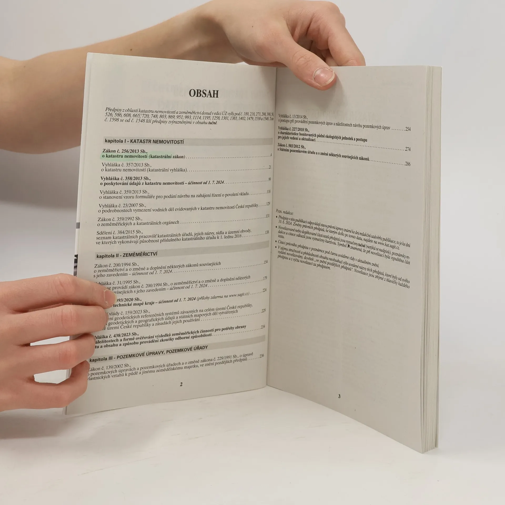 Publikace obsahuje aktuální texty celkem 15 právních předpisů, které jsou rozděleny do tří kapitol – katastr nemovitostí, zeměměřictví a pozemkové úpravy, úřady. K větším změnám dochází od 1. 7. 2024 zejména ve vyhlášce o poskytování údajů z katastru nemovitostí; dále se mění některé zeměměřické předpisy (mj. nová vyhláška o digitální technické mapě kraje); dvě novely se dotkly zákona o Státním pozemkovém úřadu. Poslední změny předpisů jsou vyznačeny tučným písmem, odkazy na související předpisy jsou plně citovány.