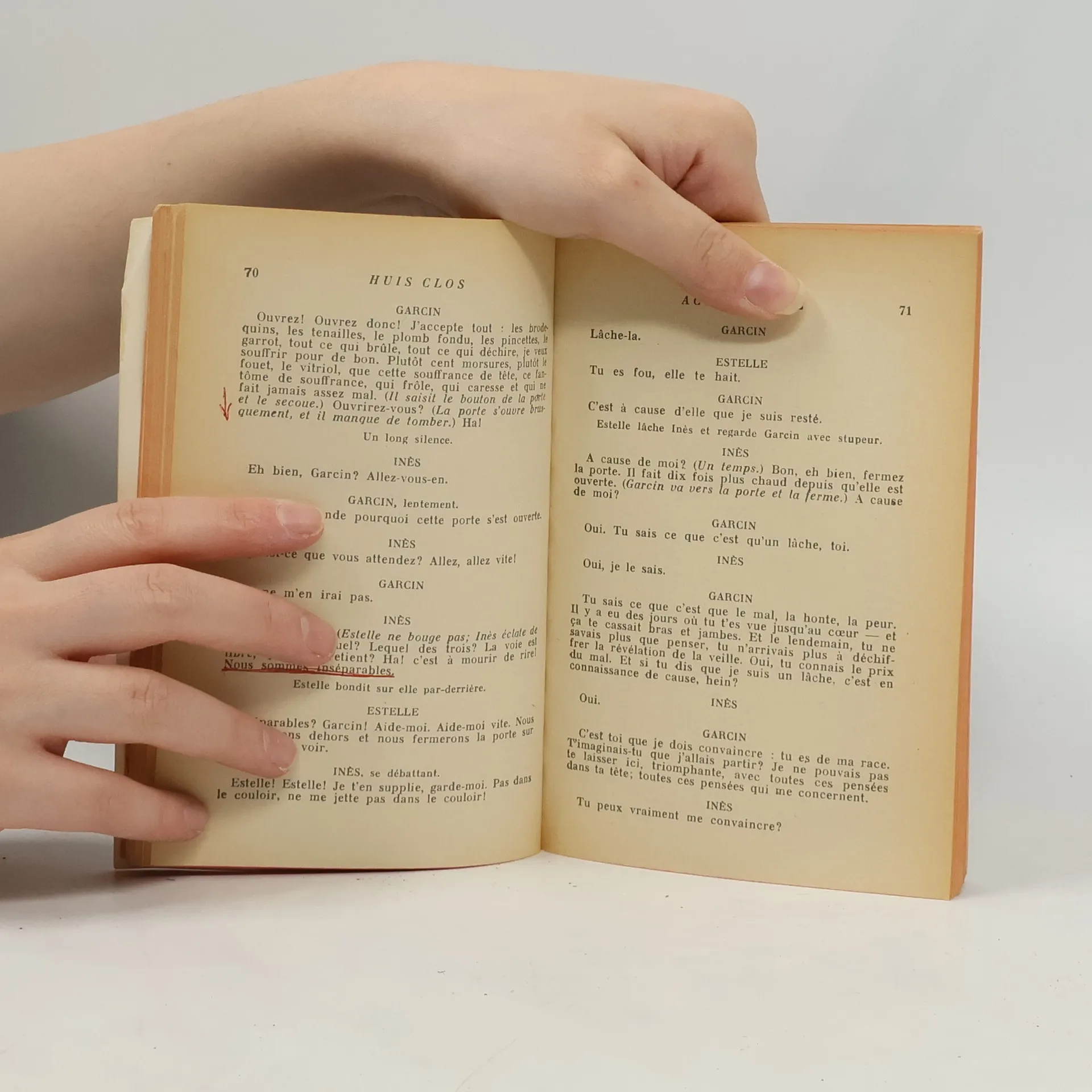 «Garcin : - Le bronze... (Il le caresse.) Eh bien, voici le moment. Le bronze est là, je le contemple et je com prends que je suis en enfer. Je vous dis que tout était prévu. Ils avaient prévu que je me tiendrais devant cette cheminée, pressant ma main sur ce bronze, avec tous ces regards sur moi. Tous ces regards qui me mangent... (Il se retourne brusquement.) Ha ! vous n'êtes que deux ? Je vous croyais beaucoup plus nombreuses. (Il rit.) Alors, c'est ça l'enfer. Je n'aurais jamais cru... Vous vous rappelez : le soufre, le bûcher, le gril... Ah ! quelle plaisanterie. Pas besoin de gril : l'enfer, c'est les Autres.»
