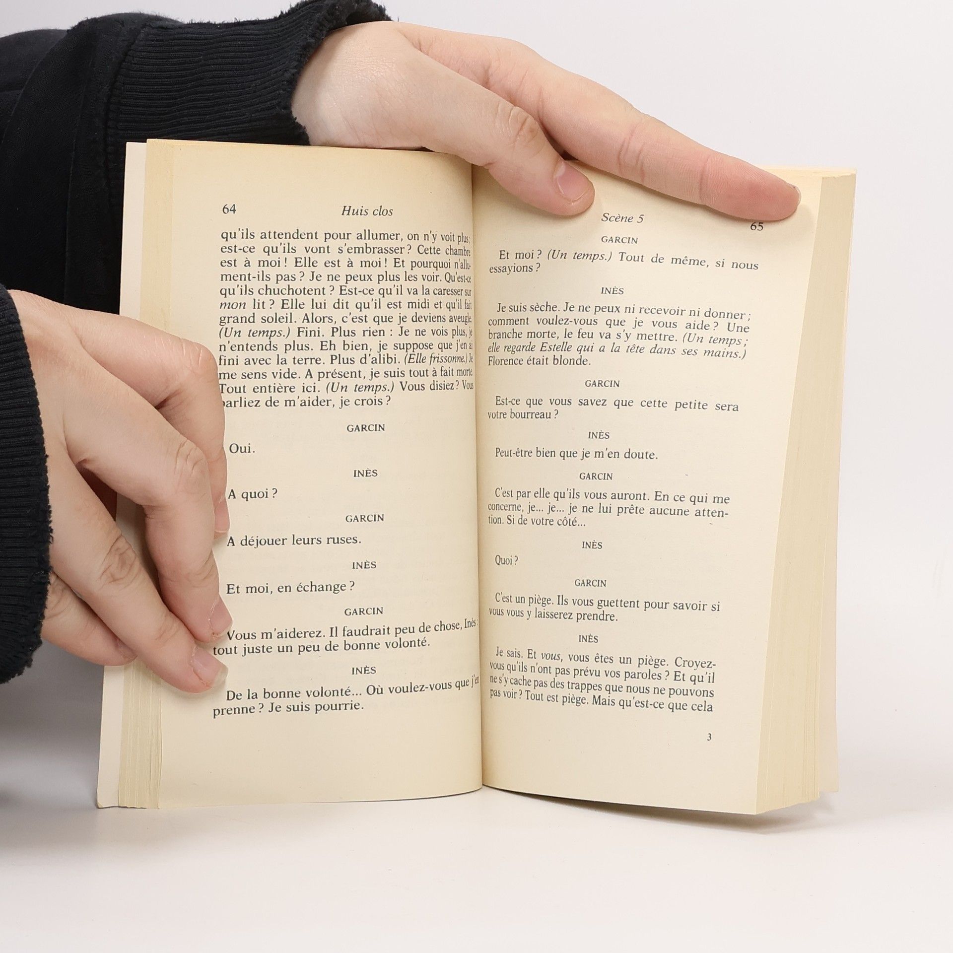 «Garcin : - Le bronze... (Il le caresse.) Eh bien, voici le moment. Le bronze est là, je le contemple et je com prends que je suis en enfer. Je vous dis que tout était prévu. Ils avaient prévu que je me tiendrais devant cette cheminée, pressant ma main sur ce bronze, avec tous ces regards sur moi. Tous ces regards qui me mangent... (Il se retourne brusquement.) Ha ! vous n'êtes que deux ? Je vous croyais beaucoup plus nombreuses. (Il rit.) Alors, c'est ça l'enfer. Je n'aurais jamais cru... Vous vous rappelez : le soufre, le bûcher, le gril... Ah ! quelle plaisanterie. Pas besoin de gril : l'enfer, c'est les Autres.»