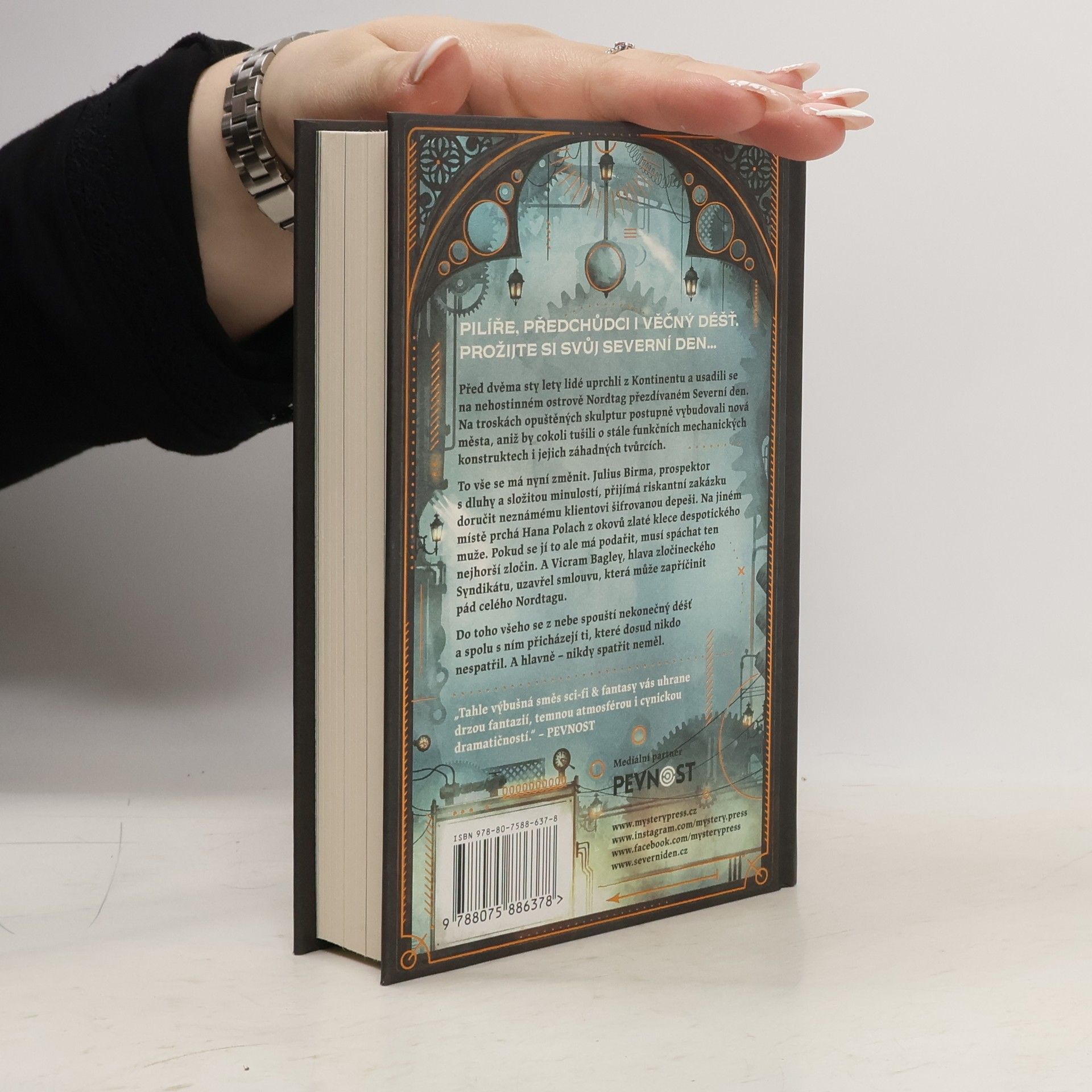 PILÍŘE, PŘEDCHŮDCI I VĚČNÝ DÉŠŤ. PROŽIJTE SI SVŮJ SEVERNÍ DEN… Před dvěma sty lety lidé uprchli z Kontinentu a usadili se na nehostinném ostrově Nordtag přezdívaném Severní den. Na troskách opuštěných skulptur postupně vybudovali nová města, aniž by cokoli tušili o stále funkčních mechanických konstruktech i jejich záhadných tvůrcích. To vše se má nyní změnit. Julius Birma, prospektor s dluhy a složitou minulostí, přijímá riskantní zakázku doručit neznámému klientovi šifrovanou depeši. Na jiném místě prchá Hana Polach z okovů zlaté klece despotického muže. Pokud se jí to ale má podařit, musí spáchat ten nejhorší zločin. A Vicram Bagley, hlava zločineckého Syndikátu, uzavřel smlouvu, která může zapříčinit pád celého Nordtagu. Do toho všeho se z nebe spouští nekonečný déšť a spolu s ním přicházejí ti, které dosud nikdo nespatřil. A hlavně – nikdy spatřit neměl. „Tahle výbušná směs sci-fi & fantasy vás uhrane drzou fantazií, temnou atmosférou i cynickou dramatičností.“ – PEVNOST