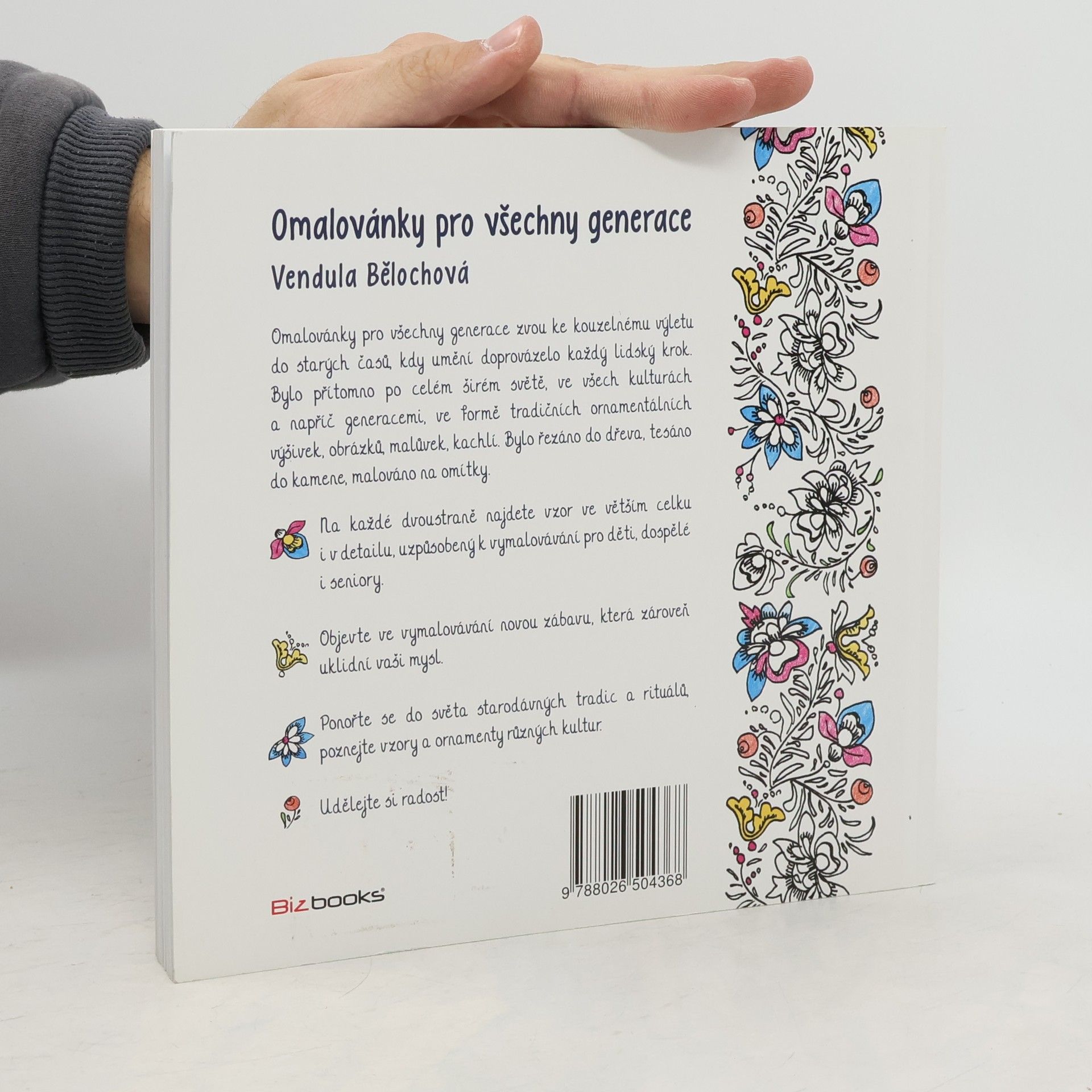 "Vypněte na chvíli vaši mysl a ponořte se do starodávného kouzelného světa tradiční lidové tvořivosti!" Omalovánky pro všechny generace zvou ke kouzelnému výletu do starých časů, kdy umění doprovázelo každý lidský krok. Na každé dvoustraně najdete vzor ve větším celku i v detailu, uzpůsobený k vymalovávání pro děti, dospělé i seniory. - Objevte ve vymalovávání novou zábavu, která zároveň uklidní vaši mysl - Ponořte se do světa starodávných tradic a rituálů, poznejte vzory a ornamenty různých kultur - Udělejte si radost!
