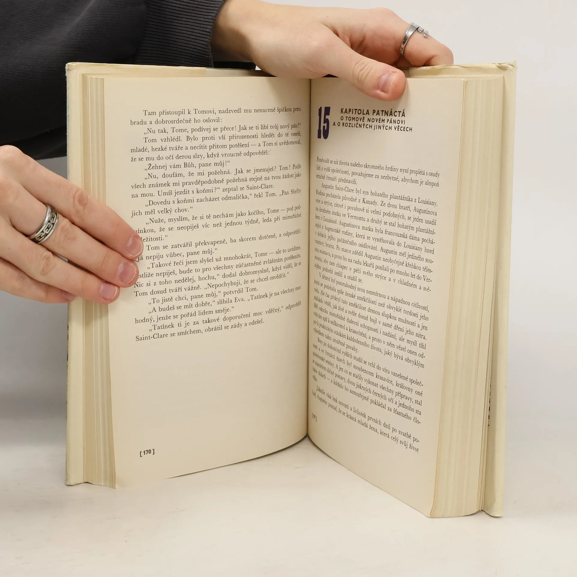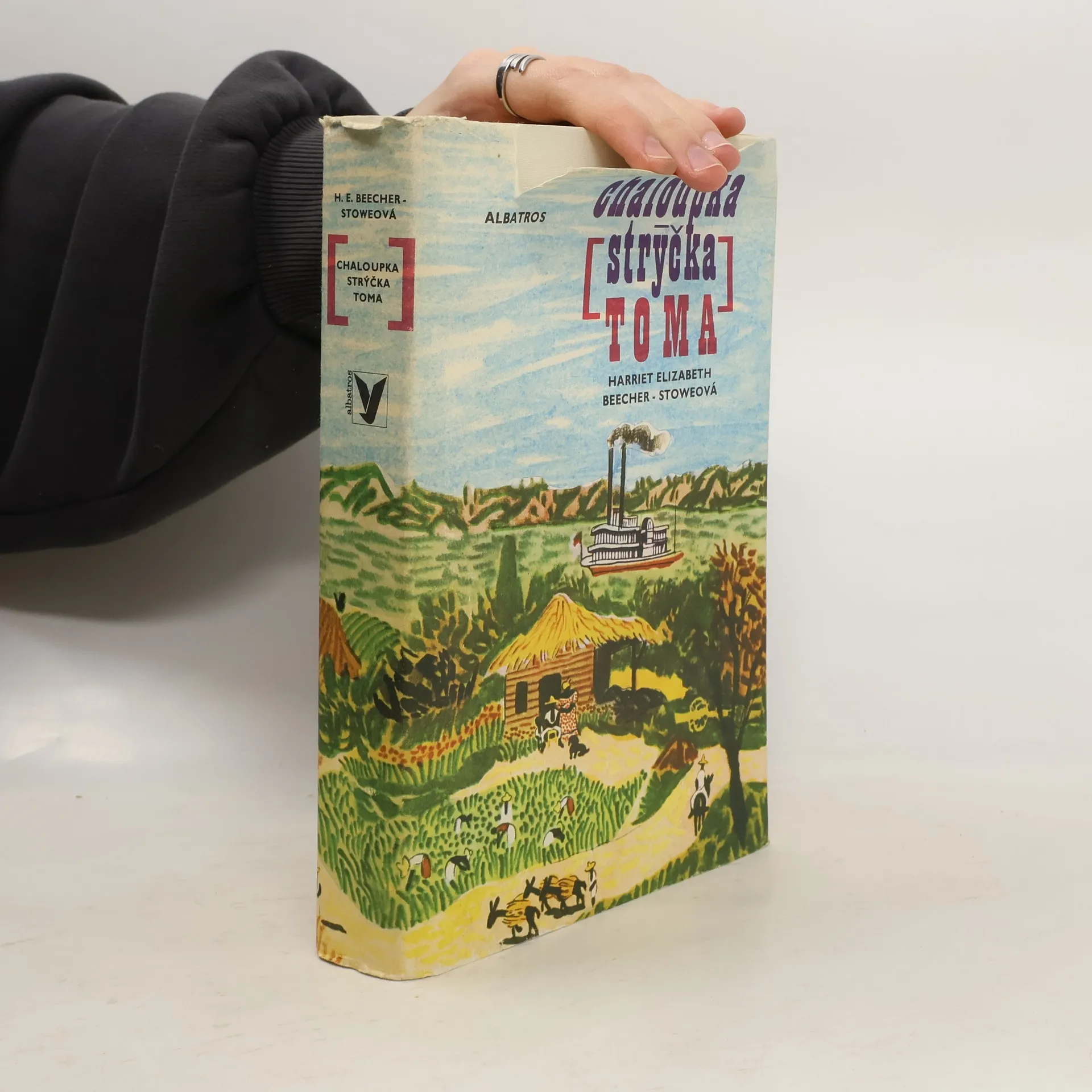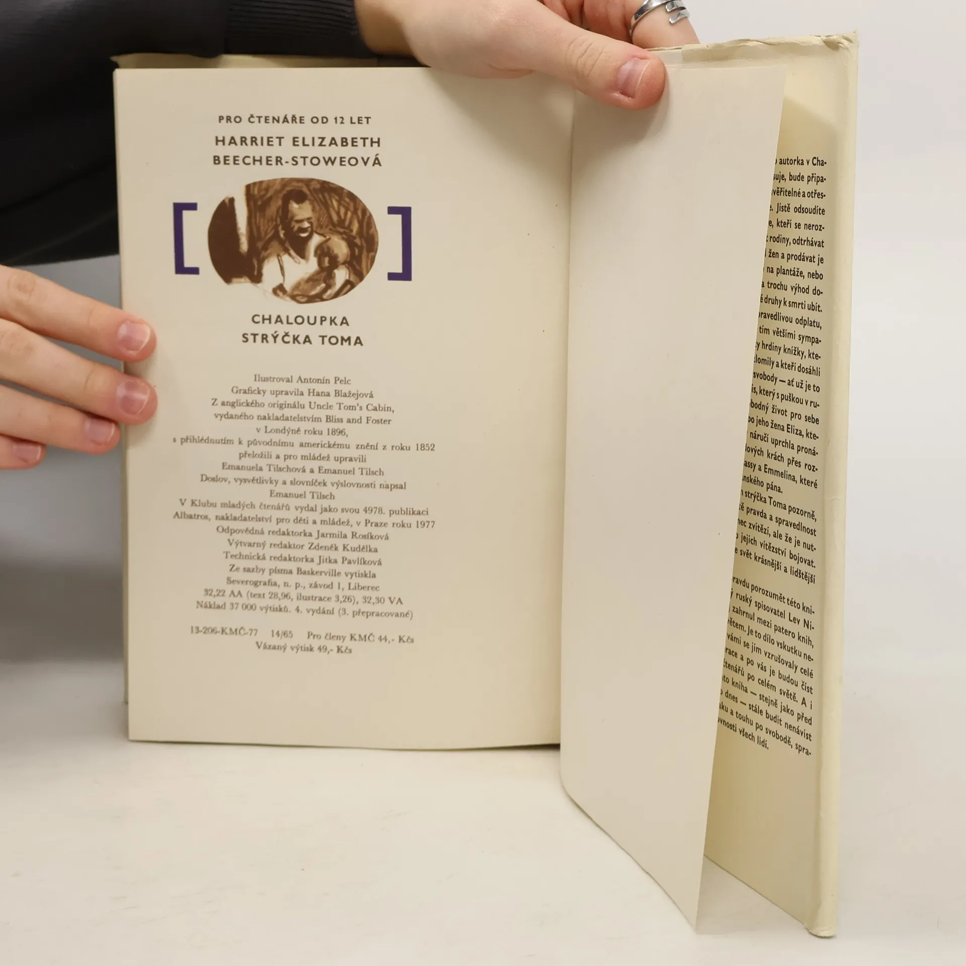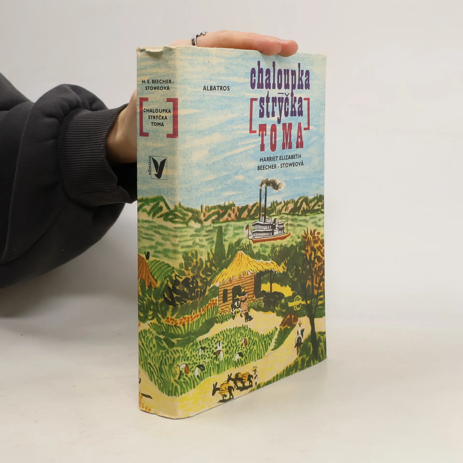 Známý román, jehož děj se odehrává kolem r. 1850 na Jihu Spojených států amerických, vypráví o krutosti otrokářství, ale také o odvaze těch, kteří se snažili tento nelidský systém změnit. Pan Shelby je vážený a poměrně zámožný muž, ale vlastní vinou se dostane do dluhů. Jeho směnka se dostane do rukou otrokáři, který chce situaci vyřešit koupí některých Shelbyho otroků. Vybere si nejcennějšího otroka Toma a malého Harryho, syna manželčiny komorné Elizy. Tom situaci přijímá trpně, protože chápe, že když to nebude on, bude to někdo jiný. Eliza se ale svého dítěte odmítá vzdát a v noci uprchne. Tak se román rozvětvuje na dvě dějové linie. Cestu Elizy a dalších otroků za svobodou a cestu Toma, který s dalšími podobně postiženými čeká, kdo se staně jeho novým pánem. Ilustroval Antonín Pelc.