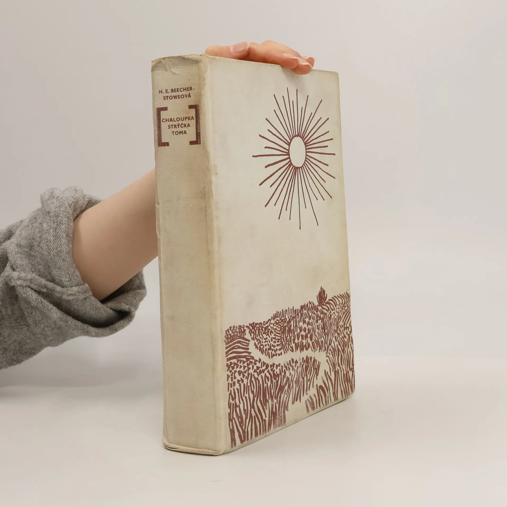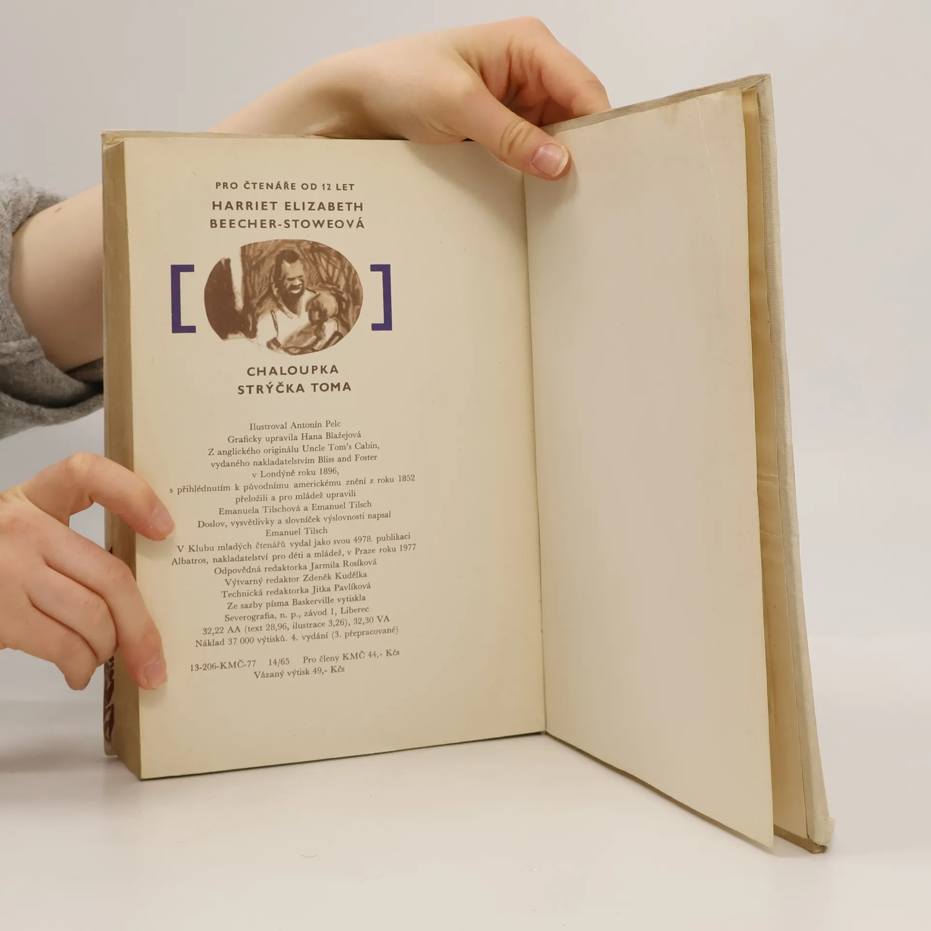Známý román, jehož děj se odehrává kolem r. 1850 na Jihu Spojených států amerických, vypráví o krutosti otrokářství, ale také o odvaze těch, kteří se snažili tento nelidský systém změnit. Pan Shelby je vážený a poměrně zámožný muž, ale vlastní vinou se dostane do dluhů. Jeho směnka se dostane do rukou otrokáři, který chce situaci vyřešit koupí některých Shelbyho otroků. Vybere si nejcennějšího otroka Toma a malého Harryho, syna manželčiny komorné Elizy. Tom situaci přijímá trpně, protože chápe, že když to nebude on, bude to někdo jiný. Eliza se ale svého dítěte odmítá vzdát a v noci uprchne. Tak se román rozvětvuje na dvě dějové linie. Cestu Elizy a dalších otroků za svobodou a cestu Toma, který s dalšími podobně postiženými čeká, kdo se staně jeho novým pánem. Ilustroval Antonín Pelc.