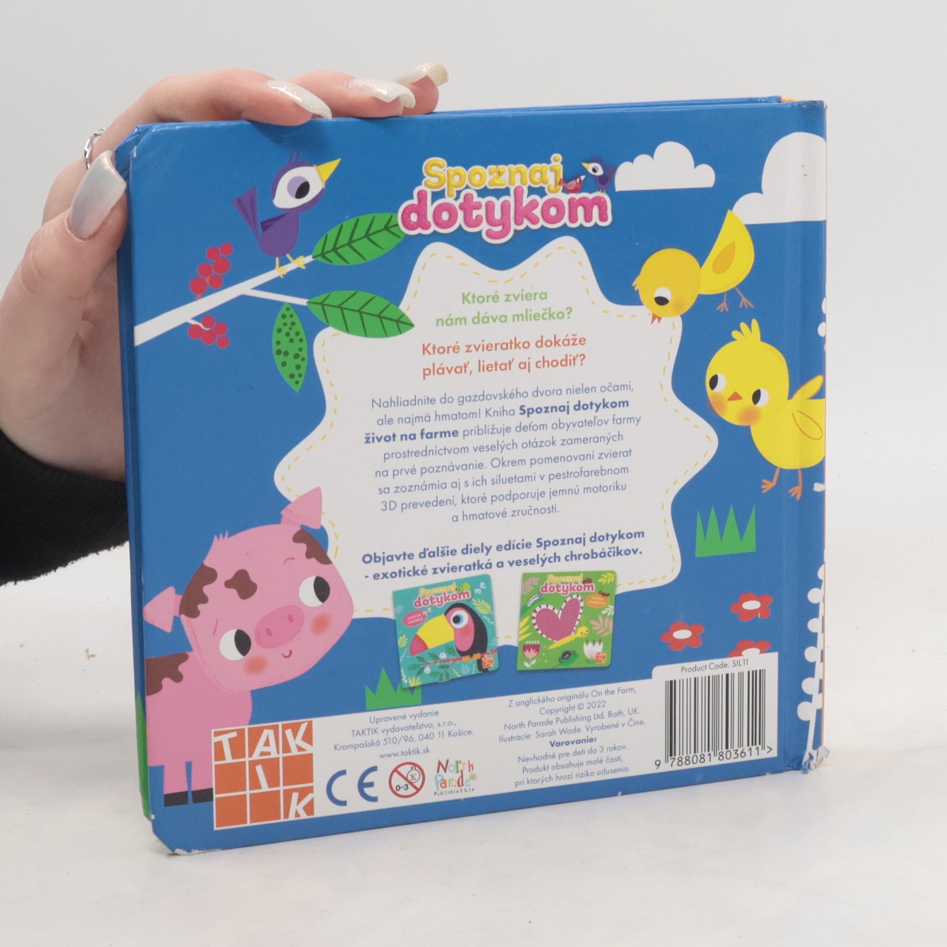 Ktoré zvieratko nám dáva mliečko? A ktoré je schopné plávať, lietať aj chodiť? A ktorý obyvateľ farmy zobúdza ostatných? Nahliadnite do gazdovského dvora nielen očami, ale aj hmatom. Kniha Spoznaj dotykom život na farme približuje deťom obyvateľov farmy prostredníctvom veselých otázok zameraných na prvé poznávanie. Okrem pomenovaní zvierat sa zoznámia aj s ich siluetami v pestrofarebnom 3D prevedení, ktoré podporuje jemnú motoriku a hmatové zručnosti. Práve hmat je u detí prostriedkom spoznávania nových vecí. Aj vaše deti zbožňujú spoznávanie zvierat a chcu pohladiť kohútika, kačičku či kravičku? Knižku Spoznaj dotykom si určite obľúbia. Výrezy s hmatovými prvkami stimulujú a rozvíjajú ich zmysly. Kniha je vhodná pre deti od 3 rokov.
