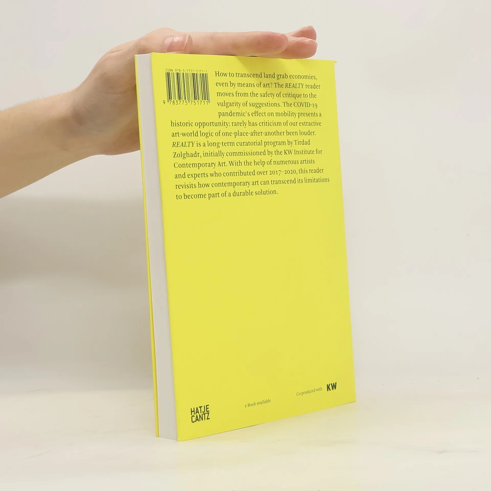 How to transcend land grab economies, even by means of art? The reader REALTY moves from the safety of critique to the vulgarity of suggestions. The pandemic?s effect on mobility presents a historic opportunity. Rarely has criticism of our extractive artworld logic of one-place-after-another been louder. REALTY is a long-term curatorial program by Tirdad Zolghadr (*1973), initially commissioned by the KW Institute for Contemporary Art. With the help of numerous artists and experts who contributed over 2017?2020, this reader revisits how contemporary art can contribute to decisive conversations on urbanism.00TIRDAD ZOLGHADR (*1973) is a curator and writer. He is currently artistic director of the Sommerakademie Paul Klee. Curatorial work over the last two decades includes biennial settings as well as long-term, research-driven efforts, most recently as associate curator at KW Institute for Contemporary Art Berlin, 2016-20