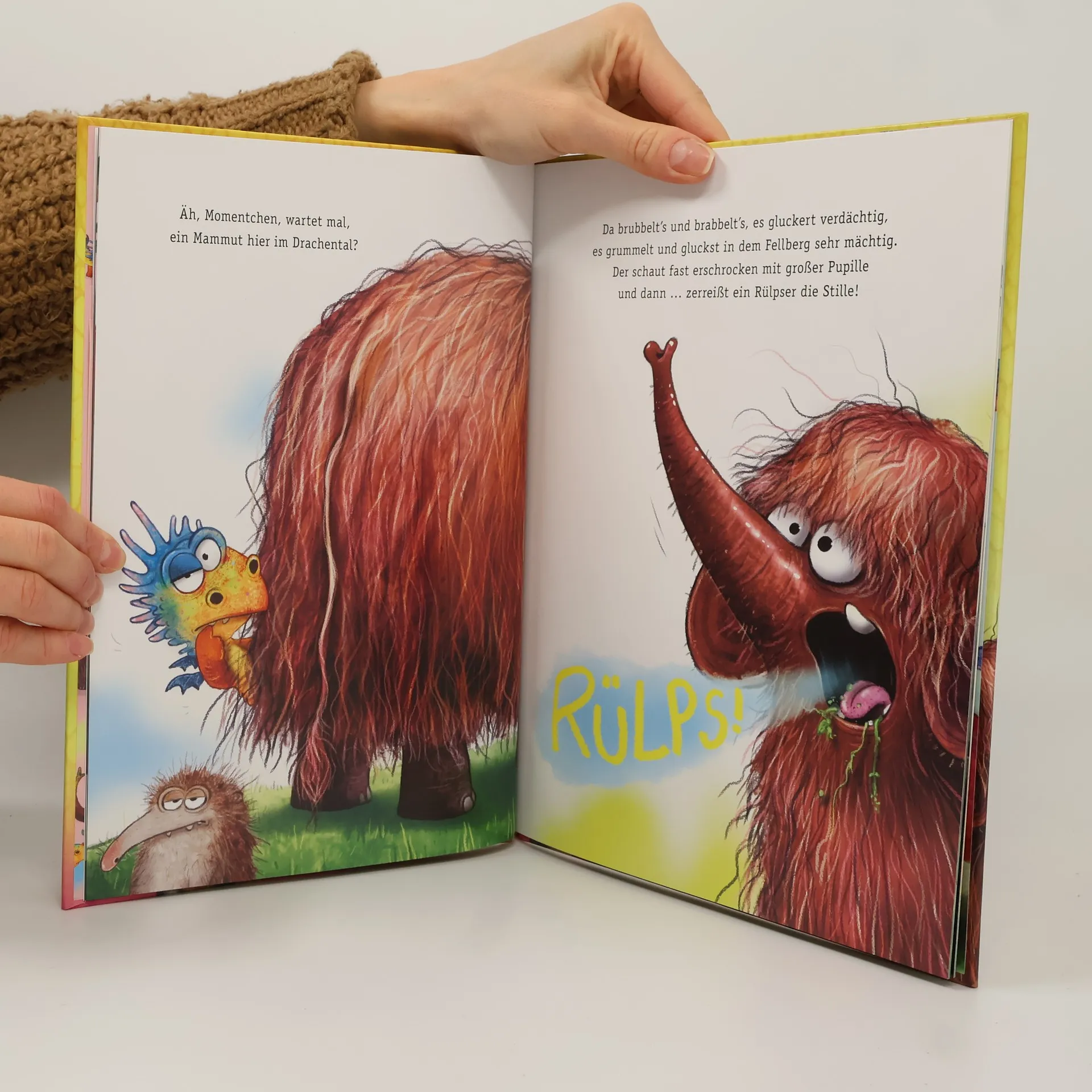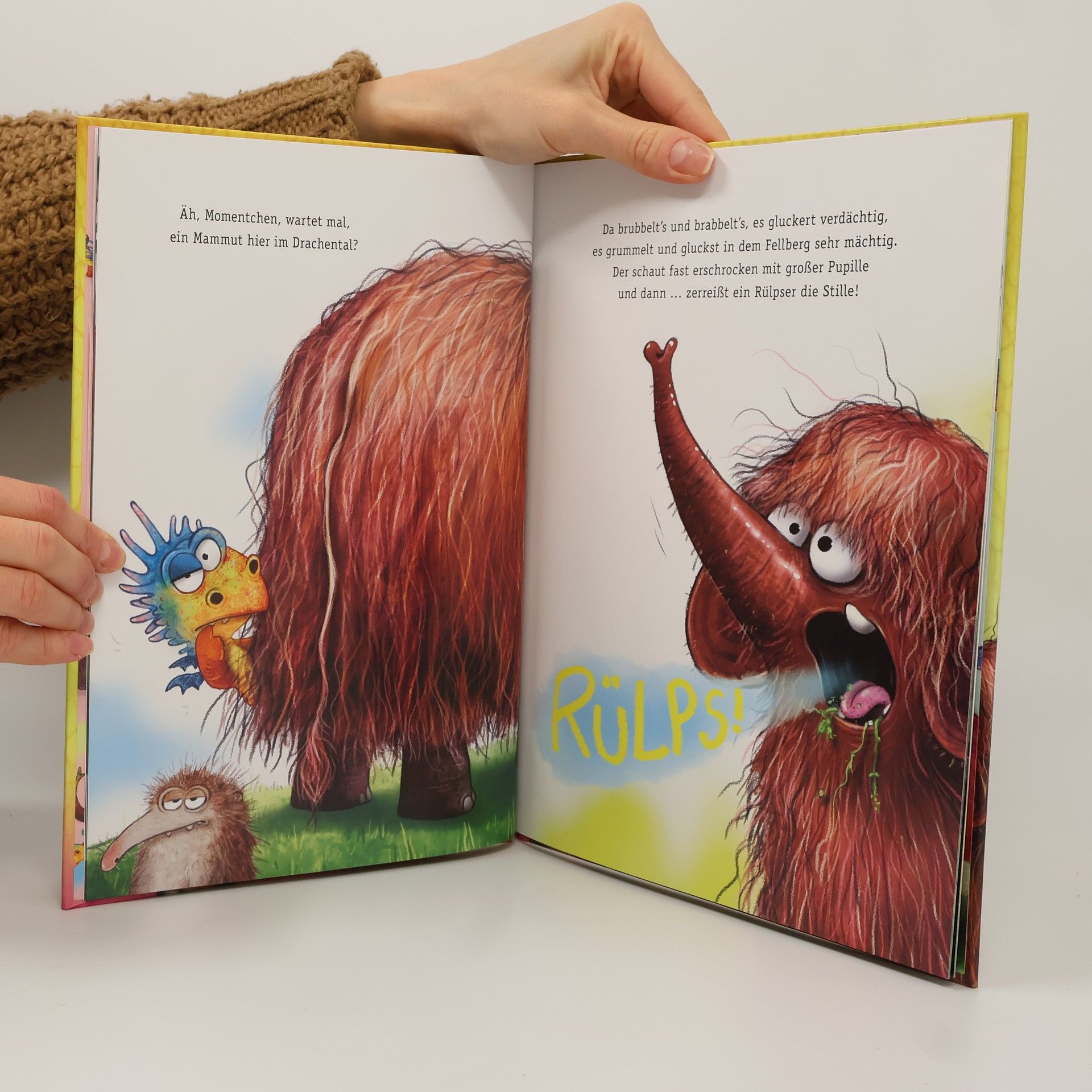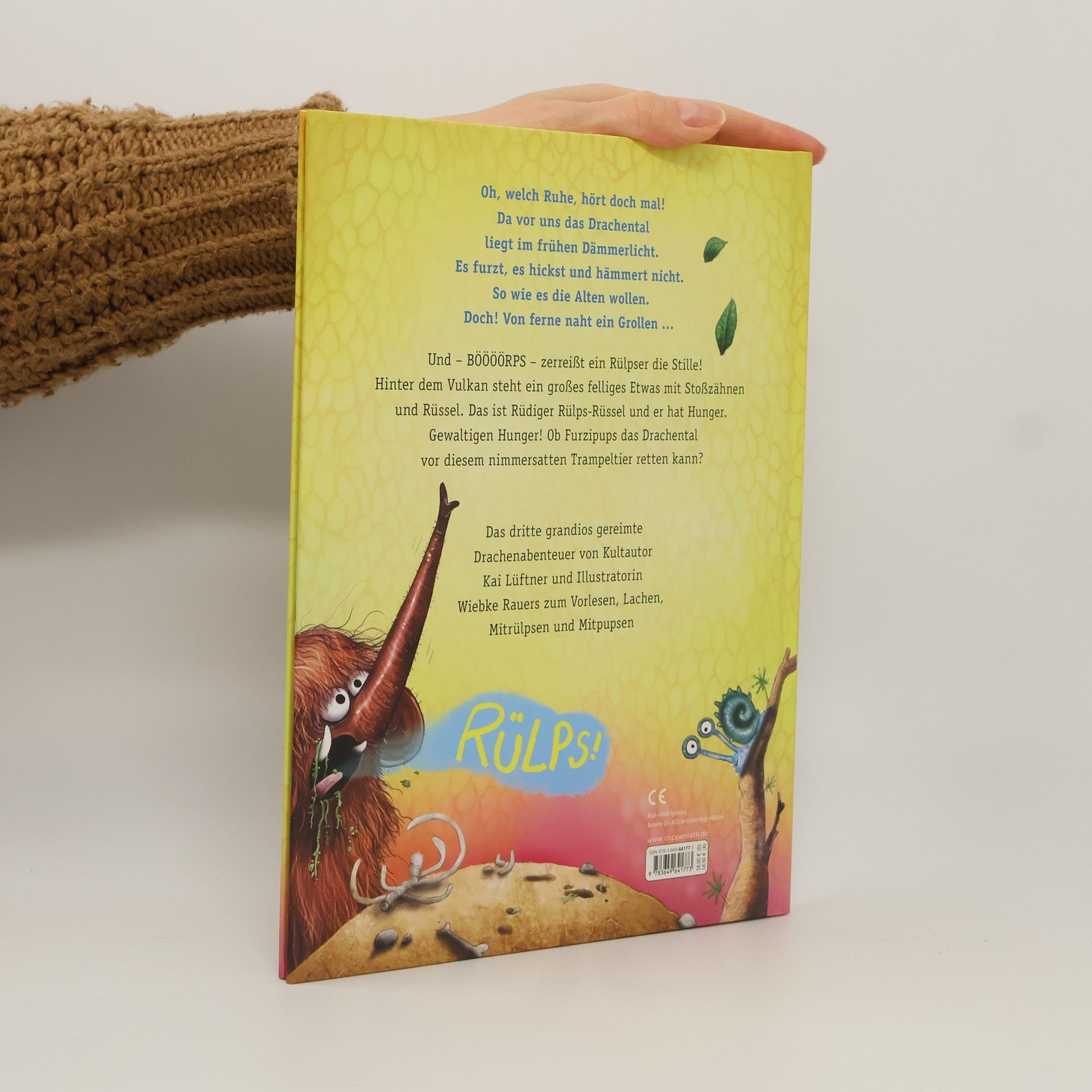 Endlich, der dritte interaktive Vorlesespaß mit Knatterdrache Furzipups ist da – zum Mitpupsen, Mithicksen, Mitrülpsen und Mitlachen. Grandios gereimt von Kai Lüftner und herrlich in Szene gesetzt von Wiebke Rauers. Oh, welch Ruhe, hört doch mal! Da vor uns das Drachental liegt im frühen Dämmerlicht. Es furzt, es hickst und hämmert nicht. So wie es die Alten wollen. Doch! Von Ferne naht ein Grollen … Und – BÖÖÖÖRPS!!! – zerreißt ein Rülpser die Stille. Hinter dem Vulkan steht ein großes felliges Etwas mit Stoßzähnen. Das ist Rüdiger Rülps-Rüssel und er hat Hunger. Gewaltigen Hunger! Ob Furzipups das Drachental vor diesem nimmersatten Trampeltier retten kann?