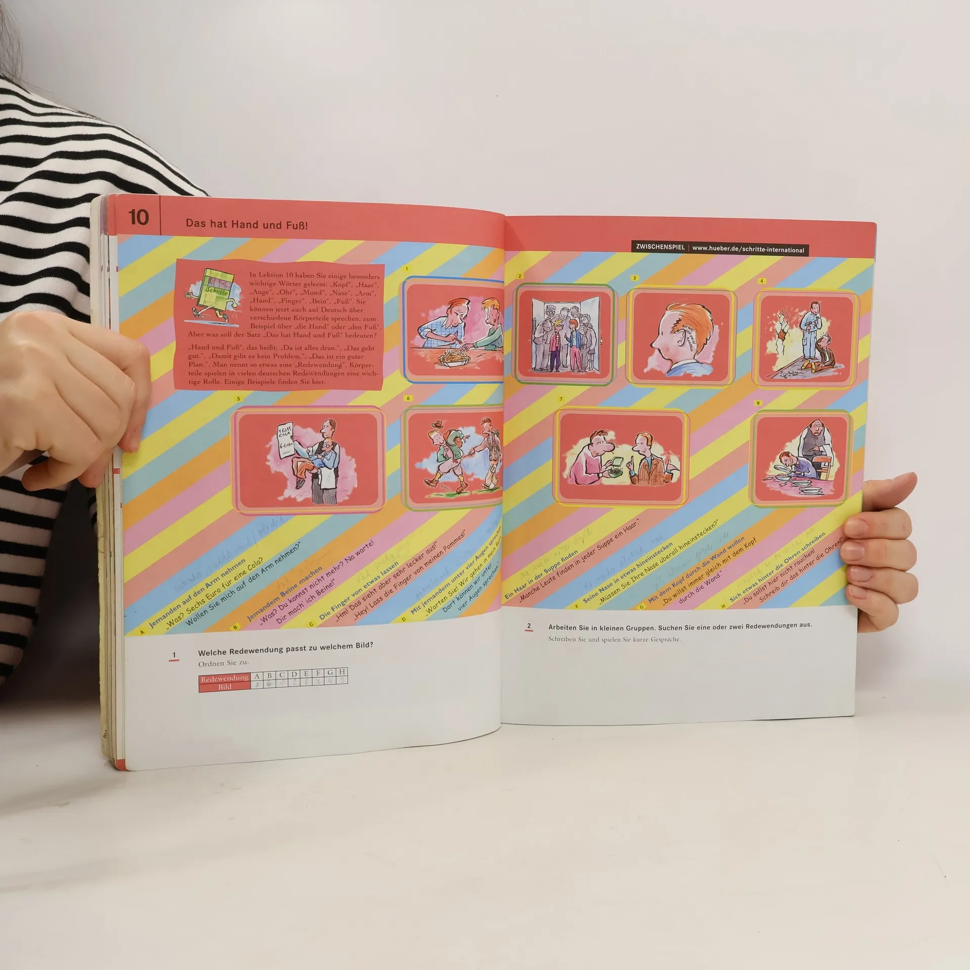 Zielniveau A1.2, Zielgruppe: Erwachsene und Jugendliche ab 16 Jahren in Grundstufenkursen (A1 bis B1) weltweit. Lernziel: Vorbereitung auf die Prüfung Start Deutsch 1. Konzeption: Jede Lektion beginnt mit einer unterhaltsamen Foto-Hörgeschichte und behandelt interessante Themen, fröhliche Geschichten sowie Landeskunde. Schritte international 2 ermöglicht Binnendifferenzierung, um auf unterschiedliche Bedürfnisse der Lerngruppen einzugehen. Der transparente Aufbau und die klaren Lernschritte in den kurzen Lektionen erleichtern das Lernen und Unterrichten. Zwischenspiele fördern den spielerischen Umgang mit interkulturellen Lese- und Hörtexten. Die Sprachhandlungen, Grammatik und Wortschatz entsprechen den Vorgaben des Europäischen Referenzrahmens. Das integrierte Arbeitsbuch bietet Übungen und Aufgaben zu allen Seiten im Kursbuch in verschiedenen Schwierigkeitsstufen, ein ausführliches Phonetikprogramm, ein Lerntagebuch mit Lernstrategien, Lernwortschatzseiten, Schreibtraining, Aufgaben zur Selbstevaluation, eine komplette Grammatikübersicht sowie Wiederholungsübungen und -stationen.
