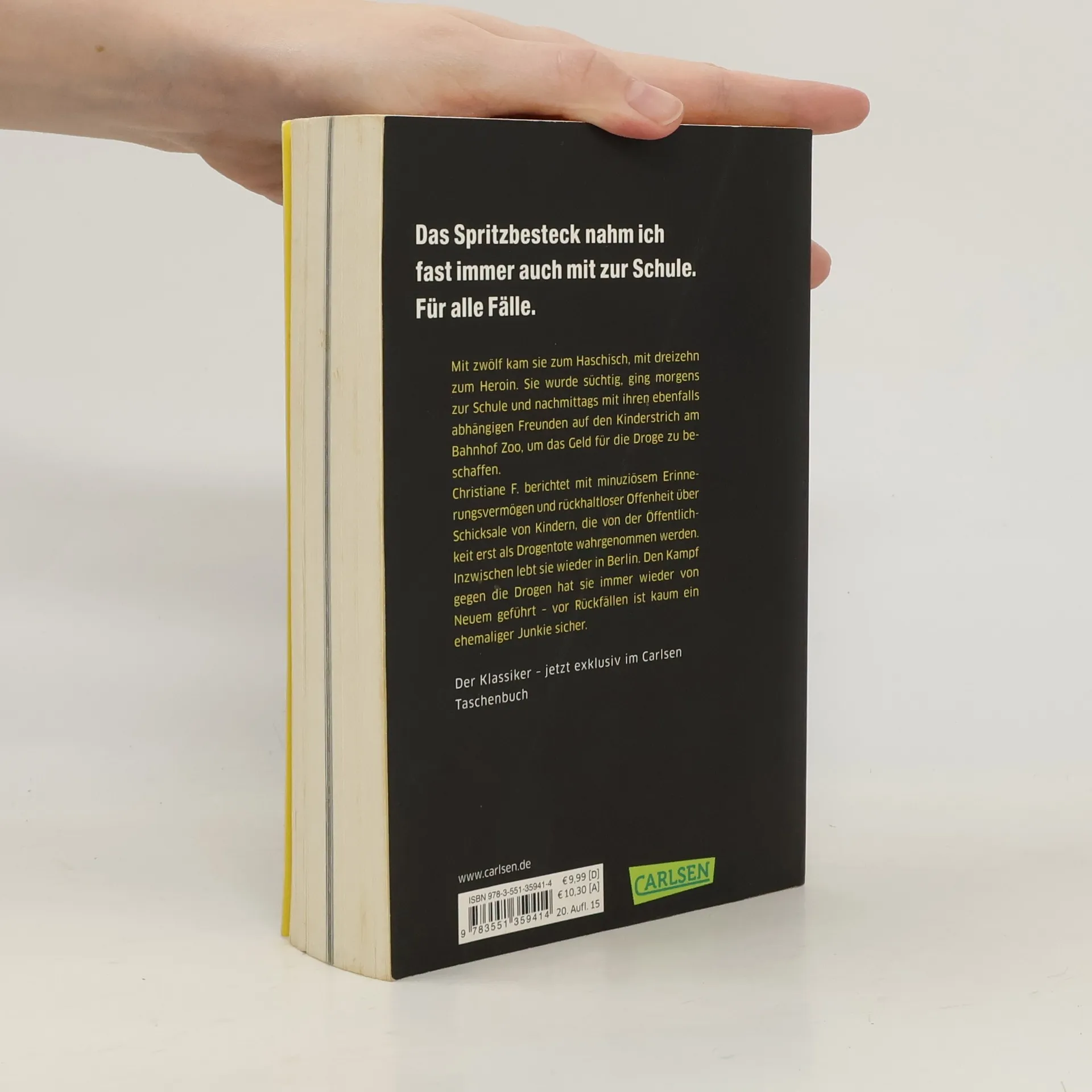 Im Alter von zwölf Jahren kommt Christiane F. in einem Jugendheim zum Haschisch, kurz darauf in einer Diskothek zum Heroin. Sie wird süchtig, geht vormittags zur Schule und nachmittags mit ihren ebenfalls heroinabhängigen Freunden auf den Kinderstrich am Bahnhof Zoo. Die Berlinerin Christiane F. erzählt mit minuziösem Erinnerungsvermögen und rückhaltloser Offenheit ihre traurige Geschichte. Ein Buch, das in den 70er Jahren Deutschland erschütterte - und bis heute nichts von seiner Aktualität eingebüßt hat.