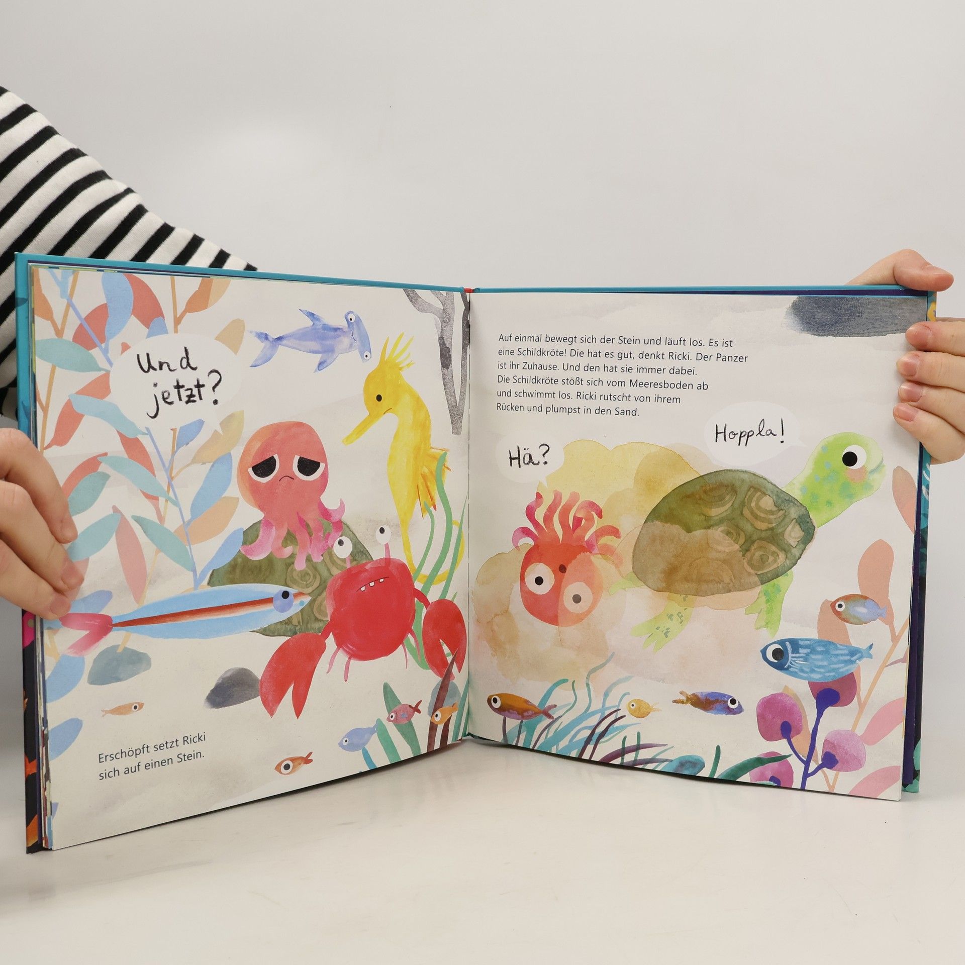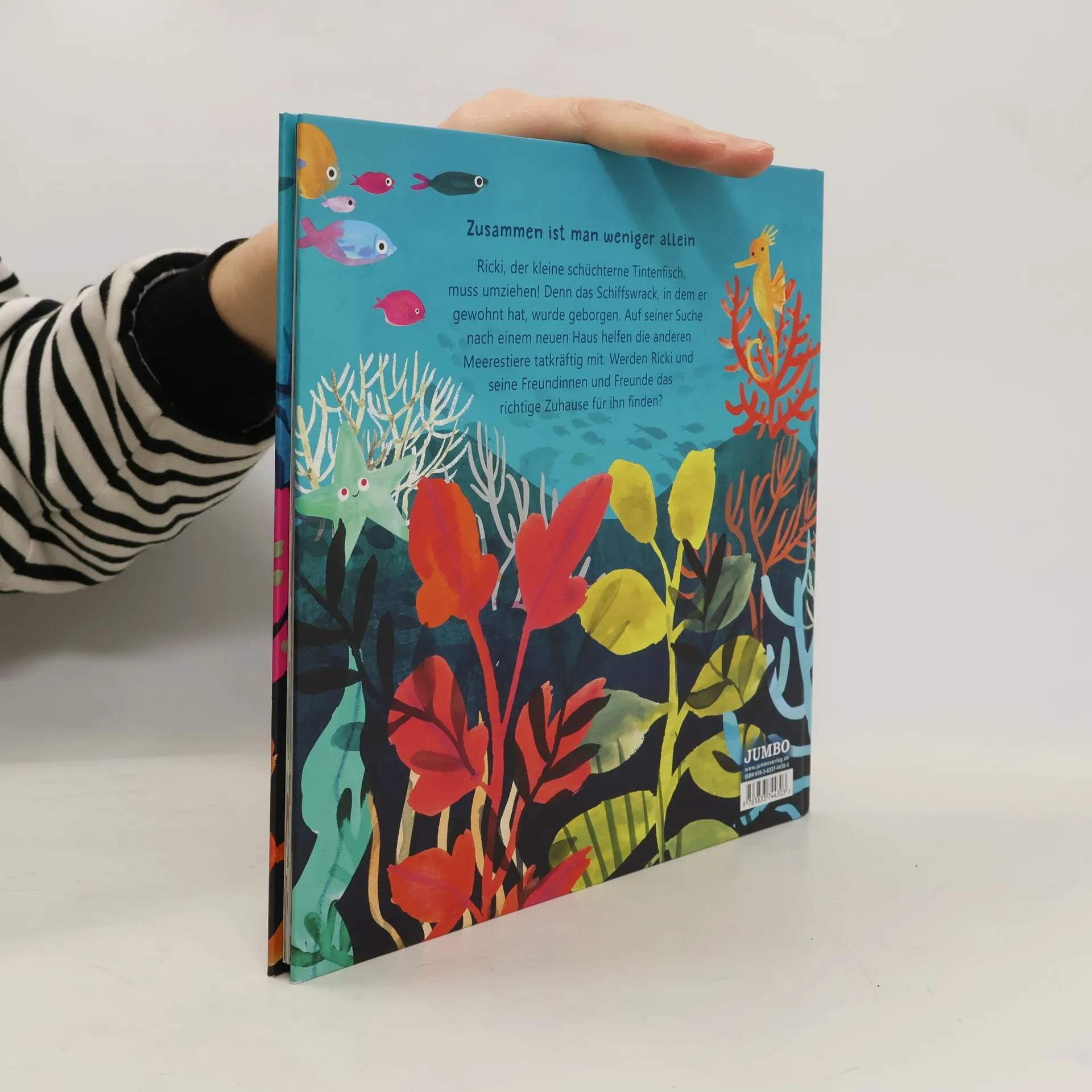 Ricki, der kleine schüchterne Tintenfisch, muss umziehen! Denn das Schiffswrack, in dem er gewohnt hat, wurde geborgen. Er begibt sich auf die Suche nach einer neuen Bleibe, und seine Freund*innen helfen tatkräftig mit. Ob Ricki wohl einen Platz in der Höhle bei der Muräne findet? Oder wie das Seepferdchen in der Seegraswiese wohnen kann? So richtig scheint das alles nicht zu Ricki zu passen - hätte er nur solch ein tolles Haus wie die Schildkröte, die ihren Panzer immer dabei hat! Doch Ricki und seine Freund*innen geben nicht auf, bis sie ein passendes Zuhause für ihn gefunden haben. Nach Ricki in der Tintenwolke folgt mit Ricki zieht um ein neues Bilderbuch des Autorinnentrios Hanna Müller, Hannah Stollmayer und Carla Swiderski rund um die Themen Schüchternheit, Freundschaft, Zusammenhalt und Umzug. Der Illustrator Adolfo Serra weckt mit farbenfrohen Bildern die kunterbunte Unterwasserwelt des kleinen Tintenfischs zum Leben. Empfohlen für Kinder ab drei Jahren.