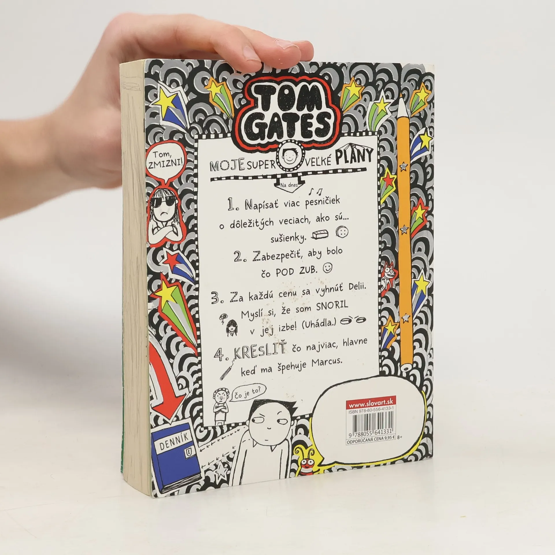 Tom Gates má dokonalé plány! Chce napísať viac pesničiek o dôležitých veciach, ako sú sušienky, a zabezpečiť, aby bolo čo POD ZUB. Za každú cenu sa musí vyhnúť Delii. Myslí si totiž, že SNORIL v jej izbe! A navyše by mal čo najviac kresliť, hlavne ak ho práve špehuje Marcus. Tak čo myslíte? Podarí sa mu svoje plány dodržať?