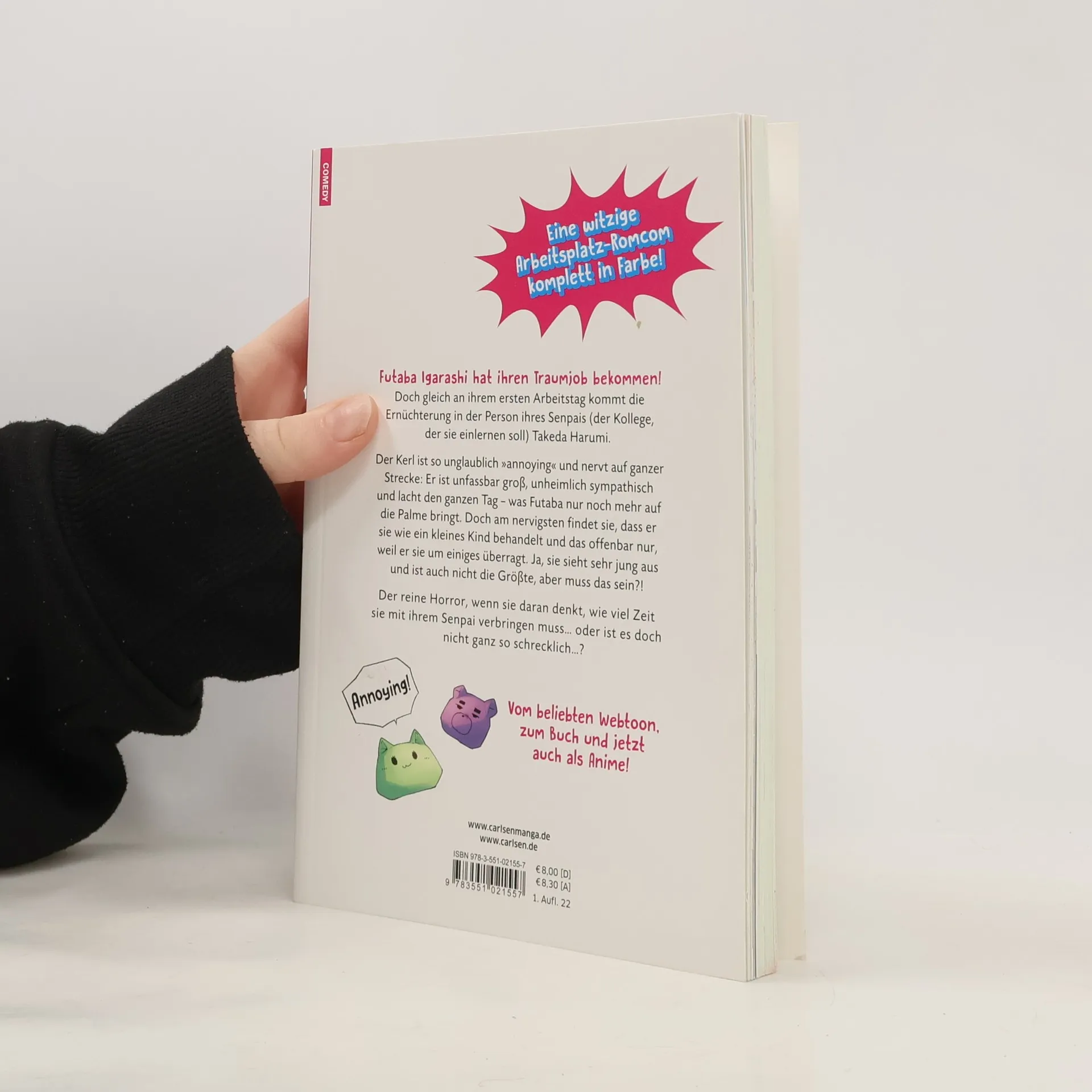 Eine witzige Arbeitsplatz-Romcom komplett in Farbe! Der neue Job von Futaba wäre echt mega, wäre da nicht ihr Senpai, der so unglaublich ‚annoying‘ ist! Harumi nervt auf ganzer Strecke: Er ist unfassbar groß, unheimlich sympathisch und lacht den ganzen Tag – was Futaba nur noch mehr auf die Palme bringt. Doch am nervigsten findet sie, dass er sich wie ein kleines Kind behandelt und das offenbar nur, weil er sie um einiges überragt. Ja, ist sieht sehr jung aus und ist auch nicht die Größte, aber muss das sein?! Der reine Horror, wenn sie daran denkt, wie viel Zeit sie mit ihrem Senpai verbringen muss... oder ist es doch nicht ganz so schrecklich...? Weitere Infos: - Beliebter Webtoon, komplett in Farbe - Anime gestartet - Episodenhaft wird der typischer Arbeitsalltag in japanischen Unternehmen erzählt - Extrem witzig - Ab 14 Jahren - Für Mädchen, Jungs und alle Geschlechter