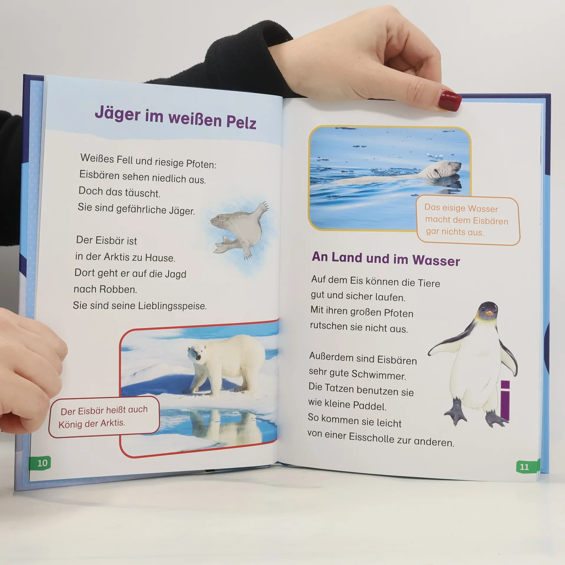 Willkommen in der eisigen Welt der Polargebiete! Hier leben Jäger im weißen Pelz und Vögel im An-zug, Wale kommen auf ihrer Reise vorbei und gut getarnte Raubtiere lauern im Schnee. In diesem Buch der Lesestufe 1 begleitet der niedliche Charakter Polli Pinguin die Leseanfänger und weckt ihre Neugier auf den Lebensraum von Eisbären, Robben, Polarfüchsen & Co. Große Fibelschrift, einfacher Wortschatz und sehr kurze Zeilen erleichtern dabei den Start in die Welt des Lesens. Viele tolle Fotos helfen beim Textverständnis. Mit einem Lesequiz am Ende jedes Kapitels können die Kinder selbst überprüfen, was sie schon alles wissen. Das Buch unterstützt Leseanfänger, auf unterhaltsame Art mit Sachtexten Lesen zu lernen.