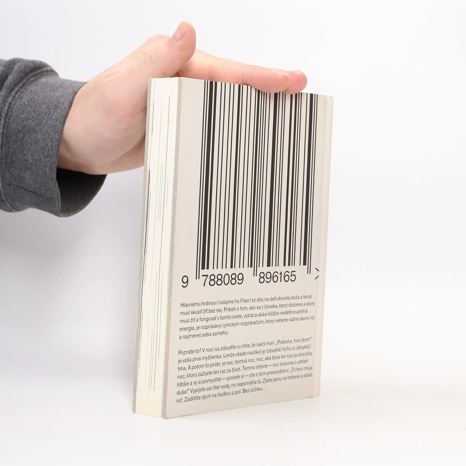Hlavnému hrdinovi, ktorého môžeme nazvať Fišer, sa zrazu zhorí duša a musí sa naučiť žiť bez nej. Absurdno-realistický román zachytáva proces, ako sa z človeka, ktorý dozrieva, vytráca nedefinovateľná energia. Rozprávač, cynický a ironický, neberie vážne takmer nič, vrátane seba. Fišer sa prebúdza v noci s pocitom, že niečo horí, a jeho myšlienky sa zmieňujú o temnej noci, ktorá symbolizuje hlboké vnútorné pocity. Pokusy o úľavu, ako pitie vody či zadržiavanie dychu, sú neúspešné. V súčasnosti je ťažké nájsť zrkadlo, v ktorom by sa odrážala história ľudstva, a nie len jeho tvár. Fišer sa zamýšľa nad fastfoodom a jeho vplyvom na život, pričom sa snaží uniknúť do minulosti. Cíti sa vzdialený od domova, ktorý sa zdá byť stále ďalej. Rozhoduje sa sadnúť si na lavičku a čakať na zmenu, zatiaľ čo sa zamýšľa nad predpokladateľnosťou ľudí okolo seba. Keď počuje hlas Ilony, jeho známej, očakáva zranenie, no ona sa ukáže ako nečakaná zbraň. Stojí pred ním s divokými očami, a tak sa začína nový zvrat v jeho príbehu.