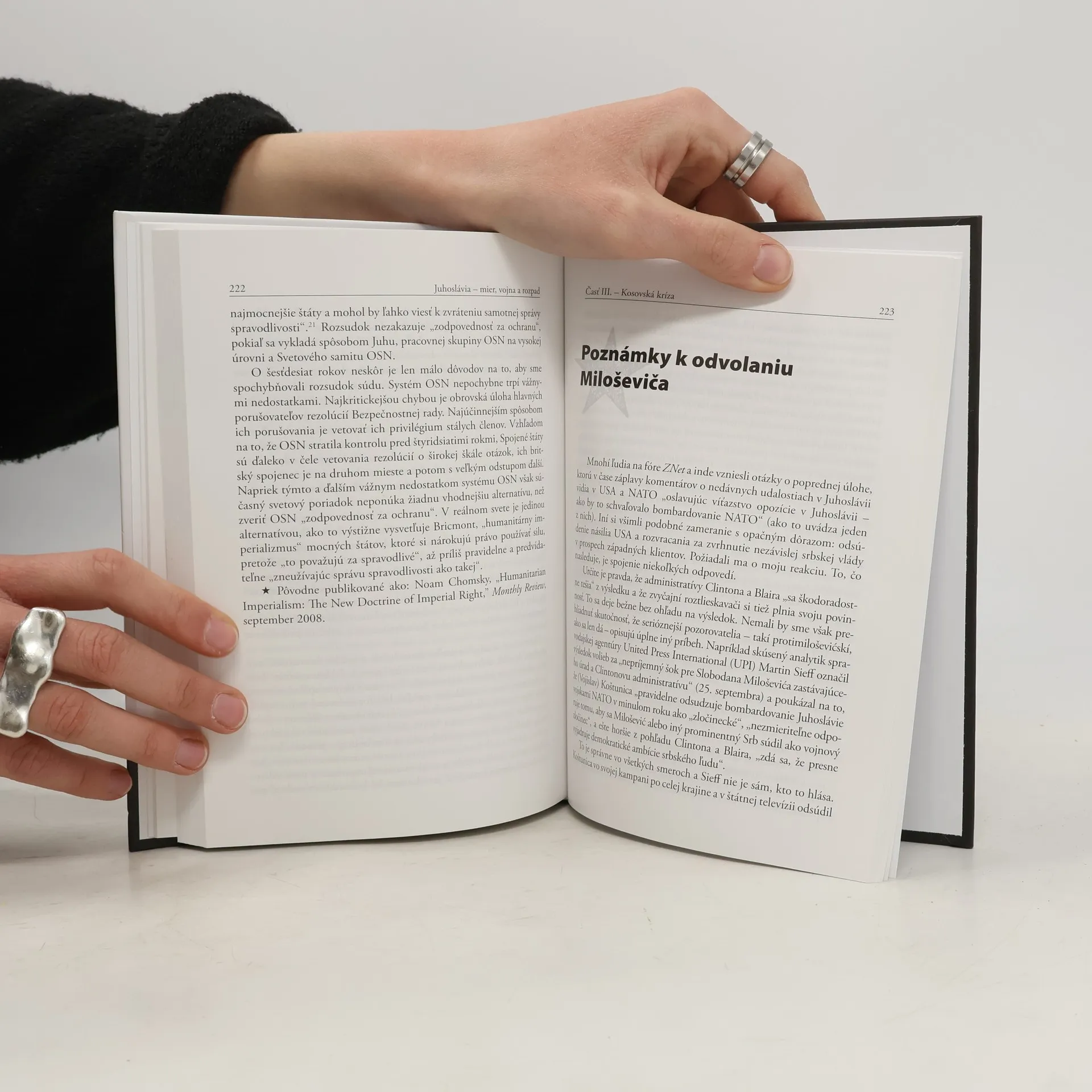 Ktože to pred dvadsiatimi rokmi hrubo porušil medzinárodné právo a bez akéhokoľvek mandátu OSN zaútočil pod vymyslenou zámienkou na suverénny európsky štát a zničil ho? Neposlušné Srbsko nebolo ochotné podriadiť sa diktátu USA a podpísať „mierový plán“ s neprijateľnými podmienkami /napr. aj rozmiestnenie cudzích vojsk v Kosove/. Táto oblasť bola posledným kútom Európy, ktorá sa nepodriadila neoliberálnym programom USA, neprebehli v nej ekonomické ani sociálne reformy. Noam Chomsky je jeden z najznámejších a najcitovanejších intelektuálov našej doby, svojím politickým aktivizmom patrí k ostrým kritikom amerického imperializmu a mediálnej propagandy, hoci sám je Američan. Kniha je komplexná analýza všetkých jeho textov a verejných rozhovorov o Juhoslávii.