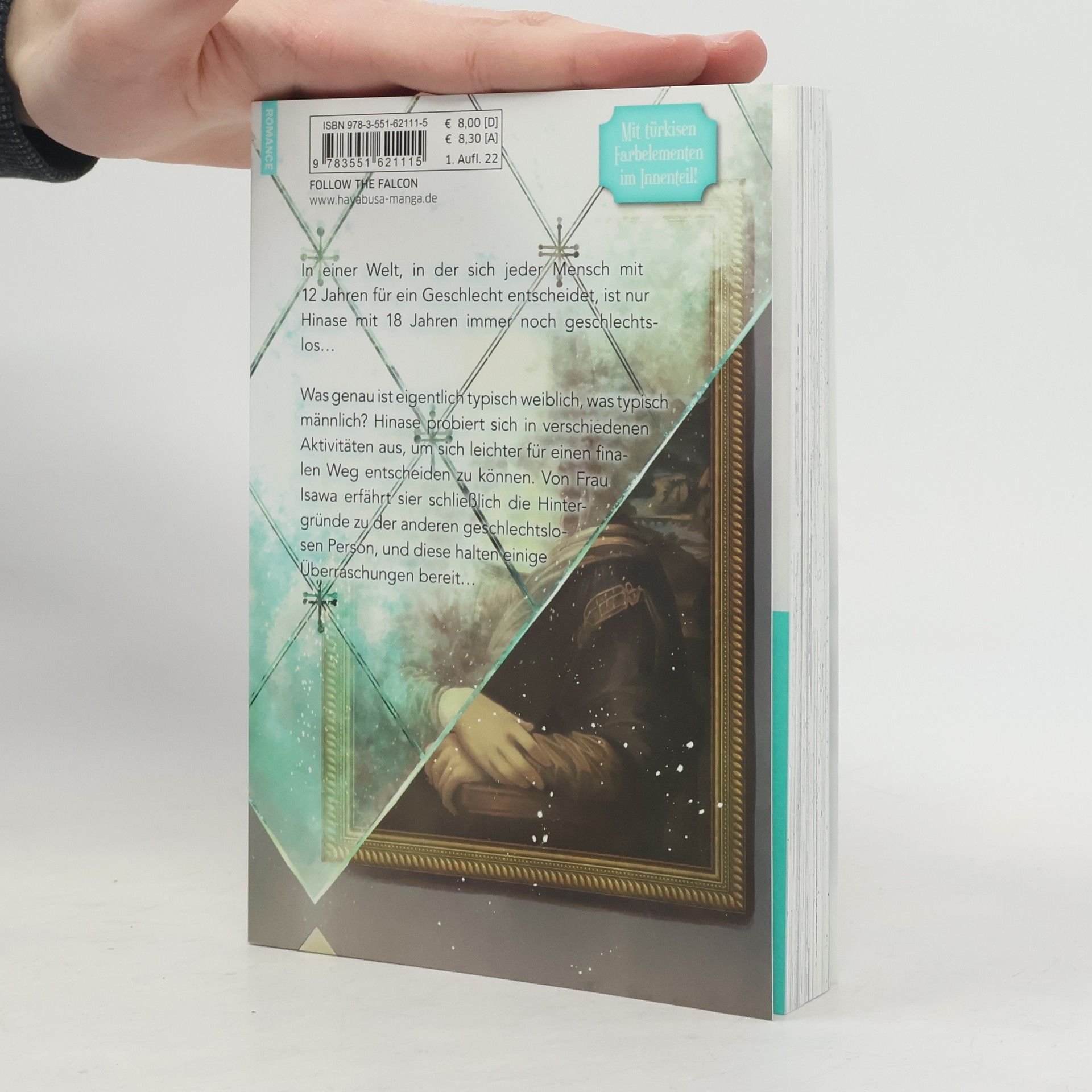 Türkise Farbelemente auf den Seiten - nur in 1. Auflage! In einer Welt, in der sich jeder Mensch mit 12 Jahren für ein Geschlecht entscheidet, ist nur Hinase mit 18 Jahren immer noch geschlechtslos… Was genau ist eigentlich typisch weiblich, was typisch männlich? Hinase probiert sich in verschiedenen Aktivitäten aus, um sich leichter für einen finalen Weg entscheiden zu können. Von Frau Isawa erfährt sier schließlich die Hintergründe zu der anderen geschlechtslosen Person, und diese halten einige Überraschungen bereit…