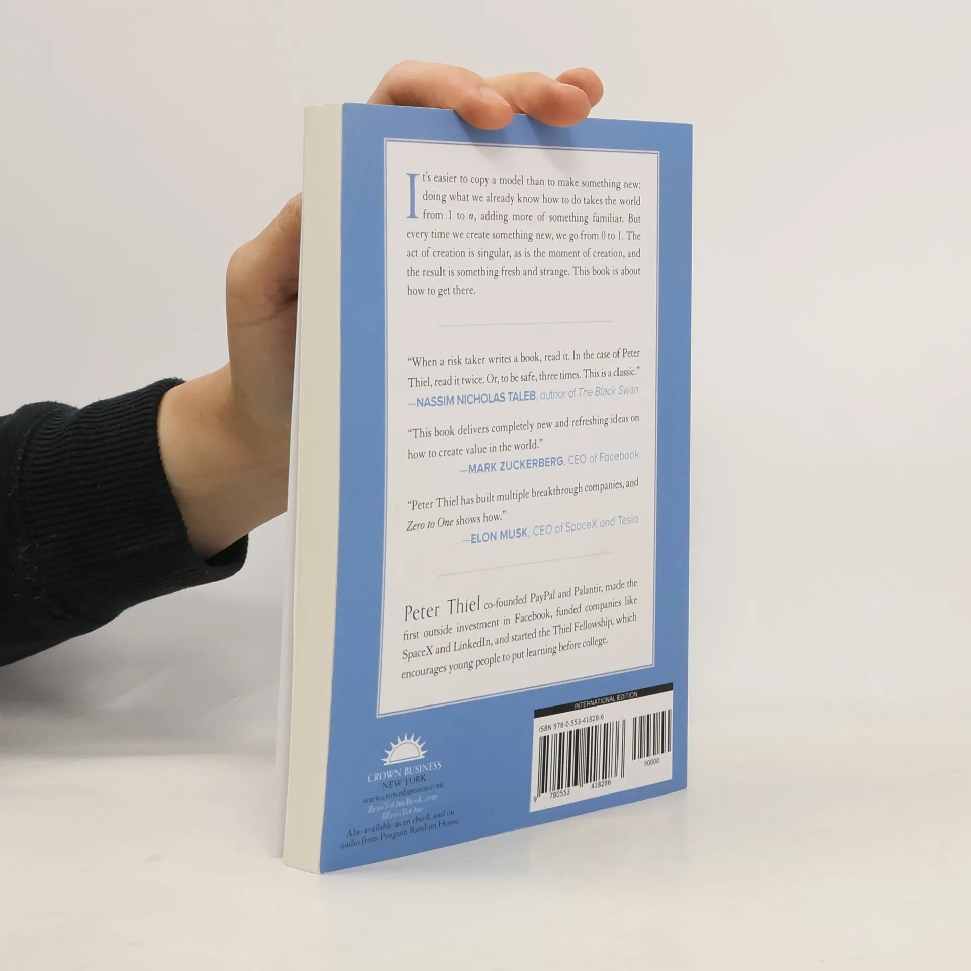 "EVERY MOMENT IN BUSINESS HAPPENS ONLY ONCE. The next Bill Gates will not build an operating system. The next Larry Page or Sergey Brin won't make a search engine. And the next Mark Zuckerberg won't create a social network. If you are copying these guys, you aren't learning from them. It's easier to copy a model than to make something new: doing what we already know how to do takes the world from 1 to n, adding more of something familiar. But every time we create something new, we go from 0 to 1. The act of creation is singular, as is the moment of creation, and the result is something fresh and strange. Zero to One is about how to build companies that create new things. It draws on everything I've learned directly as a co-founder of PayPal and Palantir and then an investor in hundreds of startups, including Facebook and SpaceX. The single most powerful pattern I have noticed is that successful people find value in unexpected places, and they do this by thinking about business from first principles instead of formulas. Ask not, what would Mark do? Ask: WHAT VALUABLE COMPANY IS NOBODY BUILDING? "--