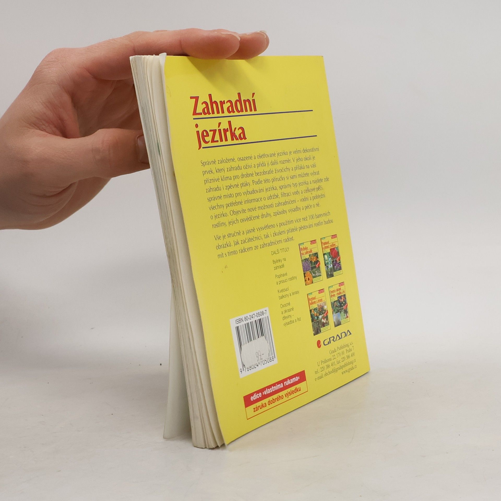 Správně založené, osazené a ošetřované jezírko je velmi dekorativní prvek, který zahradu oživí a přidá jí další rozměr. V jeho okolí je příznivé klima pro drobné bezobratlé živočichy a přiláká na vaši zahradu i zpěvné ptáky. Podle této příručky si sami můžete vybrat správné místo pro vybudování jezírka, správný typ jezírka a najdete zde všechny potřebné informace o údržbě, filtraci vody a celkové péči o jezírko. Objevíte nové možnosti zahradničení - vodní a pobřežní rostliny, jejich osvědčené druhý, způsoby výsadby a péče o ně. Vše je stručně a jasně vysvětleno s použitím více než 100 barevných obrázků. Jak začátečníci, tak i zkušení přátelé pěstování rostlin budou mít s tímto rádcem ze zahradničení radost.