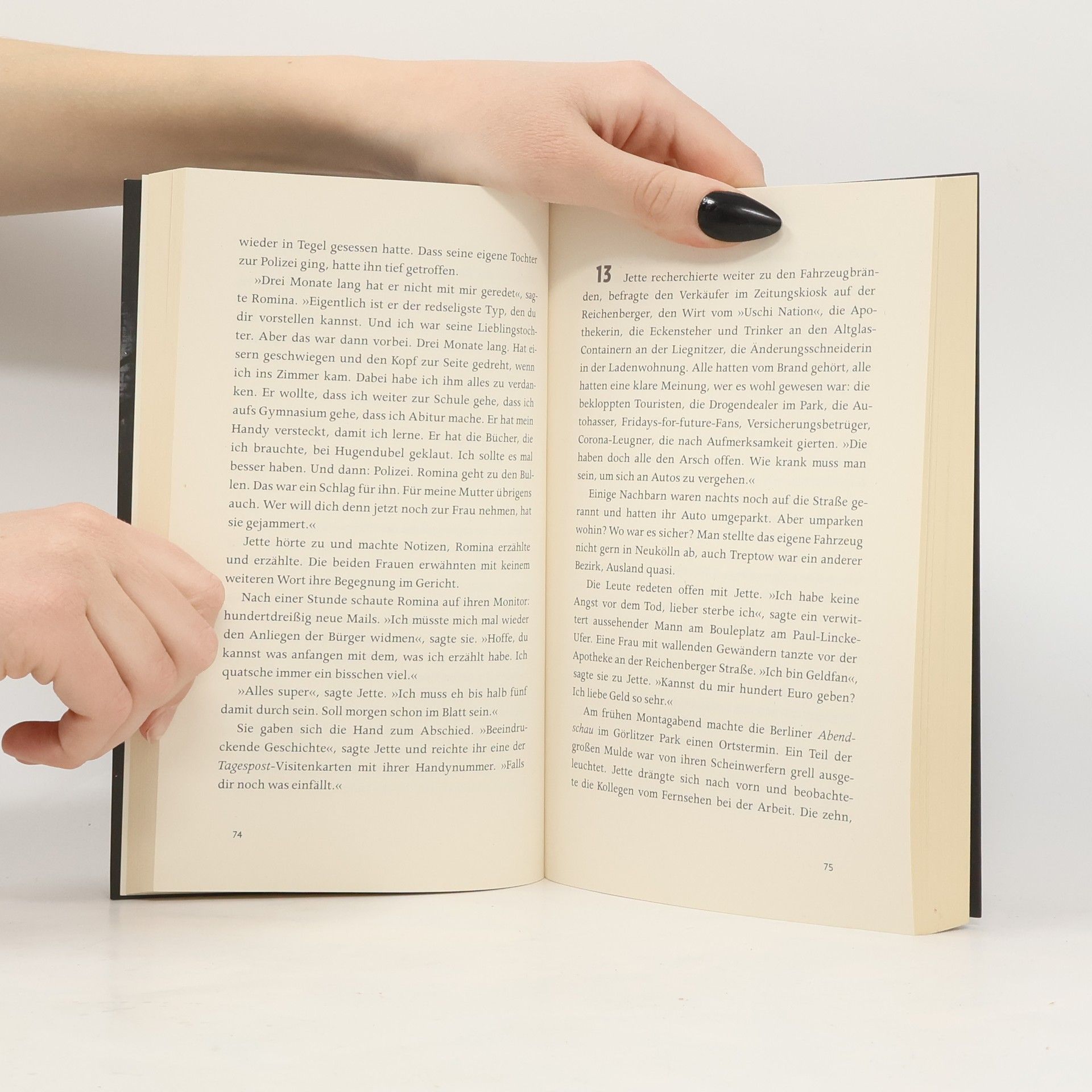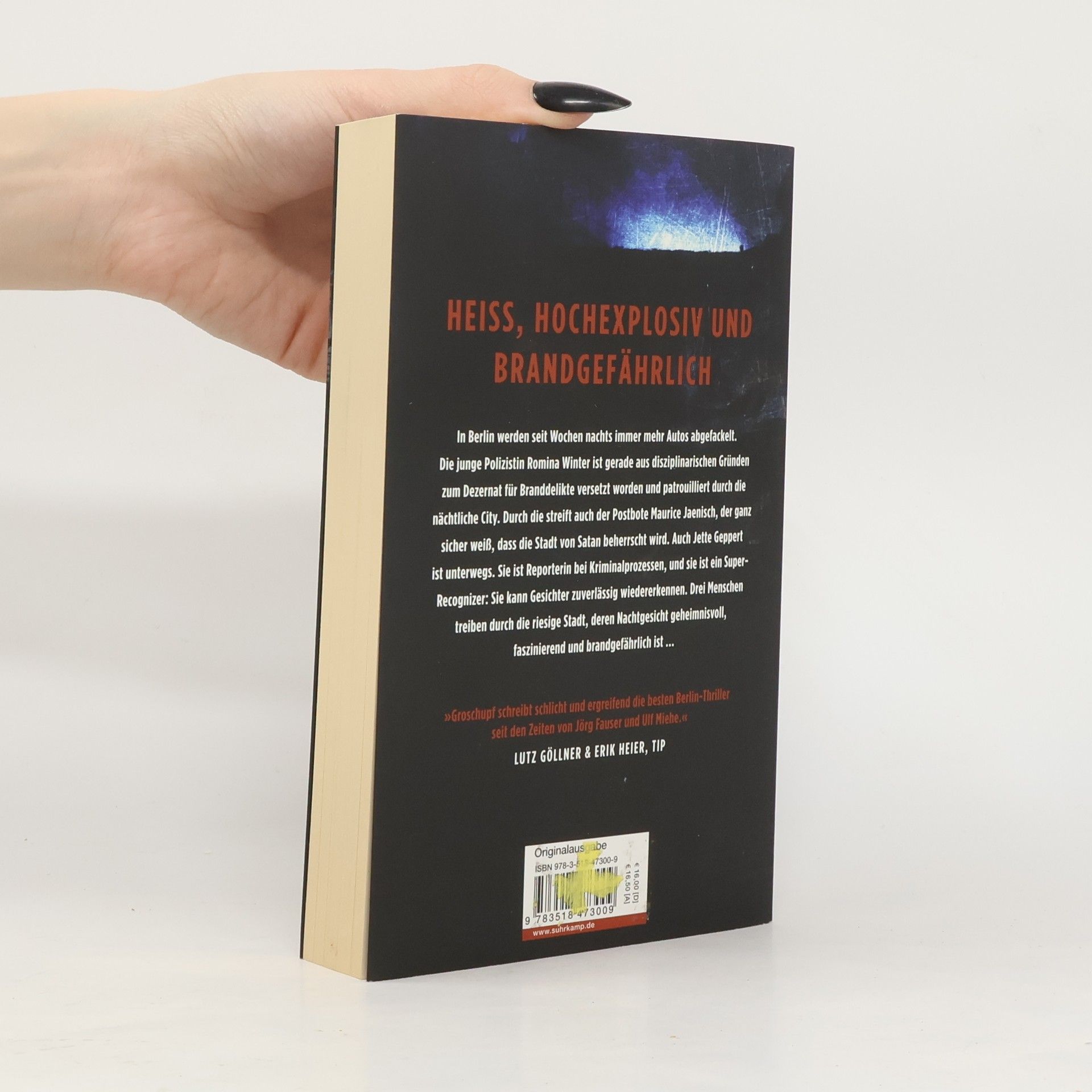 In der Hauptstadt brennen seit Monaten nachts immer mehr Luxuskarossen. Berliner Autofahrer fühlen sich allein gelassen und gehen in ihrem Kiez gemeinsam auf »Bürgerstreife«, während der polizeiliche Staatsschutz linken Unrat wittert. Die junge Polizistin Romina Winter ist gerade aus disziplinarischen Gründen frisch zum Dezernat für Branddelikte versetzt worden und patrouilliert durch die nächtliche City. Durch die streift auch der Postbote Maurice Jaenisch, der ganz sicher weiß, dass die Stadt von Satan beherrscht wird. Und weil er alles richtig machen will, muss er ihm gegenübertreten. Auch Jette Geppert ist unterwegs. Sie ist Reporterin bei Kriminalprozessen in Moabit, und sie ist ein Super Recognizer: Sie kann Gesichter zuverlässig wiedererkennen. Drei Menschen treiben durch die riesige Stadt, deren Nachtgesicht geheimnisvoll, faszinierend und brandgefährlich ist ...
