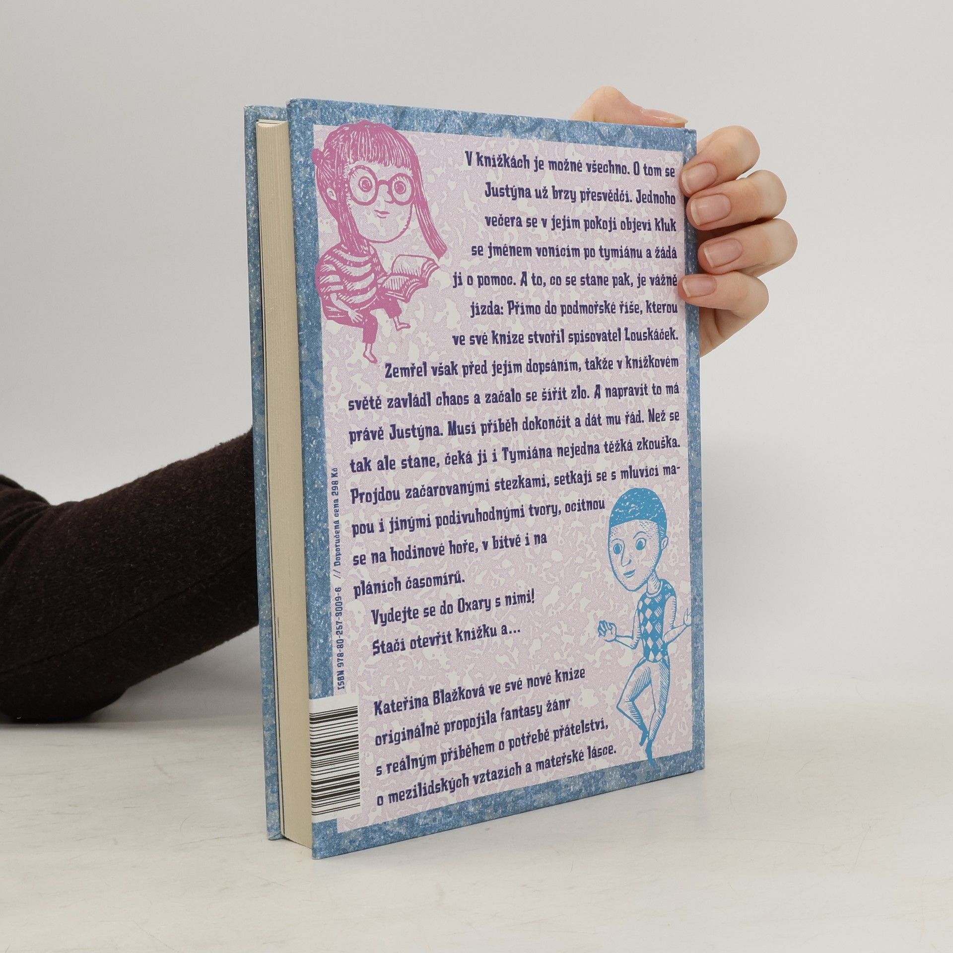 Podaří se obyčejné holce zachránit fantastický svět? V knížkách je možné všechno. O tom se Justýna už brzy přesvědčí. Jednoho večera se v jejím pokoji objeví kluk se jménem vonícím po tymiánu a žádá ji o pomoc. A to, co se stane pak, je vážně jízda: Přímo do podmořské říše, kterou ve své knize stvořil spisovatel Louskáček. Zemřel však před jejím dopsáním, takže v knížkovém světě zavládl chaos a začalo se šířit zlo. A napravit to má právě Justýna. Musí příběh dokončit a dát mu řád. Než se tak ale stane, čeká ji i Tymiána nejedna těžká zkouška. Projdou začarovanými stezkami, setkají se s mluvící mapou i jinými podivuhodnými tvory, ocitnou se na hodinové hoře, v bitvě i na pláních časomírů. Vydejte se do Oxary s nimi! Stačí otevřít knížku a… Kateřina Blažková ve své nové knize originálně propojila fantasy žánr s reálným příběhem o potřebě přátelství, o mezilidských vztazích a mateřské lásce. Ilustrace vytvořila Nanako Ishida, japonská výtvarnice žijící v Čechách.