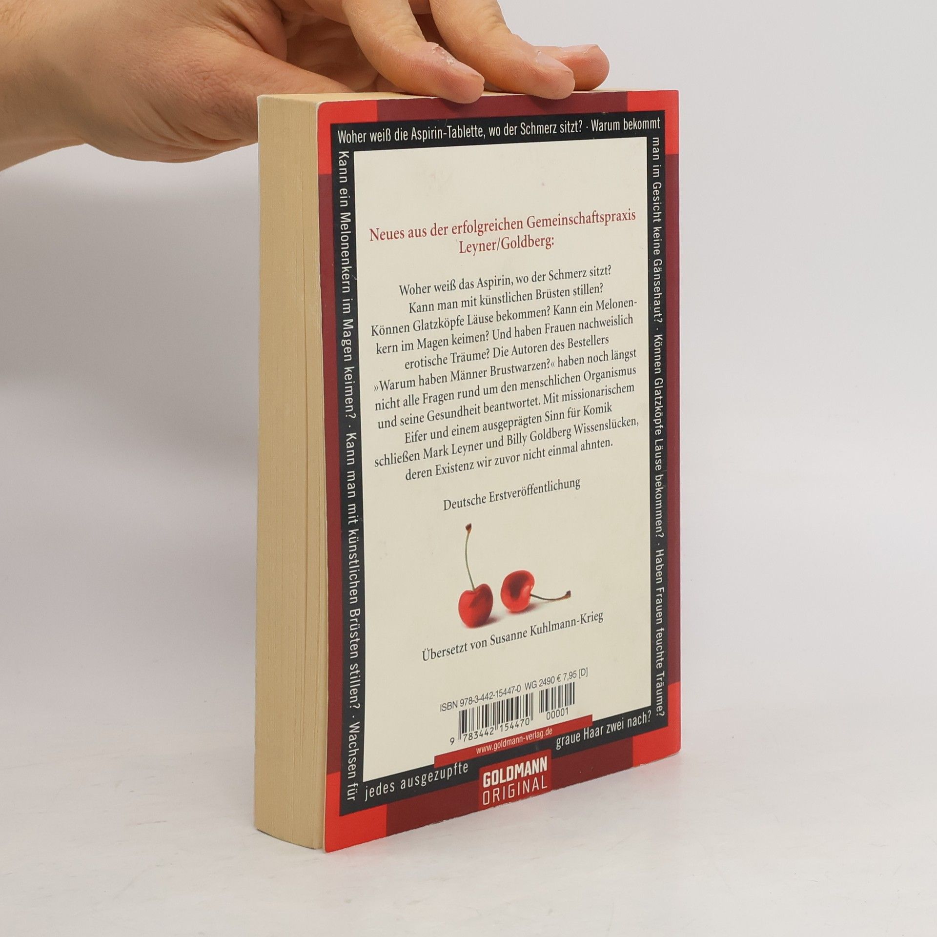 „Wer Antworten sucht, muss anfangen, die richtigen Fragen zu stellen.“ Dr. Billy Goldberg Woher weiß das Aspirin, wo der Schmerz sitzt? Kann man mit künstlichen Brüsten stillen? Können Glatzköpfe Läuse bekommen? Kann ein Melonenkern im Magen keimen? Und haben auch Frauen erotische Träume? Die Autoren des Nummer-1-Bestellers „Warum haben Männer Brustwarzen?“ haben noch längst nicht alle Fragen rund um den menschlichen Organismus und seine Gesundheit beantwortet. Mit missionarischem Eifer und deftigem Humor schließen sie Wissenslücken, deren Existenz wir zuvor nicht einmal ahnten. Das perfekte Geschenkbuch für Hypochonder, Kassenpatienten und alle Fans von populären Medizin-Irrtümern.