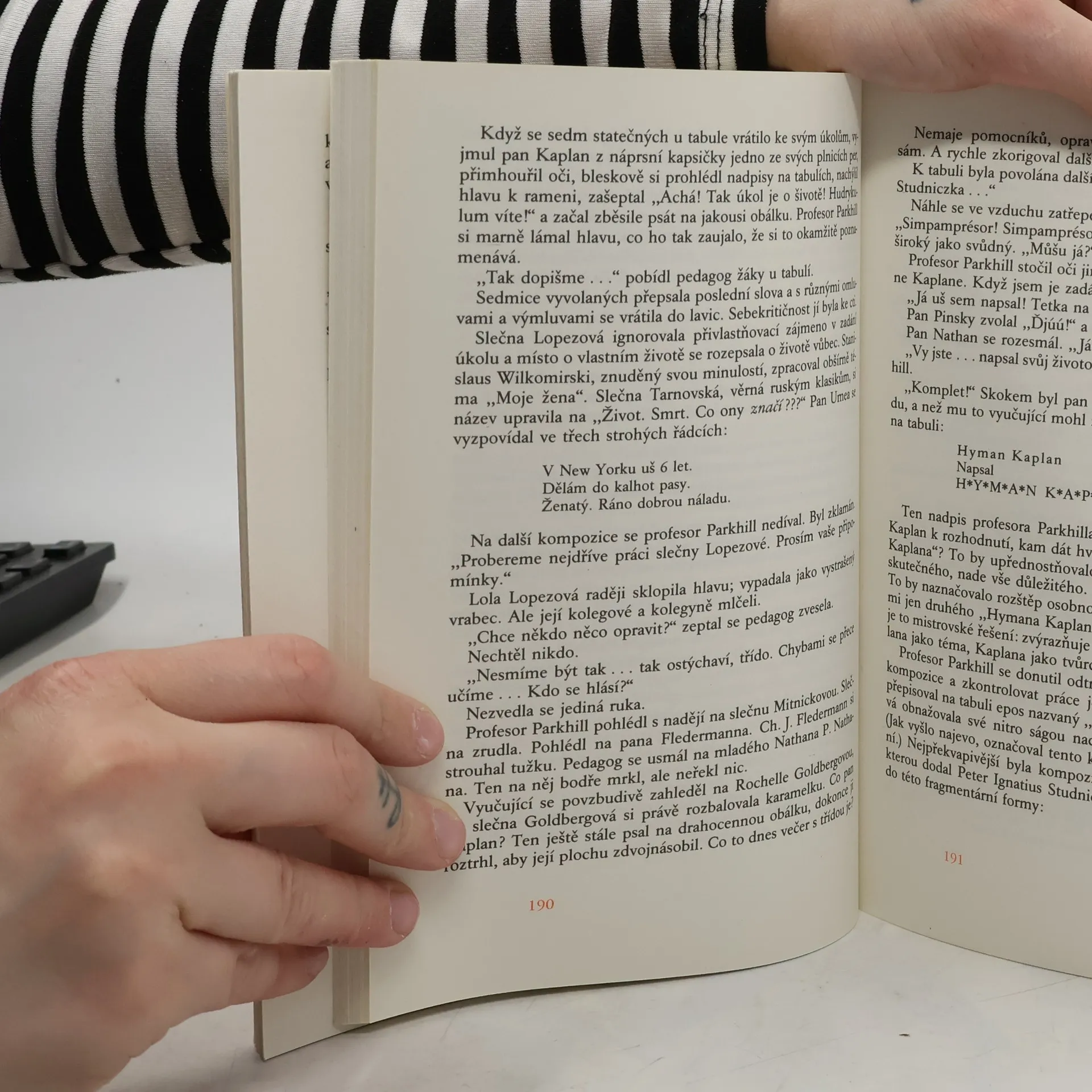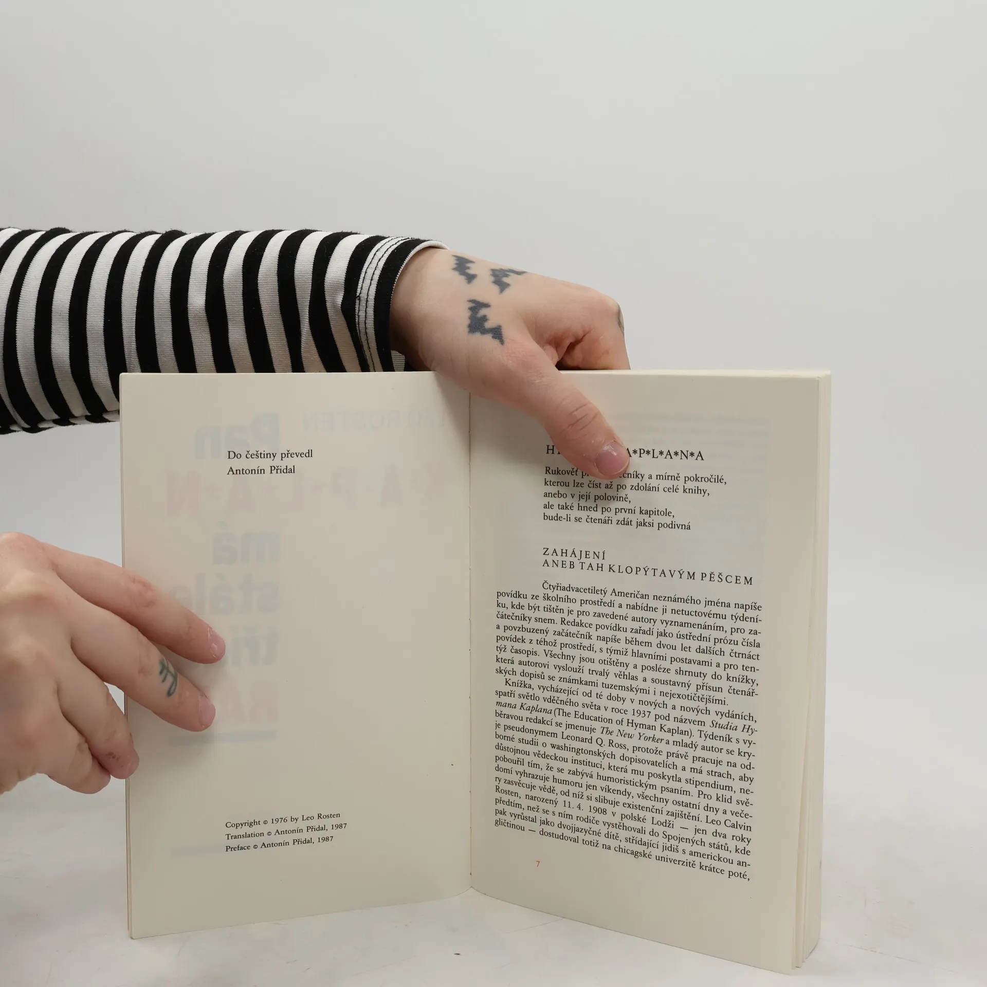 Když Leo Rosten podepisoval roku 1963 smlouvu na vydání svých dvou humoristických knih o panu Kaplanovi (první z nich znají naši čtenáři v podání Pavla Eisnera), netušil, kolik dřiny ho čeká. Vyzrálý spisovatel se totiž nakonec nespokojil pouhým spojením obou předchozích knih a dobrodružství přistěhovalce do Ameriky a „jazykového převratníka“ pana Kaplana, který se s osobitou logikou prodírá záludnou houštinou angličtiny, zcela přepracoval a obohatil o další epizody a postavy, takže v roce 1976 se objevila zbrusu nová kniha. Této hozené rukavice se chopil Antonín Přidal, aby se po čtyřiceti letech od prvního vydání Eisnerova zpracování páně Kaplanových jazykových klauniád pokusil o vlastní variantu. Jsme svědky překladatelského koncertu, jehož sólistou je jazyk, ohňostroje slovních pitvorností, zkomolenin a přehmatů, kterých se — ovšemže na češtině — dopouští pan Kaplan i ostatní svěřenci začátečnické třídy profesora Parkhilla na newyorské Večerní přípravné škole pro dospělé. Pan Kaplan se tvrdošíjně odmítá řídit jakýmikoliv jazykovými pravidly a konvencemi, jako by chtěl celý jazyk „vybudovat znovu a od základů'', a proto učebna připomíná spíše soudní síň, „kde je před soudní stolici postaven sám jazyk“, či bojiště, na němž pan Kaplan nemíní ustoupit „ani o píďu“. Díky této kongeniální variaci na Rostenovo téma se účastníme velkolepé oslavy naší mateřštiny, z níž Antonín Přidal vykouzlil nádhernou fantaskní grotesku.