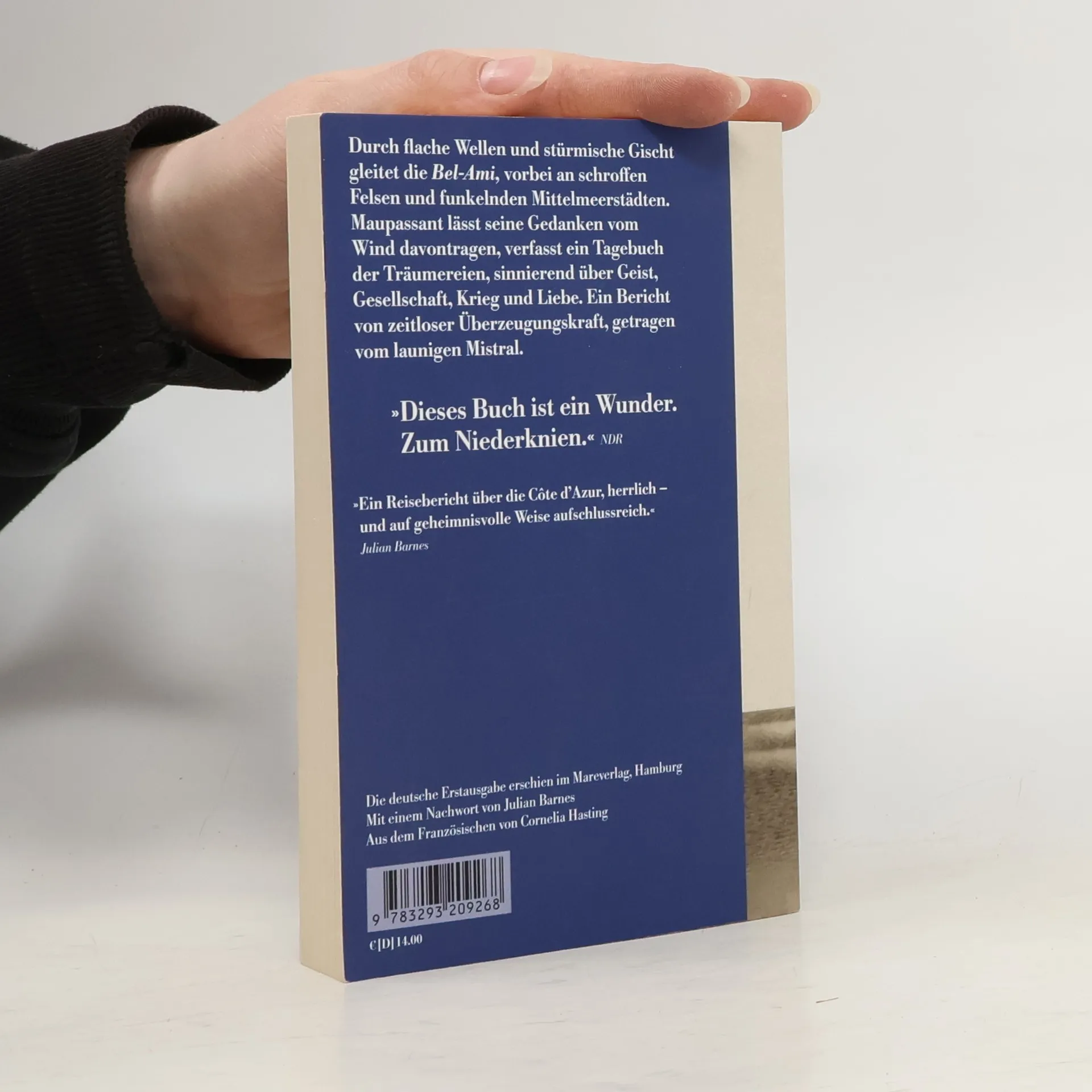 Vorbei an zerklüfteten Felsen gleitet die Bel-Ami durch das violett schimmernde Wasser, tanzt mal sanft über flache Wellen, mal wild durch stürmische Gischt. Unter den Fantasiegestalten der Berge liegen die glitzernden Mittelmeerstädte, Nizza, Cannes, Saint-Tropez, verführen, befremden, provozieren. Guy de Maupassant lässt seine Gedanken vom Wind davontragen, löst sich von nichtigen Gewissheiten, die das Leben an Land bestimmen und findet Ruhe in der stillen Einsamkeit auf See. Maupassant verfasst ein Tagebuch der Träumereien, sinniert über Geist und Seele, Gesellschaft, Krieg und Liebe. Ein Bericht von zeitloser Überzeugungskraft, getragen von den Böen des Mistrals.