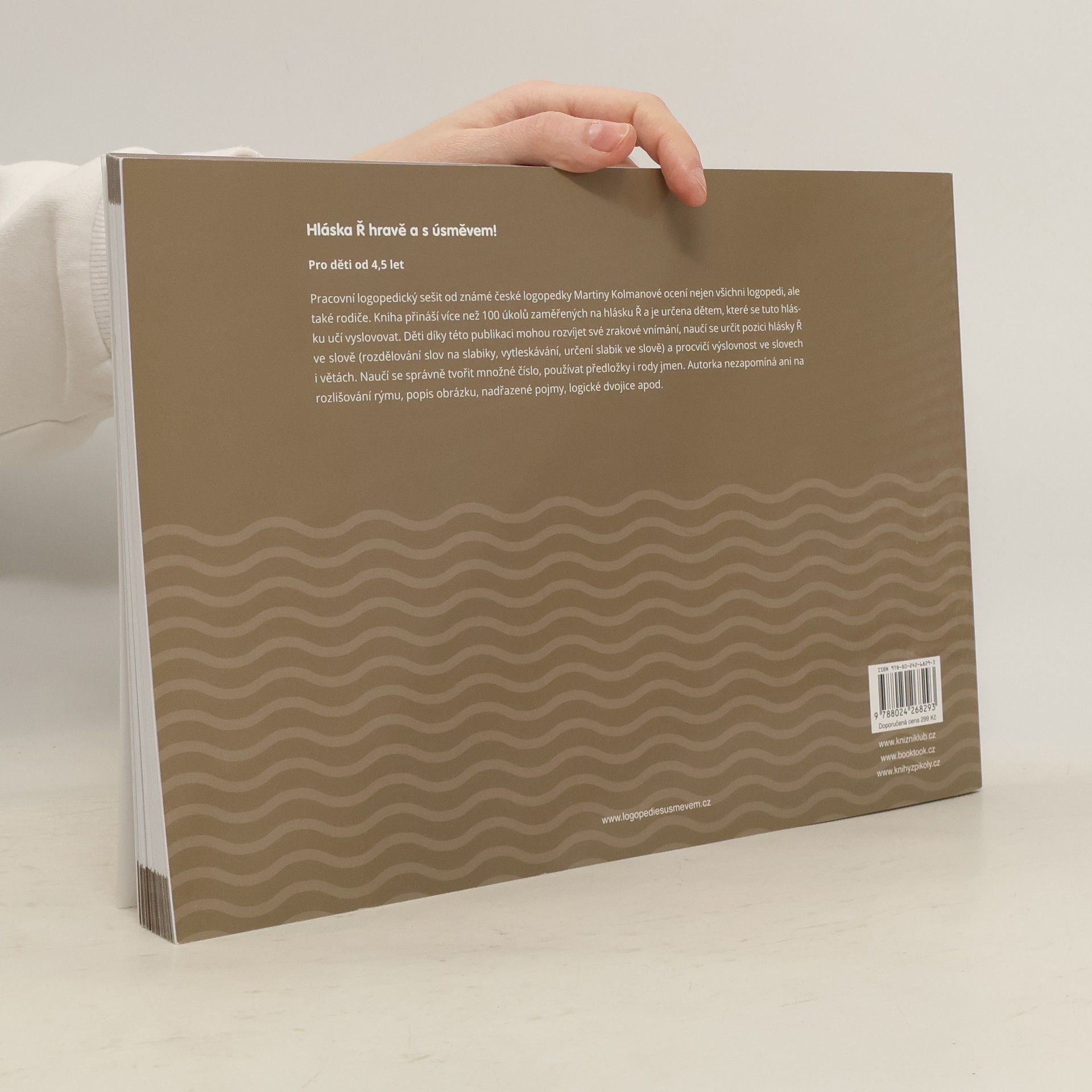 Pracovní logopedický sešit od známé české logopedky Martiny Kolmanové ocení nejen všichni logopedi, ale také rodiče. Kniha přináší více než 100 úkolů zaměřených na hlásku Ř a je určena dětem, které se tuto hlásku učí vyslovovat. Děti díky této publikaci mohou rozvíjet své zrakové vnímání, naučí se určit pozici hlásky Ř ve slově (rozdělování slov na slabiky, vytleskávání, určení slabik ve slově) a procvičí výslovnost ve slovech i větách. Naučí se správně tvořit množné číslo, používat předložky i rody jmen. Autorka nezapomíná ani na rozlišování rýmu, popis obrázku, nadřazené pojmy, logické dvojice apod.