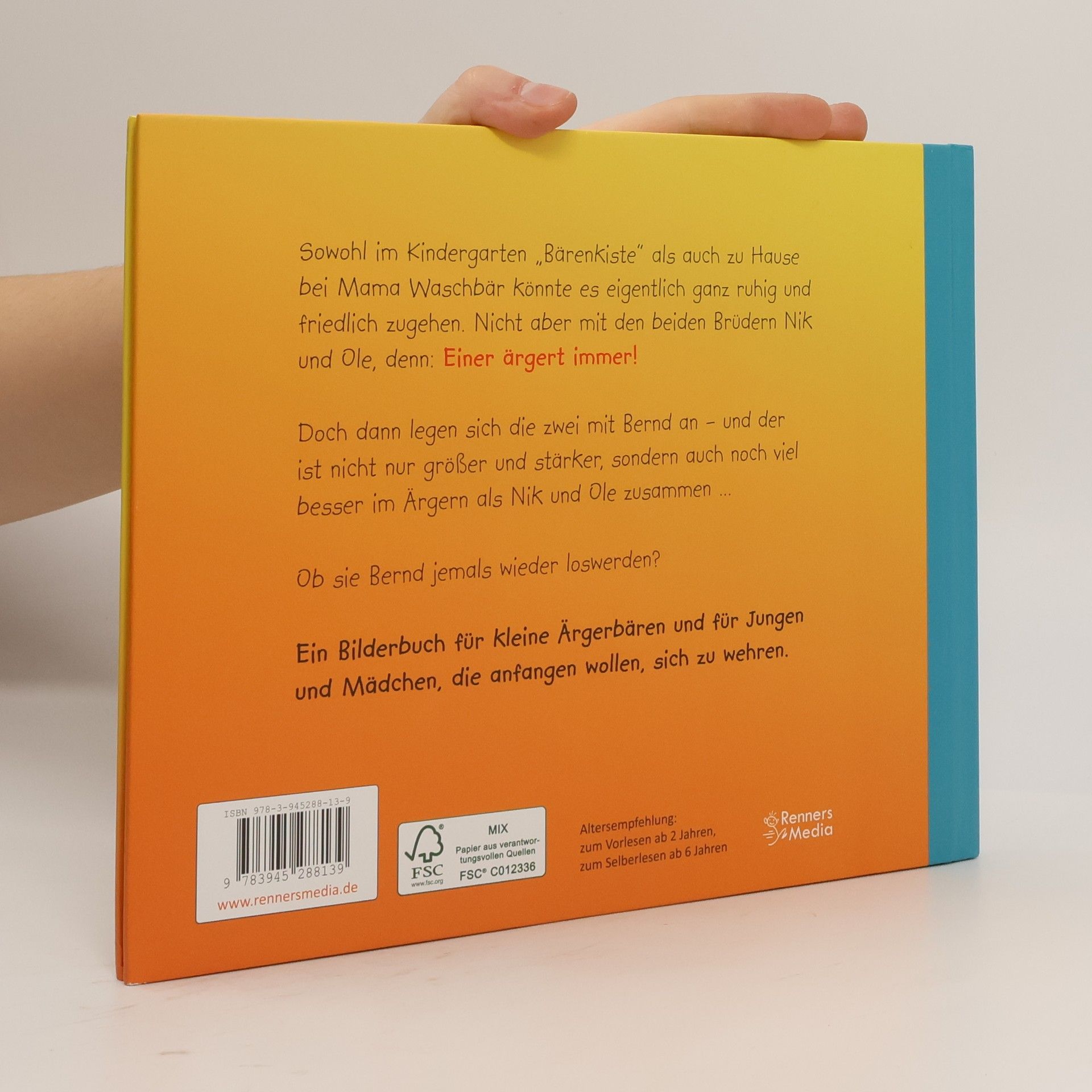 Sowohl im Kindergarten „Bärenkiste“ als auch zu Hause bei Mama Waschbär könnte es eigentlich ganz ruhig und friedlich zugehen. Nicht aber mit den beiden Brüdern Nik und Ole, denn: Einer ärgert immer! Doch dann legen sich die zwei mit Bernd an – und der ist nicht nur größer und stärker, sondern auch noch viel besser im Ärgern als Nik und Ole zusammen ... Ob sie Bernd jemals wieder loswerden? Ein Bilderbuch für kleine Ärgerbären und für Jungen und Mädchen, die anfangen wollen, sich zu wehren. Altersempfehlung: zum Vorlesen ab 2 Jahren, zum Selberlesen ab 6 Jahren