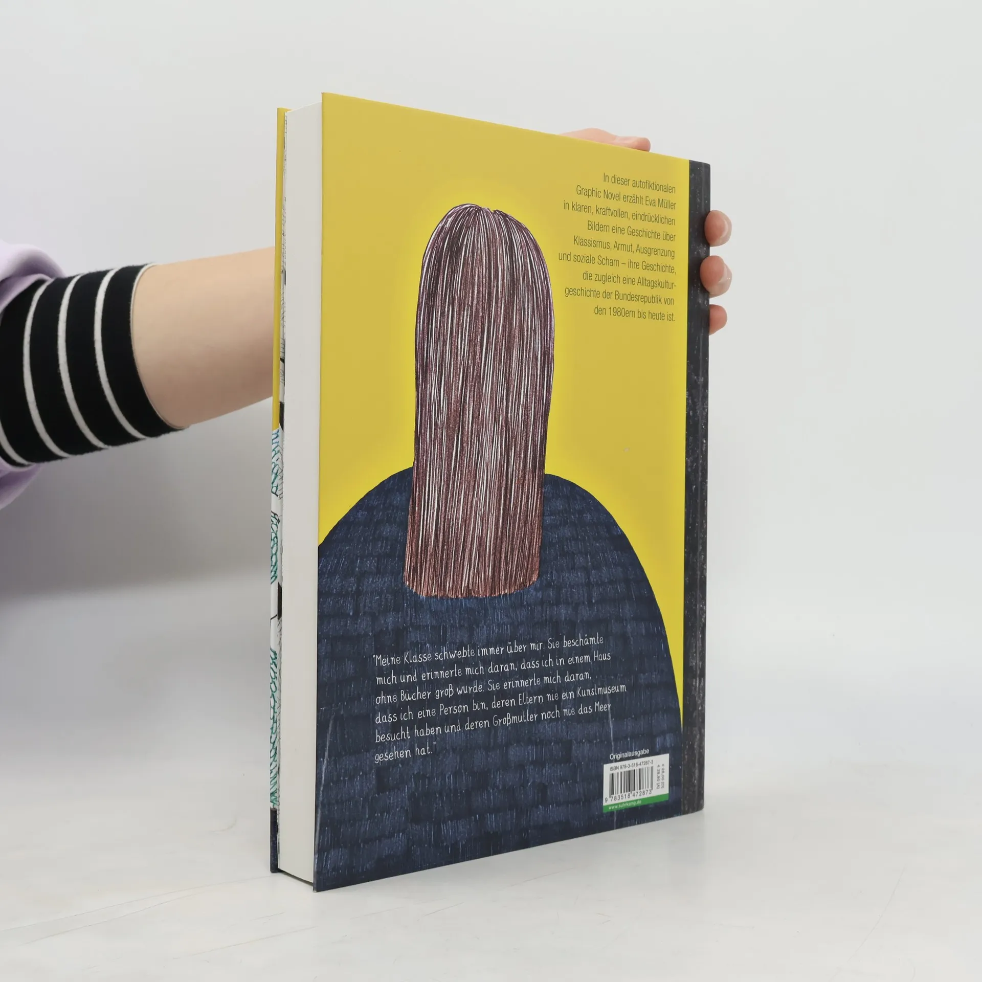 »Scheiblettenkind«, »Schmuddelkuh«, »Assitussi« – das sind nur einige der Schimpfwörter, die sich Eva Müllers Protagonistin immer wieder in ihrer Jugend von Gleichaltrigen anhören musste. Schimpfwörter, mit denen sie, die nicht aus privilegierten Verhältnissen stammt, ausgegrenzt wurde und die sie auf ihren Platz verweisen sollten.In dieser autofiktionalen Graphic Novel erzählt sie ihre Geschichte und die Geschichte ihrer Familie. Sie erzählt in klaren, kraftvollen, eindrücklichen Bildern von erstaunlich ästhetischer Vielfalt über die bäuerliche Herkunft der Großeltern, vom westlichen Arbeitermilieu der Eltern, über das Aufwachsen in Unbildung und Armut, über soziale Scham, den Gestank von Frittierfett, über ihre Billigklamotten mit albernen Aufnähern, ihre Entfremdung von ihren Ursprüngen und schließlich ihre Emanzipation als Künstlerin ‒ und mit dabei ist immer die Schlange Selbstzweifel, die unabhängig von ihrem Erfolg bis heute nicht von ihrer Seite weichen will.
