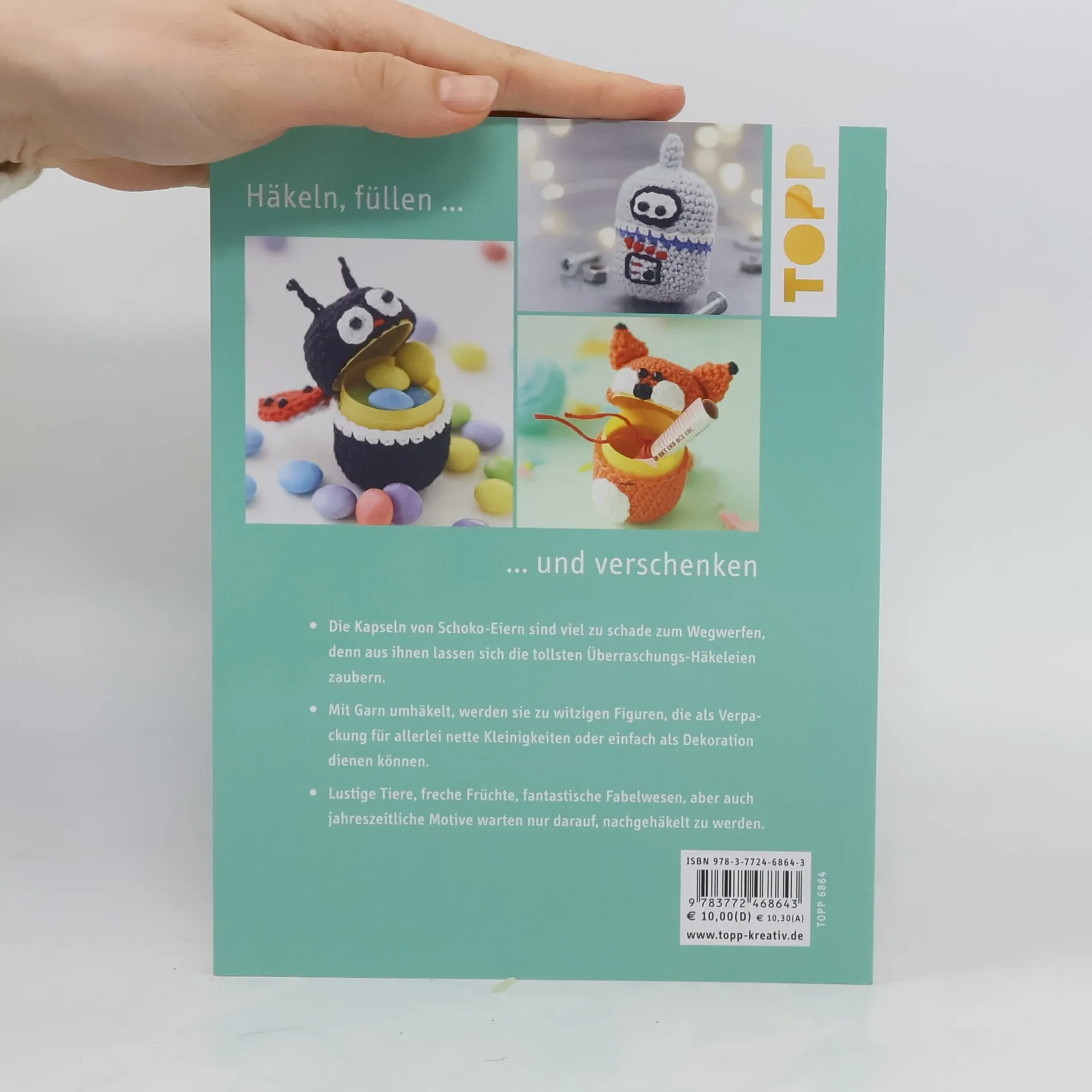 Die Kapseln von Schoko-Eiern sind viel zu schade zum Wegwerfen, denn aus ihnen entstehen die tollsten Überraschungs-Häkeleien. Mit Garn umhäkelt, werden sie zu witzigen Figuren, die als Verpackung für allerlei nette Kleinigkeiten oder einfach als Dekoration dienen können. Lustige Tiere, freche Früchte, fantastische Fabelwesen, aber auch jahreszeitliche Motive warten nur darauf, nachgehäkelt zu werden.