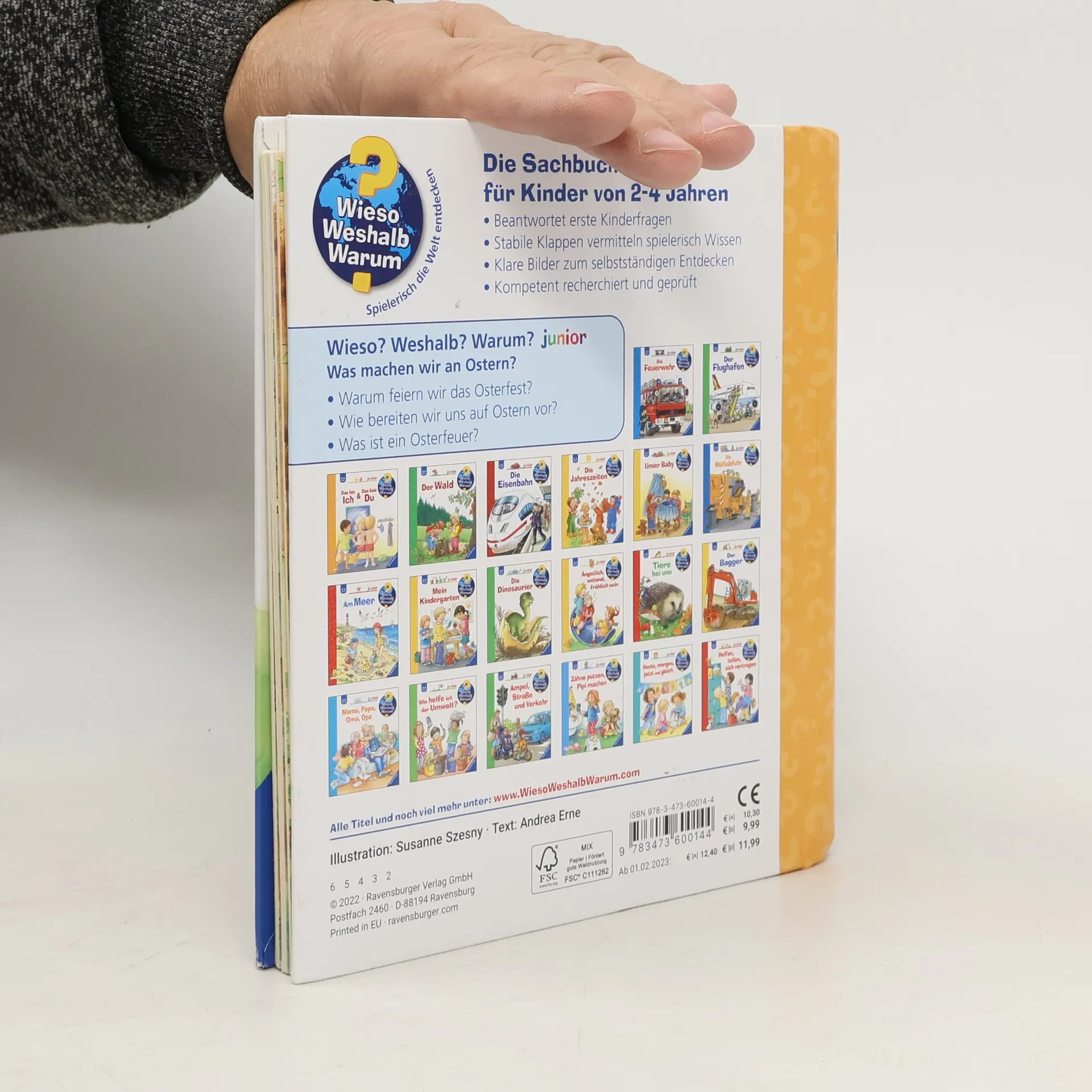 Hasen basteln, Lämmer backen, Eier färben – Ostern steht vor der Tür! Wann kommt endlich der Osterhase? Schon Wochen vor dem eigentlichen Fest spielt Ostern in Kita, Kindergarten und Familie eine große Rolle. Die Kinder erfahren im Buch alles über die Vorbereitungen und die Feier dieses freudigen Festes: Warum feiern wir eigentlich Ostern? Woher kommen die Ostereier? Und was ist ein Osterfeuer? Mit Klappen helfen die Kinder dabei flauschige Küken zu basteln, leckere Osternester zu backen sowie Eier zu bemalen und zu suchen. Wieso? Weshalb? Warum? junior Die Sachbuchreihe für Kinder von 2-4 Jahren Jeden Tag entdecken Kinder etwas Neues – und haben viele Fragen. Wann kommt die Feuerwehr? Was machen die Tiere im Winter? Warum muss ich Zähne putzen? Die beliebte Sachbuchreihe Wieso? Weshalb? Warum? junior beantwortet die Fragen der Kinder auf Augenhöhe. Sie beleuchtet unterschiedlichste Themen aus ihrer Alltags- und Interessenswelt altersgerecht und mit viel Liebe zum Detail. Die Reihe ist speziell auf kleine Hände und die Bedürfnisse der Kleinsten angepasst. Klare und liebevolle Bilder, kurze Sachtexte sowie handliche Klappen, die Bewegungen veranschaulichen und überraschende und lustige Einblicke gewähren, ermöglichen Kindern, sich ihre Themen selbst zu erschließen. Der Spaß am eigenhändigen Entdecken, die liebevolle Umsetzung und die hochwertige Ausstattung garantieren langanhaltende Freude an jedem Buch.