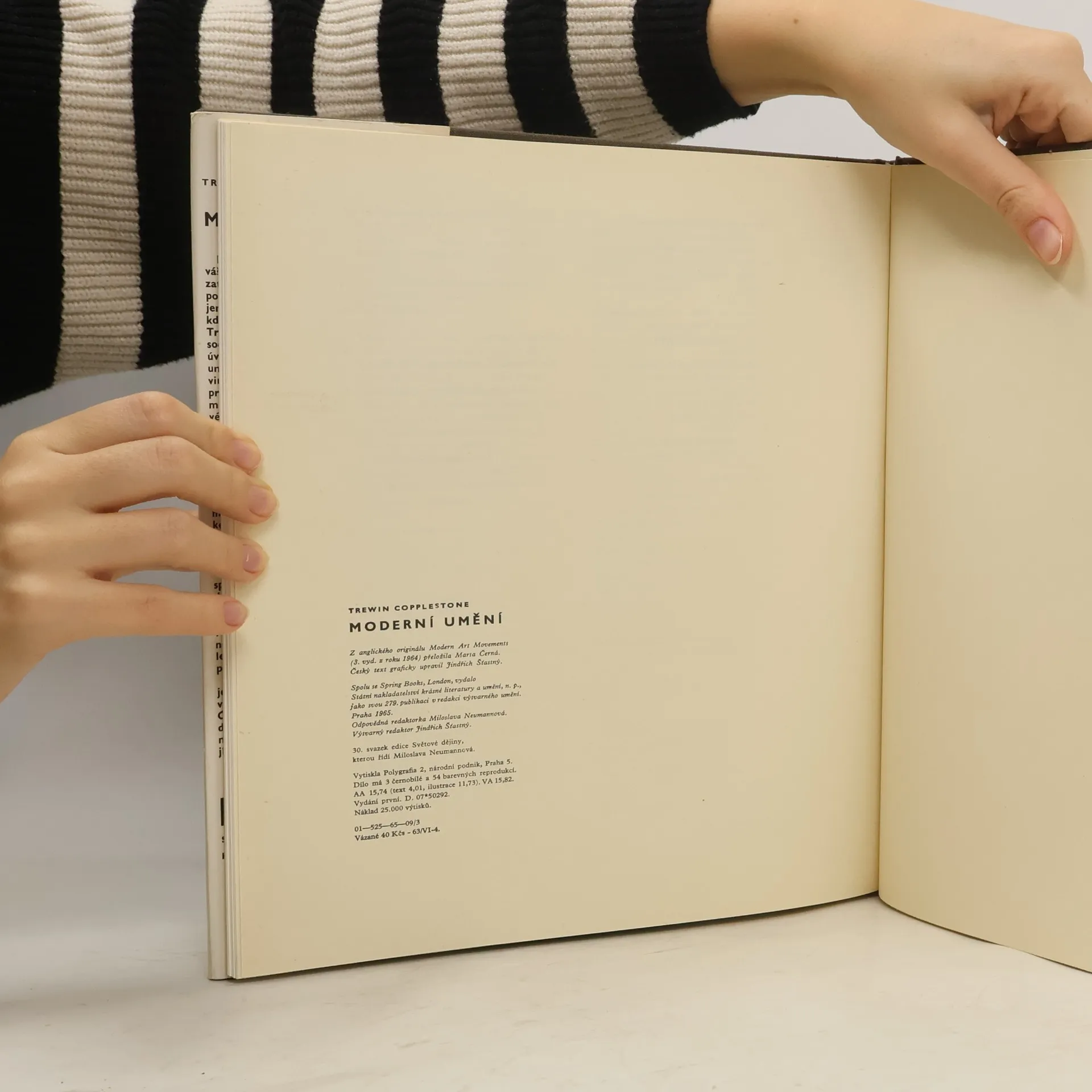 V knize se zabývá anglický malíř, sochař a kritik šesti významnými malířskými školami z prvních třiceti let 20. století. V pojednání o fauvismu, kubismu, expresionismu, futurismu, De Stijlu a surrealismu uvádí nejprve hlavní představitele a reprodukce jejich děl, vysvětluje malířské znaky, původ názvu a dále vznik, vývoj a podstatu toho kterého uměleckého směru. V úvodní části podává výklad o podstatě moderního malířství a vlastního procesu umělecké tvorby. 44 s., 54 s. obr. příl. Spoluvyd. nakl. Spring Books a Paul Hamlyn v Londýně. Na frontispice faksimile podpisů výtvarníků.