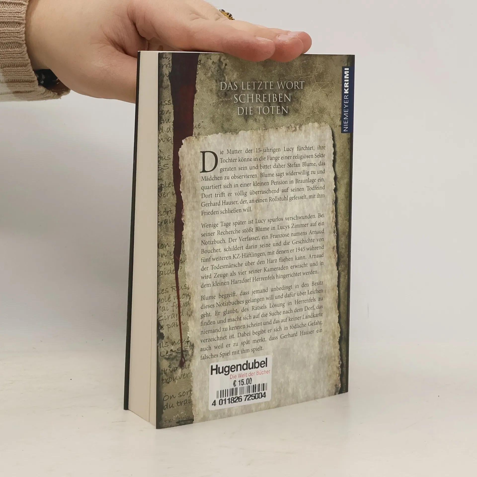 Die Mutter der 15-jährigen Lucy fürchtet, ihre Tochter könne in die Fänge einer religiösen Sekte geraten sein und bittet Stefan Blume, das Mädchen zu observieren. Blume sagt widerwillig zu und quartiert sich in einer kleinen Pension in Braunlage ein. Dort trifft er völlig überraschend auf seinen Todfeind Gerhard Hauser, der, an einen Rollstuhl gefesselt, mit ihm Frieden schließen will. Wenige Tage später ist Lucy spurlos verschwunden. Bei seiner Recherche stößt Blume in Lucys Zimmer auf ein Notizbuch. Der Verfasser, ein Franzose namens Arnaud Boucher, schildert darin seine und die Geschichte von fünf weiteren KZ-Häftlingen, mit denen er 1945 während der Todesmärsche über den Harz fliehen kann. Arnaud wird Zeuge, als vier seiner Kameraden erwischt und in dem kleinen Harzdorf Herrenfels hingerichtet werden. Blume begreift, dass jemand unbedingt in den Besitz dieses Notizbuches gelangen will und dafür über Leichen geht. Er glaubt, des Rätsels Lösung in Herrenfels zu finden und macht sich auf die Suche nach dem Dorf, das niemand zu kennen scheint und das auf keiner Landkarte verzeichnet ist. Dabei begibt er sich in tödliche Gefahr, auch weil er zu spät merkt, dass Gerhard Hauser ein falsches Spiel mit ihm spielt.