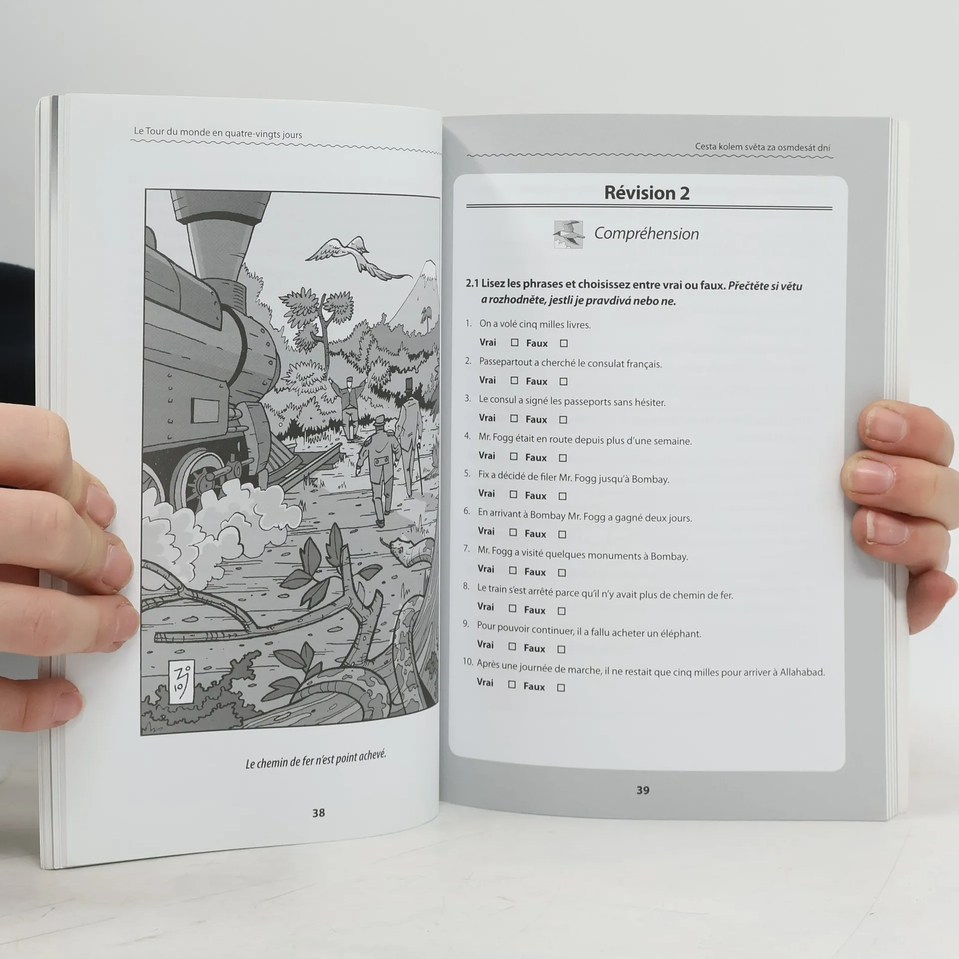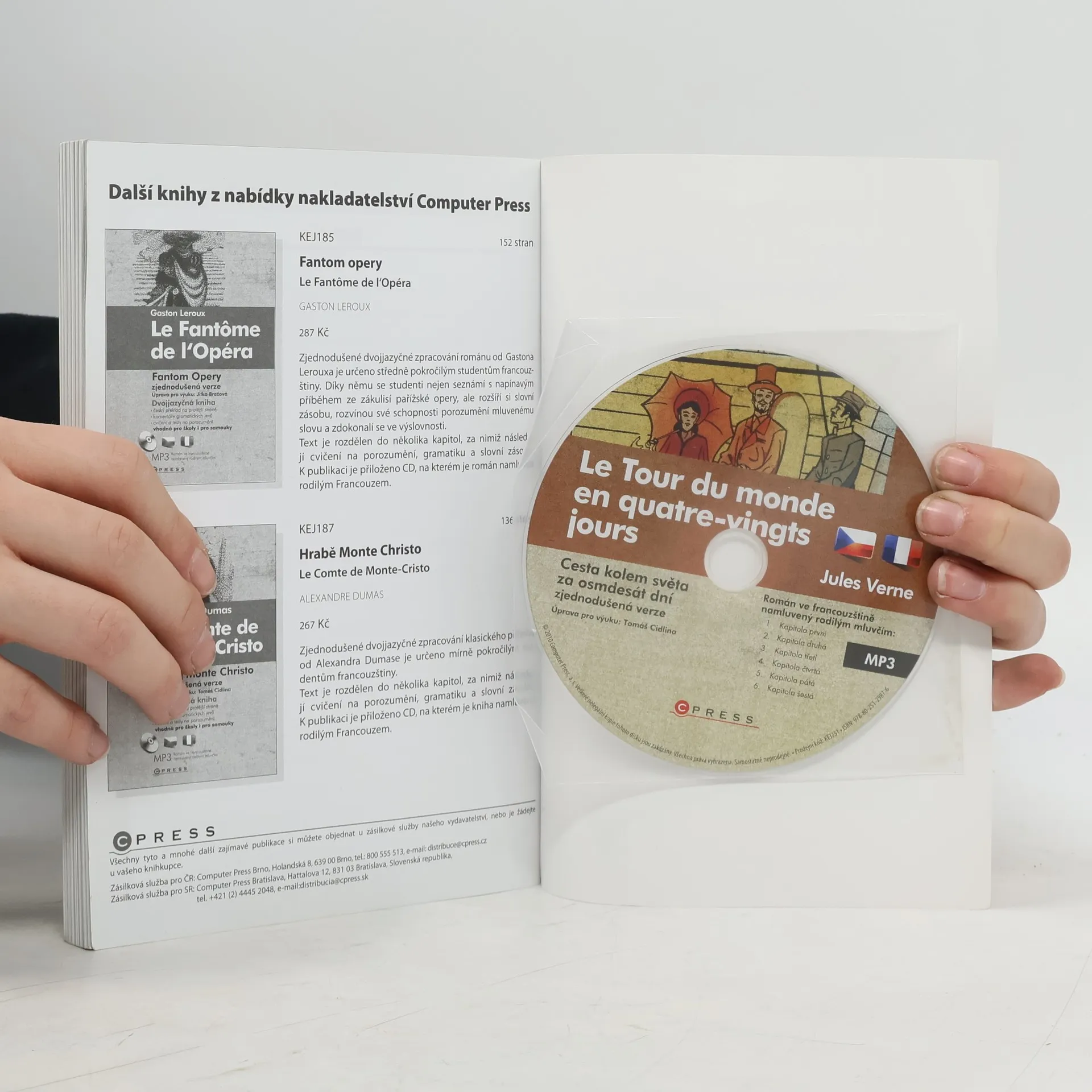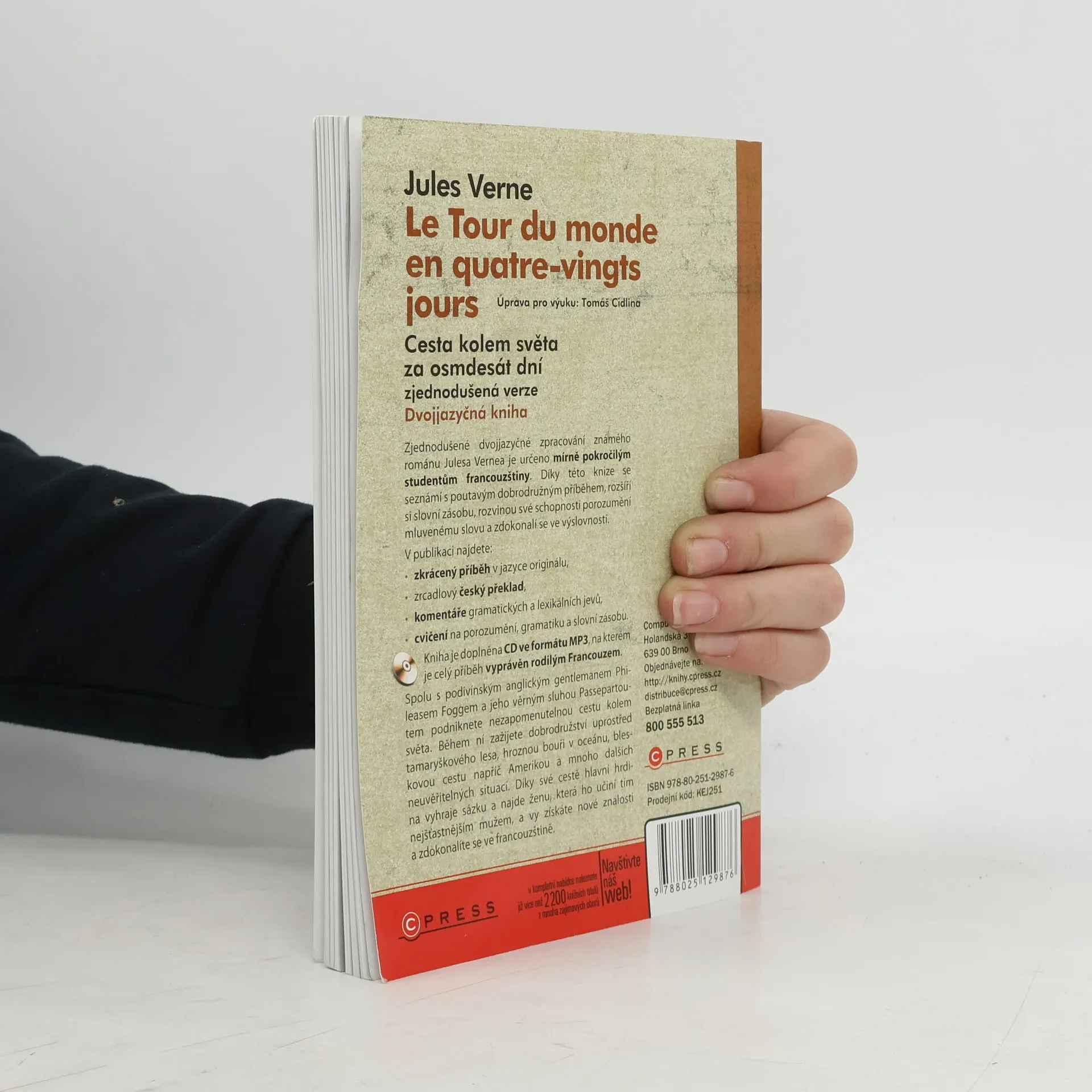 Zjednodušené dvojjazyčné zpracování známého románu Julesa Vernea je určeno mírně pokročilým studentům francouzštiny. Díky této knize se seznámí s poutavým dobrodružným příběhem, rozšíří si slovní zásobu, rozvinou své schopnosti porozumění mluvenému slovu a zdokonalí se ve výslovnosti. Spolu s podivínským anglickým gentlemanem Phileasem Foggem a jeho věrným sluhou Passepartoutem podniknete nezapomenutelnou cestu kolem světa. Během ní zažijete dobrodružství uprostřed tamaryškového lesa, hroznou bouři v oceánu, bleskovou cestu napříč Amerikou a mnoho dalších neuvěřitelných situací. Díky své cestě hlavní hrdina vyhraje sázku a najde ženu, která ho učiní tím nejšťastnějším mužem, a vy získáte nové znalosti a zdokonalíte se ve francouzštině.