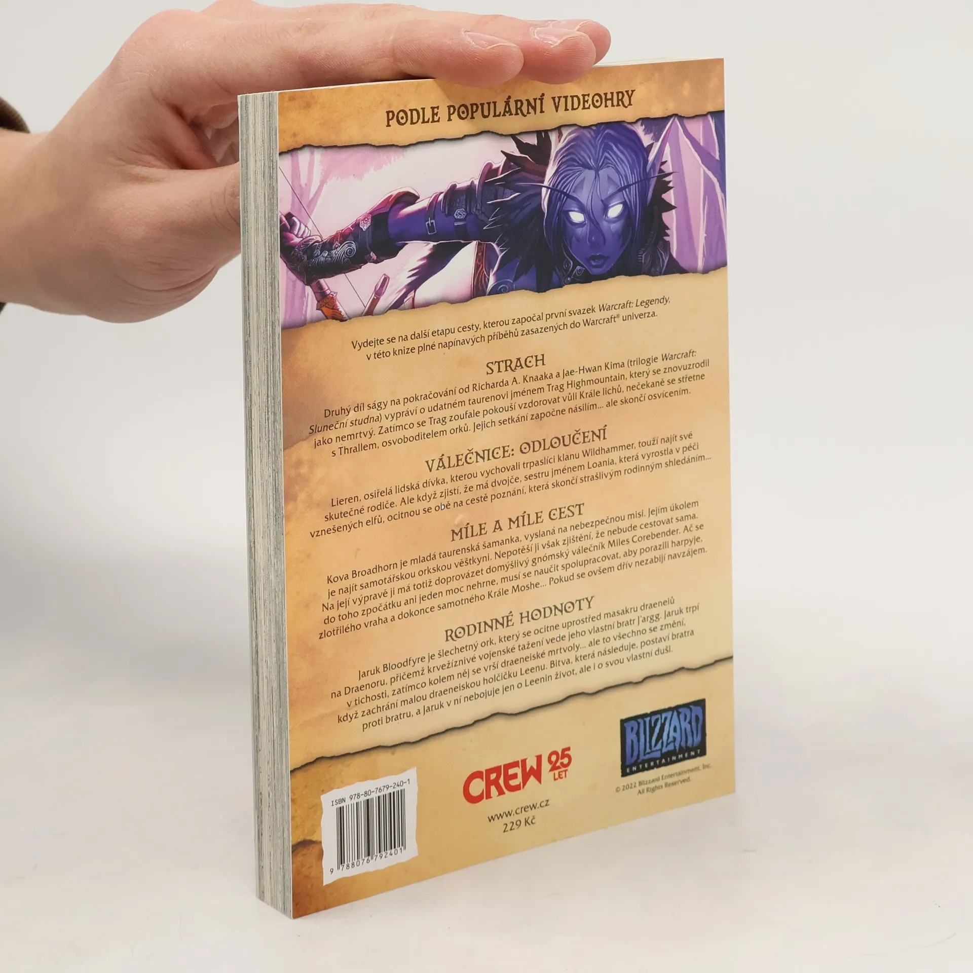 Vydejte se na další etapu cesty, kterou započal první svazek Warcraft: Legendy, v tomto druhém díle plném napínavých příběhů zasazených do Warcraft® univerza. STRACH vypráví o udatném taurenovi Trag Highmountainovi, který se znovuzrodil jako nemrtvý a zoufale se snaží vzdorovat vůli Krále lichů. Nečekaně se setkává s Thrallem, osvoboditelem orků, a jejich setkání přináší násilí, ale i osvícení. VÁLEČNICE: ODLOUČENÍ sleduje Lieren, osiřelou dívku vychovanou trpaslíky klanu Wildhammer, která touží najít své skutečné rodiče. Když zjistí, že má dvojče, sestru Loanii, vychovanou vznešenými elfy, obě se ocitnou na cestě poznání, která vyústí v děsivé rodinné shledání. MÍLE A MÍLE CEST představuje Kovu Broadhorn, mladou taurenskou šamanku, která je vyslána na nebezpečnou misi za orkskou věštkyní. Na cestě ji doprovází domýšlivý gnómský válečník Miles Corebender, ačkoliv se ani jeden z nich do spolupráce příliš nehrne. Musí se naučit spolupracovat, aby porazili harpyje, zlotřilého vraha a Krále Moshe. RODINNÉ HODNOTY se zaměřuje na Jaruka Bloodfyre, šlechetného orka, který se ocitá uprostřed masakru draeneiů na Draenoru, vedeného jeho bratrem J’arggem. Jaruk trpí v tichosti, ale vše se změní, když zachrání malou draeneiskou holčičku Leenu, což vyvolá bitvu bratří proti sobě.