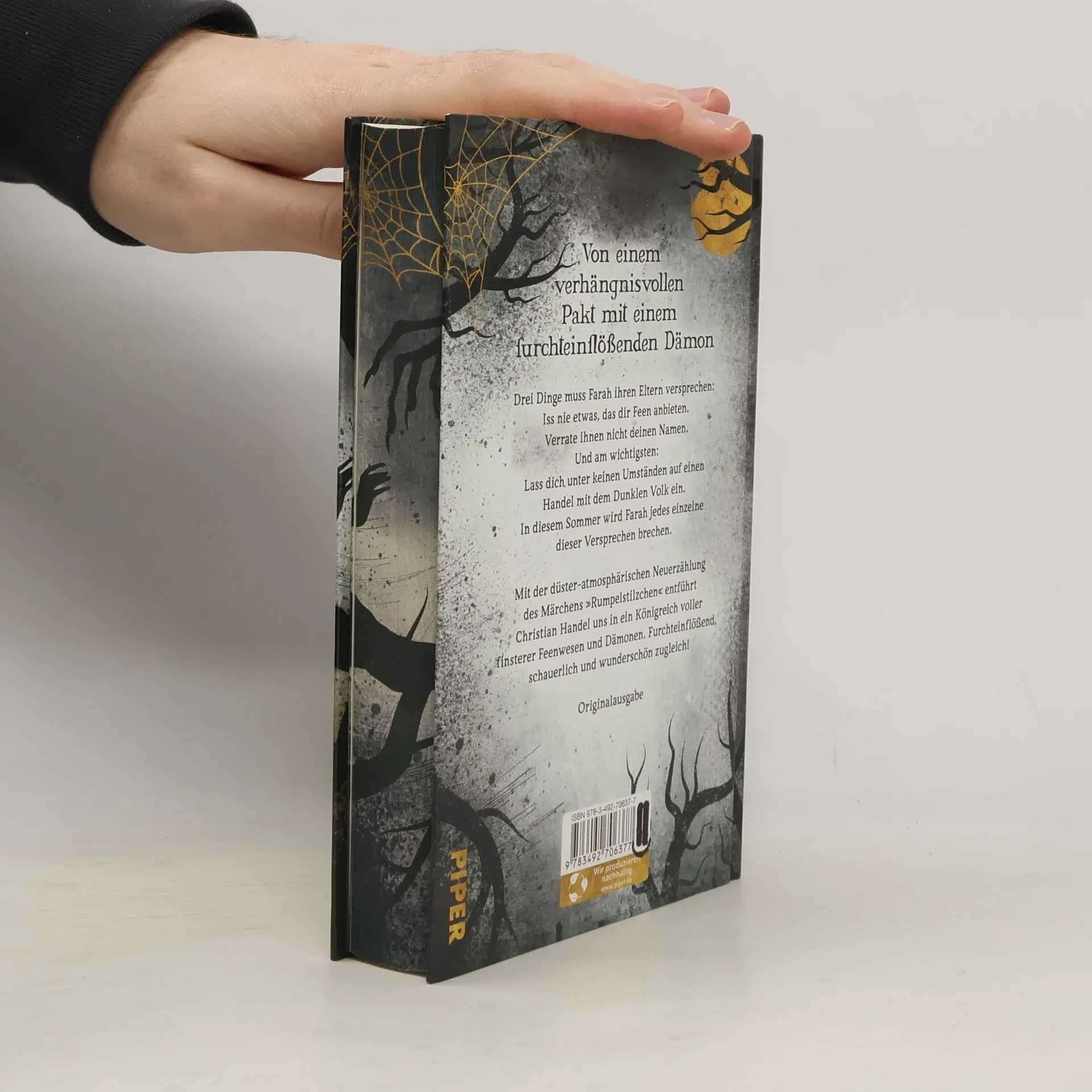 Von einem verhängnisvollen Pakt mit einem furchteinflößenden Dämon Drei Dinge muss Farah ihren Eltern versprechen: Iss nie etwas, das dir Feen anbieten. Verrate ihnen nicht deinen Namen. Und am wichtigsten: Lass dich unter keinen Umständen auf einen Handel mit dem Dunklen Volk ein. In diesem Sommer wird Farah jedes einzelne dieser Versprechen brechen. Mit der düster-atmosphärischen Neuerzählung des Märchens »Rumpelstilzchen« entführt Christian Handel in ein Königreich voller finsterer Feenwesen und Dämonen. Furchteinflößend, schauerlich und wunderschön zugleich! »Ein Kitzeln an der Wange weckte mich. Verschlafen versuchte ich, das, was mich berührte, mit dem Handrücken wegzuwischen. Als die Erkenntnis einsickerte, dass vermutlich ein Insekt über mein Gesicht krabbelte, riss ich die Augen auf und schoss mit dem Oberkörper hoch. Doch es war kein Käfer, der mich geweckt hatte. Sämtliche Luft entwich aus meinen Lungenflügeln, mein ganzer Körper erstarrte. Über mich gebeugt stand das Wesen aus dem Wald, der Spinnenmann. Groß und hager, die knochigen Gliedmaßen an den Gelenken seltsam verdreht, als sei er ein zum Leben erwachter Baum. Seine Augen leuchteten gespenstisch. Erinnerst du dich, flüsterte das Wesen, ohne seine Lippen zu bewegen. Ich war mir nicht sicher, ob ich seine Stimme mit den Ohren oder nur in meinem Kopf hörte. Farah …?«