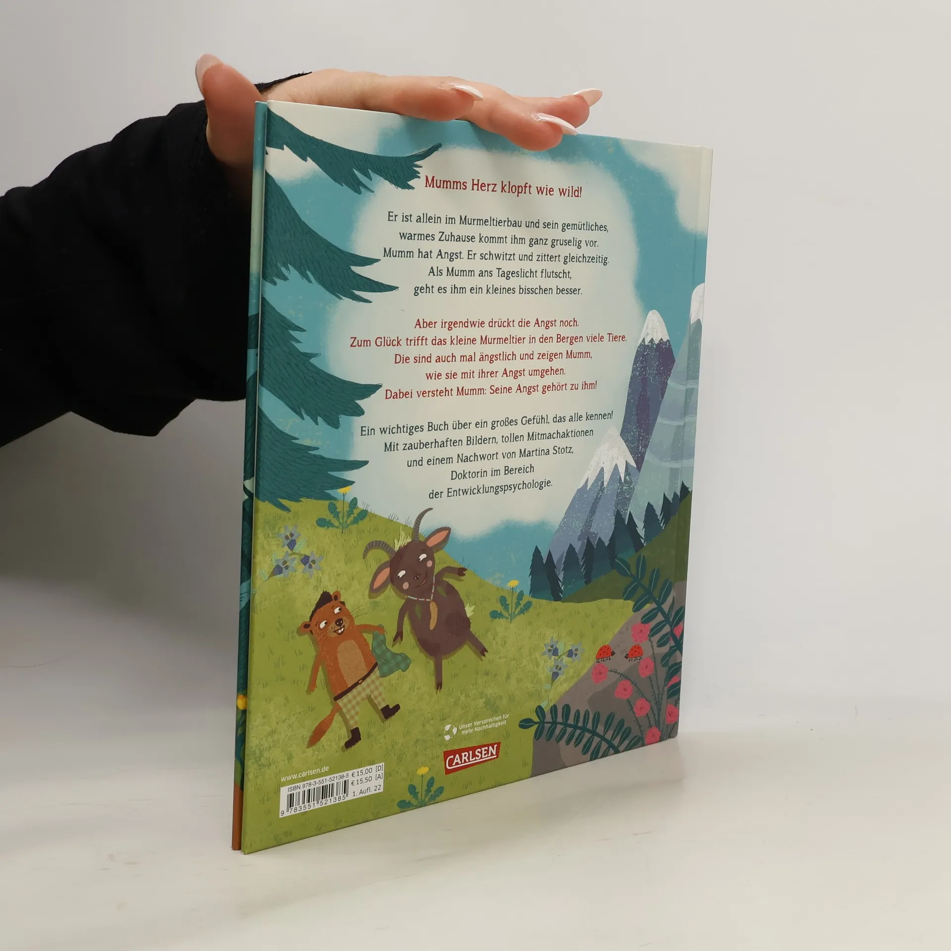 Murmeltier Mumms Herz klopft wie wild, denn er ist ganz allein im riesigen Murmeltierbau. Plötzlich kommt ihm sein gemütliches warmes Zuhause ganz gruselig vor. Er schwitzt, obwohl es angenehm kühl ist, und er will nur noch raus. Als er ans Tageslicht flutscht, geht es Mumm ein kleines bisschen besser. Aber irgendwie drückt die Angst noch ... Zum Glück trifft Mumm in den Bergen viele Tiere: Die sind auch mal ängstlich und zeigen Mumm, was ihnen hilft. So versteht Mumm, dass die Angst zu ihm gehört, und schafft es, sie anzunehmen. Er erfährt, dass jede*r mal ängstlich ist und dass man sich für dieses Gefühl nicht schämen muss! Im Gegenteil – die Angst fühlt sich zwar bedrückend an, aber Mumm lernt, damit umzugehen und das macht ihn stark! Viele tolle Mitmachaktionen stärken die Kinder und machen jede Menge Spaß! So wird der Umgang mit Ängsten spielerisch geprobt. Botschaft: Angst zu haben ist normal! Ein wertvolles Buch über ein großes Gefühl Zum Mitmachen und Mutfassen Stärkt die Resilienz Von den Urheberinnen der Bestseller Wenn ich wütend bin & Wenn ich traurig bin Mit einem Nachwort von Martina Stotz, Doktorin im Bereich der Entwicklungspychologie Ein liebevoll gestaltetes und pädagogisch wertvolles Bilderbuch, das Kinderängste ernst nimmt. Auch für die Erzieherinnen und Erzieher geeignet.