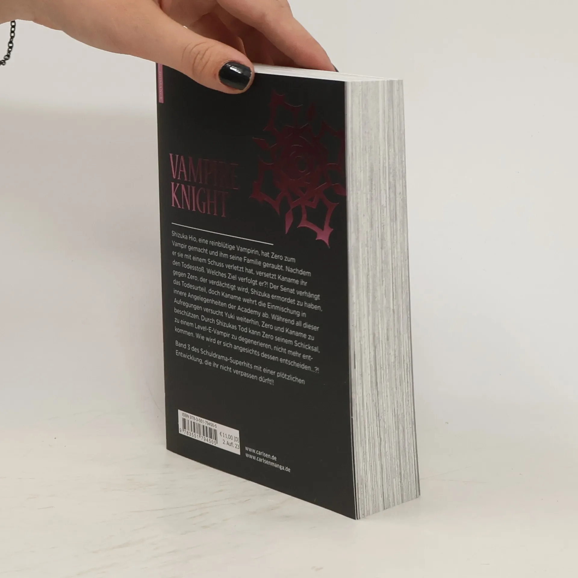 Die 19-bändige Erfolgs-Serie aus dem Magazin DAISUKI: VAMPIRE KNIGHT jetzt in 10 Doppelbänden in wunderschöner Ausstattung. Shizuka Hio, eine reinblütige Vampirin, hat Zero zum Vampir gemacht und ihm seine Familie geraubt. Nachdem er sie mit einem Schuss verletzt hat, versetzt Kaname ihr den Todesstoß. Welches Ziel verfolgt er?! Der Senat verhängt gegen Zero, der verdächtigt wird, Shizuka ermordet zu haben, das Todesurteil, doch Kaname wehrt die Einmischung in innere Angelegenheiten der Academy ab. Während all dieser Aufregungen versucht Yuki weiterhin, Zero und Kaname zu beschützen. Durch Shizukas Tod kann Zero seinem Schicksal, zu einem Level-E-Vampir zu degenerieren, nicht mehr entkommen. Wie wird er sich angesichts dessen entscheiden…?! Band 3 des Schuldrama-Superhits mit einer plötzlichen Entwicklung, die ihr nicht verpassen dürft!! Ein Muss für Fans von Vampirromanzen! Weitere Infos: - wunderschönes Rückenbild - Manga-Klassiker aus der DAISUKI / BEST OF DAISUKI - für Leser*innen ab 12 Jahren
