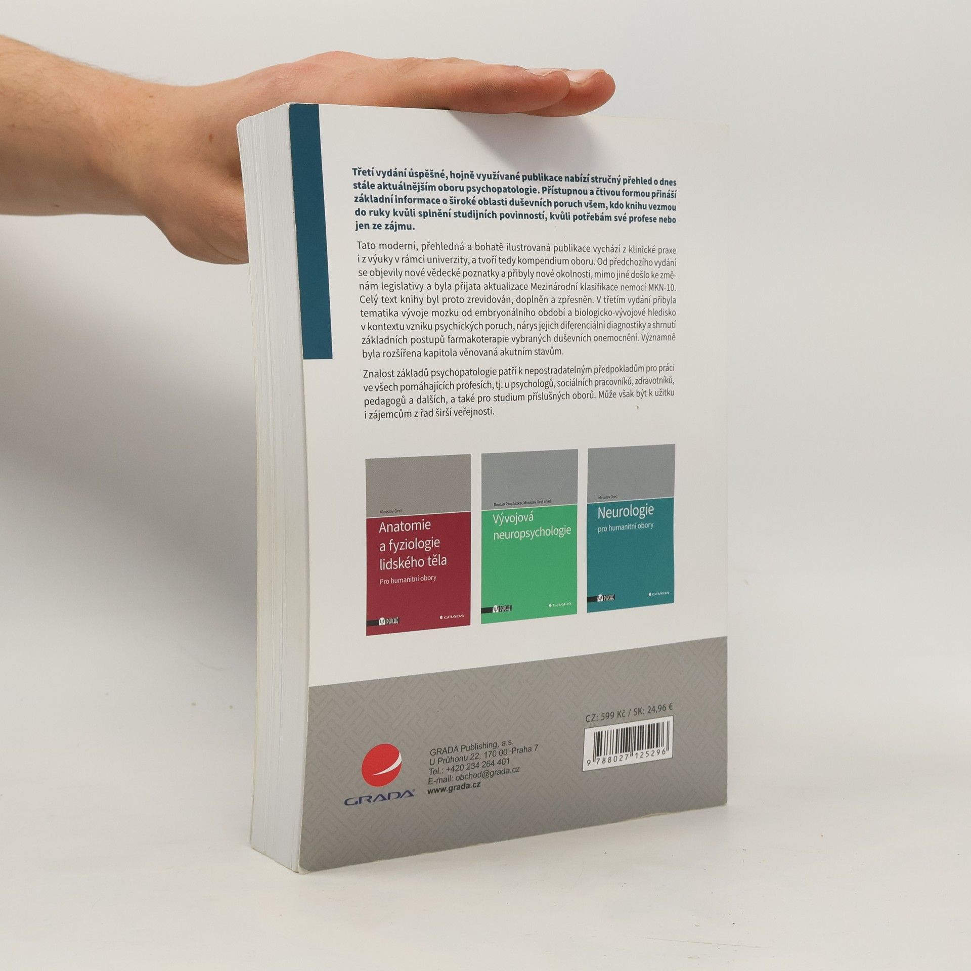 Třetí vydání úspěšné, hojně využívané publikace nabízí stručný přehled o dnes stále aktuálnějším oboru psychopatologie. Přístupnou a čtivou formou přináší základní informace o široké oblasti duševních poruch všem, kdo knihu vezmou do ruky kvůli splnění studijních povinností, kvůli potřebám své profese nebo jen ze zájmu. Tato moderní, přehledná a bohatě ilustrovaná publikace vychází z klinické praxe i z výuky v rámci univerzity, a tvoří tedy kompendium oboru. Od předchozího vydání se objevily nové vědecké poznatky a přibyly nové okolnosti, mimo jiné došlo ke změnám legislativy a byla přijata aktualizace Mezinárodní klasifikace nemocí MKN-10. Celý text knihy byl proto zrevidován, doplněn a zpřesněn. V 3. vydání přibyla tematika vývoje mozku od embryonálního období a biologicko-vývojové hledisko v kontextu vzniku psychických poruch, nárys jejich diferenciální diagnostiky a shrnutí základních postupů farmakoterapie vybraných duševních onemocnění. Významně byla rozšířena kapitola věnovaná akutním stavům. Znalost základů psychopatologie patří k nepostradatelným předpokladům pro práci ve všech pomáhajících profesích, tj. u psychologů, sociálních pracovníků, zdravotníků, pedagogů a dalších, a také pro studium příslušných oborů. Může však být k užitku i zájemcům z řad širší veřejnosti.