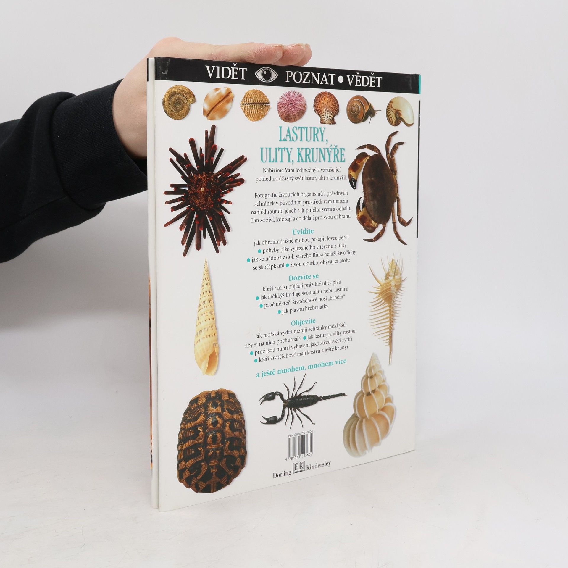 Základní informace o lasturách, ulitách a krunýřích a živočiších, kteří v nich žijí. Text doprovází velké množství barevných fotografií. Kniha je vhodná nejen pro děti. Přehledná kniha popisuje lastury, ulity, krunýře a jejich obyvatele. Jedná se o živočichy, které tvrdý vnější pokryv chrání proti predátorům, mechanickému poškození či teplotním výkyvům. Mezi obratlovci se nachází pouze jediný druh, který má vnitřní kostru i vnější pevnou kostru, která kryje celé tělo. Tímto druhem jsou želvy. Většina ostatních živočichů s tvrdou schránou jsou bezobratlí živočichové (bez páteře) a mnoho z nich jsou velmi jednoduché organismy. K těmto živočichům patří měkkýši, kterých je nejvíce, dále pak korýši a ostnokožci. Kromě základních informací o pevných tělních pokryvech těchto živočichů se mohou čtenáři dozvědět, jak se zrodí perla či něco o sbírání takových schránek. Vychází v edici Vidět-poznat-vědět. (www.mlp.cz)