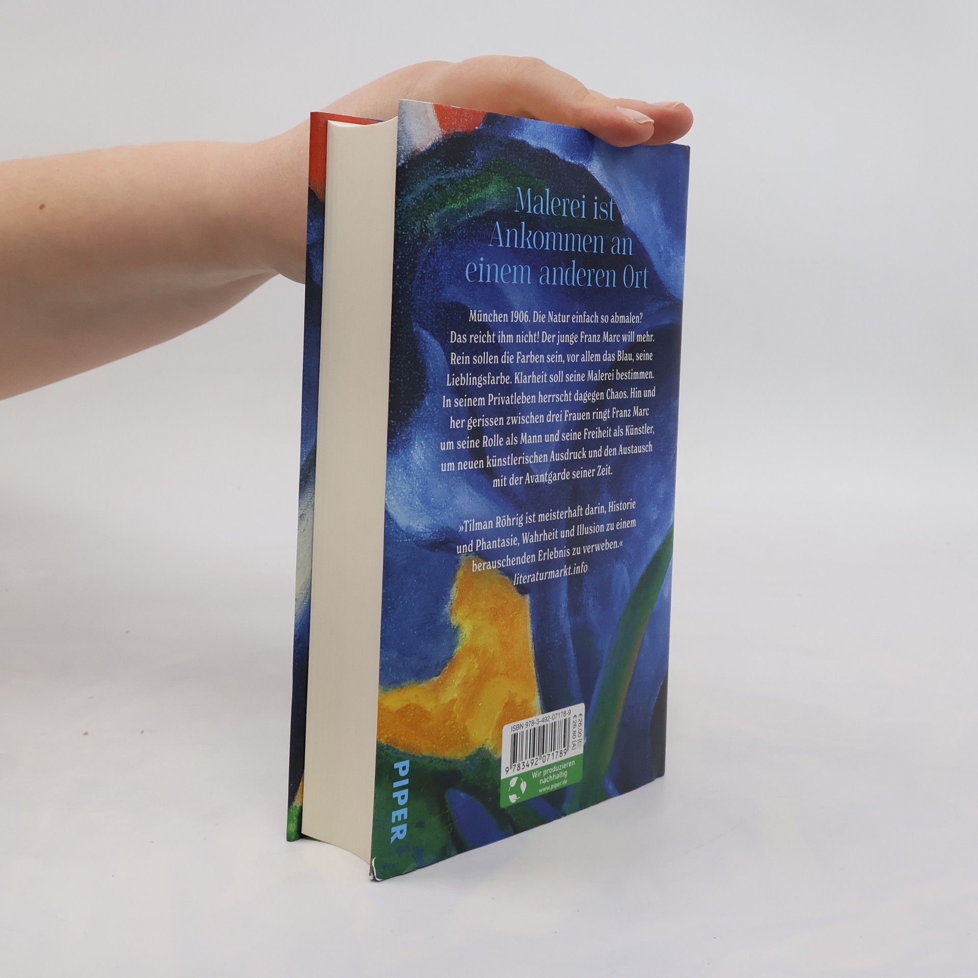 Farbenprächtig wie seine Bilder und leidenschaftlich wie seine Beziehungen zu den Frauen: der große Roman über Franz Marc. In »Der Maler und das reine Blau des Himmels« erzählt Tilman Röhrig meisterhaft vom Leben des bedeutendsten Malers des Expressionismus und den Menschen, die ihn prägten. So entsteht ein fesselnder Künstlerroman über einen jungen Mann, der im Wirrwarr seiner Gefühle nach sich selbst und neuen Wegen für seine Kunst sucht. München 1906: Der junge Franz Marc will mehr als nur die Natur abmalen. Rein sollen die Farben sein, besonders das Blau, seine Lieblingsfarbe. In seinem Privatleben hingegen herrscht Chaos. Zwischen drei Frauen ringt er um seine Rolle als Mann und Freiheit als Künstler, um neuen künstlerischen Ausdruck und den Austausch mit der Avantgarde. Die Bilder Franz Marcs, mit strahlenden, klaren Farben, waren zu seiner Zeit gewagt und skandalträchtig. In diesem farbenfrohen Roman lässt Röhrig die Leser am Leben des Mitbegründers des „Blauen Reiters“ teilhaben und zeigt Marc zwischen Kunst und Skandal, Freundschaften und Liebschaften, Natur und Moderne. »Dieser Roman ist ein wahres Feuerwerk an großer Geschichte und kleinen Geschichten.«