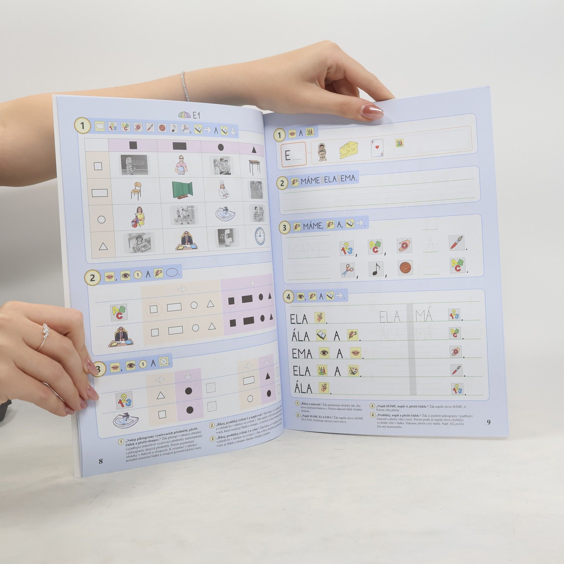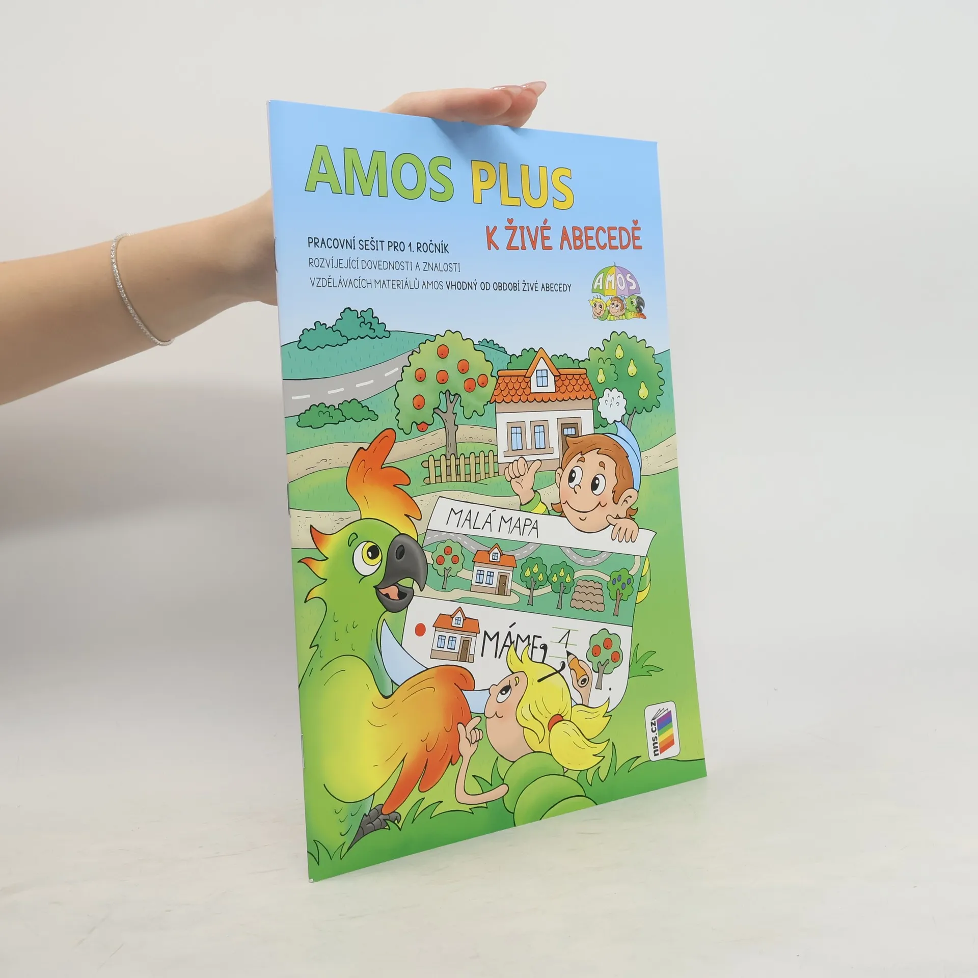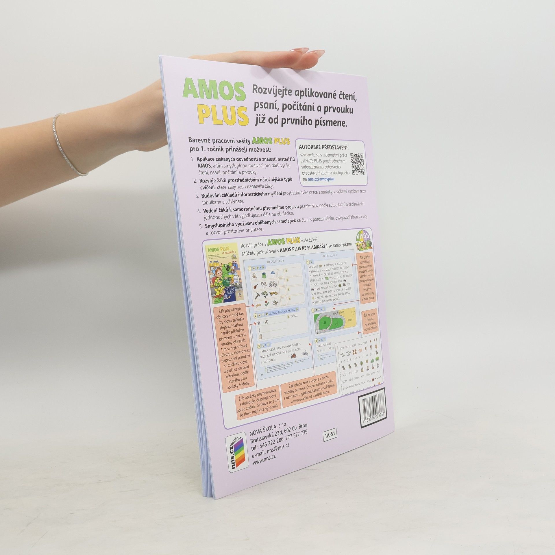 Barevné pracovní sešity AMOS PLUS pro 1. ročník přinášejí možnost: 1. Aplikace získaných dovedností a znalostí materiálů AMOS, a tím smysluplnou motivaci pro další výuku čtení, psaní, počítání a prvouky. 2. Rozvoje žáků prostřednictvím náročnějších typů cvičení, které zaujmou i nadanější žáky. 3. Budování základů informatického myšlení prostřednictvím práce s obrázky, značkami, symboly, texty, tabulkami a schématy. 4. Vedení žáků k samostatnému písemnému projevu psaním slov podle autodiktátů a zapisováním jednoduchých vět vyjadřujících děje na obrázcích. 5. Smysluplného využívání oblíbených samolepek ke čtení s porozuměním, osvojování slovní zásoby a rozvoji prostorové orientace. V rámci uceleného souboru AMOS se mohou žáci 1. ročníku snadno seznamovat s psaním a čtením v Čteme a píšeme s Agátou, s čísly a početními operacemi v Matýskově matematice a se světem kolem nás v Oskarově prvouce. Pracovní sešity AMOS PLUS pak umožní tyto znalosti a dovednosti rozvíjet jejich aplikací v rámci nových typů úkolů, které zaujmout i nadanější žáky. Jako v ostatních materiálech AMOS jsou žáci vedeni k samostatnému řešení úkolů s pomocí piktografi ckých zadání. K řešení úkolů žáci dále využívají i práci s obrázky, značkami, symboly, texty, tabulkami a schématy, a tím budují základy informatického myšlení. NNS1A-51