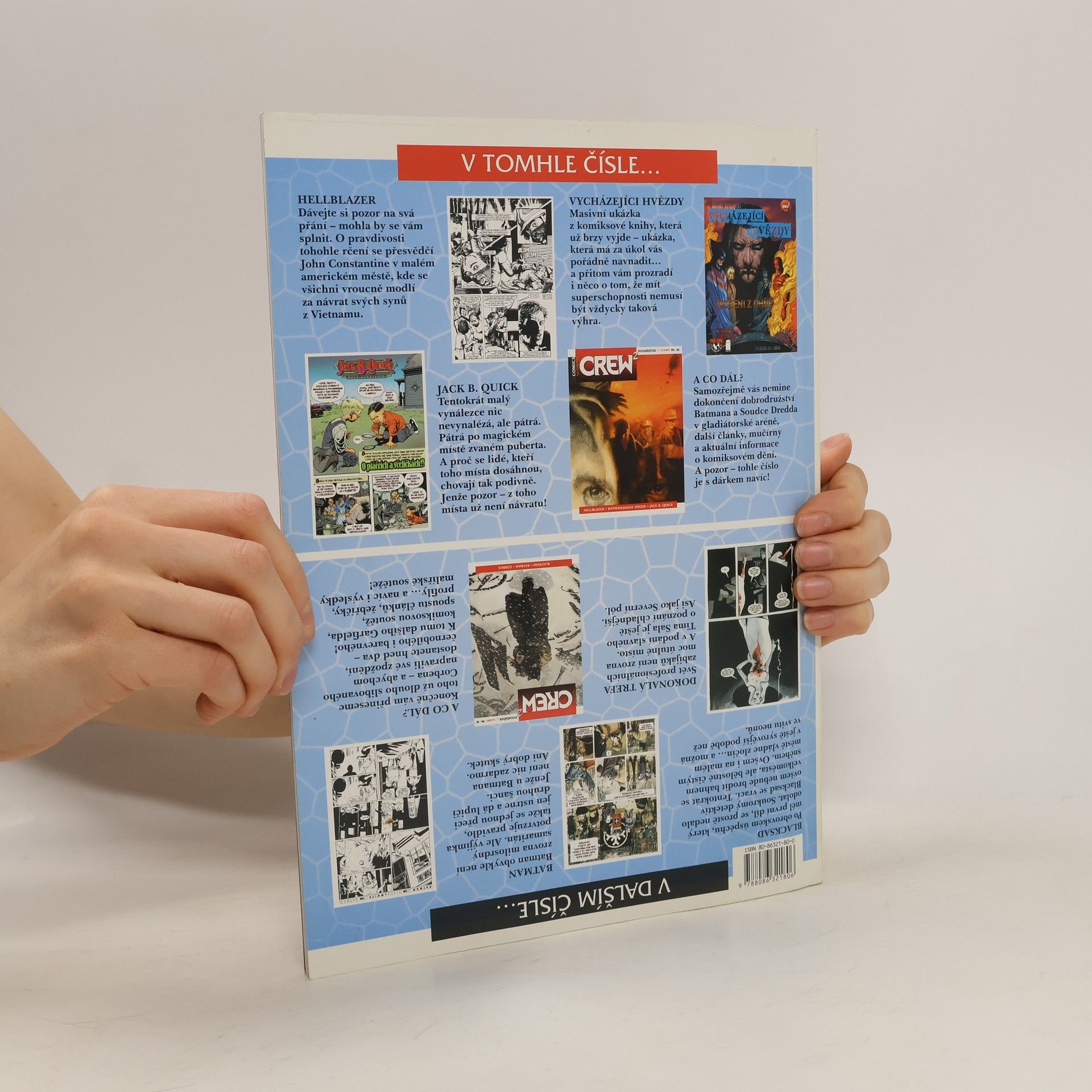 Comicsový časopis neboli comics na kvadrát. Comicsy: Hellblazer: Až Johnny příjde z války domů - Jamie Delano, John Ridgway Jack B. Quick: O ptáčcích a včeličkách - Alan Moore, Kevin Nowlan Batman, Soudce Dredd: Poslední hádanka, část 2 - Alan Grant, John Wagner, Carl Critchlow Vycházející hvězdy (ochutnávka) - J. Michael Straczynski, Keu Cha Publicistika: Číslo třináct žije (úvodník) - Jiří Pavlovský Vaše vnitřnosti v koši nekončí (listárna) Česká krev: Aktuality - Tomáš Prokůpek Mučírna Next Generation: Tváře - Klaus Janson Komiksové milníky: Hugo Pratt - Milan Krejčí Z cizího krev teče: O americkém komiksu - Jiří Pavlovský Patologie: Vycházející hvězdy - Ľudovít Plata Mučírna: Classic - Martin Němec Hello, Hari-nezumi - Ľudovít Plata