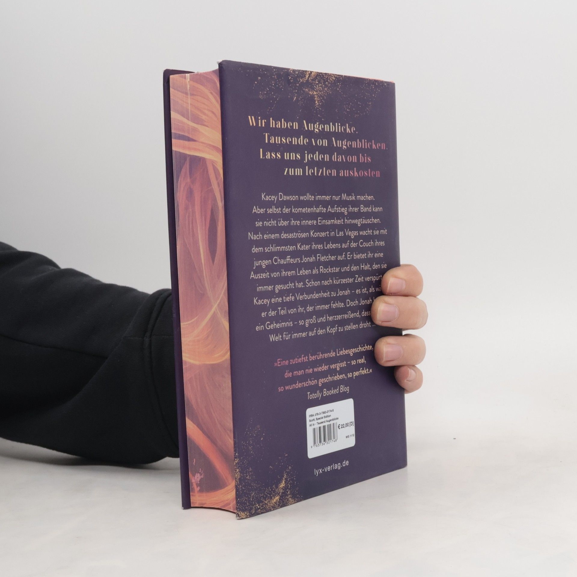 Die Special Edition von ALL IN - TAUSEND AUGENBLICKE - Limitierte Special Edition - Hardcover mit Schutzumschlag und neuem Cover - Mit Farbschnitt passend zu den Covern - Mit illustriertem Vor- und Nachsatzpapier Wir haben Augenblicke. Tausende von Augenblicken. Lass uns jeden davon bis zum Letzten auskosten. Kacey Dawson wollte immer nur Musik machen. Aber selbst der kometenhafte Aufstieg ihrer Band kann sie nicht über ihre innere Einsamkeit hinwegtäuschen. Nach einem desaströsen Konzert in Las Vegas wacht sie mit dem schlimmsten Kater ihres Lebens auf der Couch ihres jungen Chauffeurs Jonah Fletcher auf. Er bietet ihr eine Auszeit von ihrem Leben als Rockstar und den Halt, den sie immer gesucht hat. Schon nach kürzester Zeit verspürt Kacey eine tiefe Verbundenheit zu Jonah - es ist, als wäre er der Teil von ihr, der immer fehlte. Doch Jonah hat ein Geheimnis - so groß und herzzerreißend, dass es ihre Welt für immer auf den Kopf zu stellen droht ... "Eine zutiefst berührende Liebesgeschichte, die man nie wieder vergisst - so real, so wunderschön geschrieben, so perfekt." Totally Booked Blog Band 1 des ALL IN-Duetts von SPIEGEL-Bestseller-Autorin Emma Scott