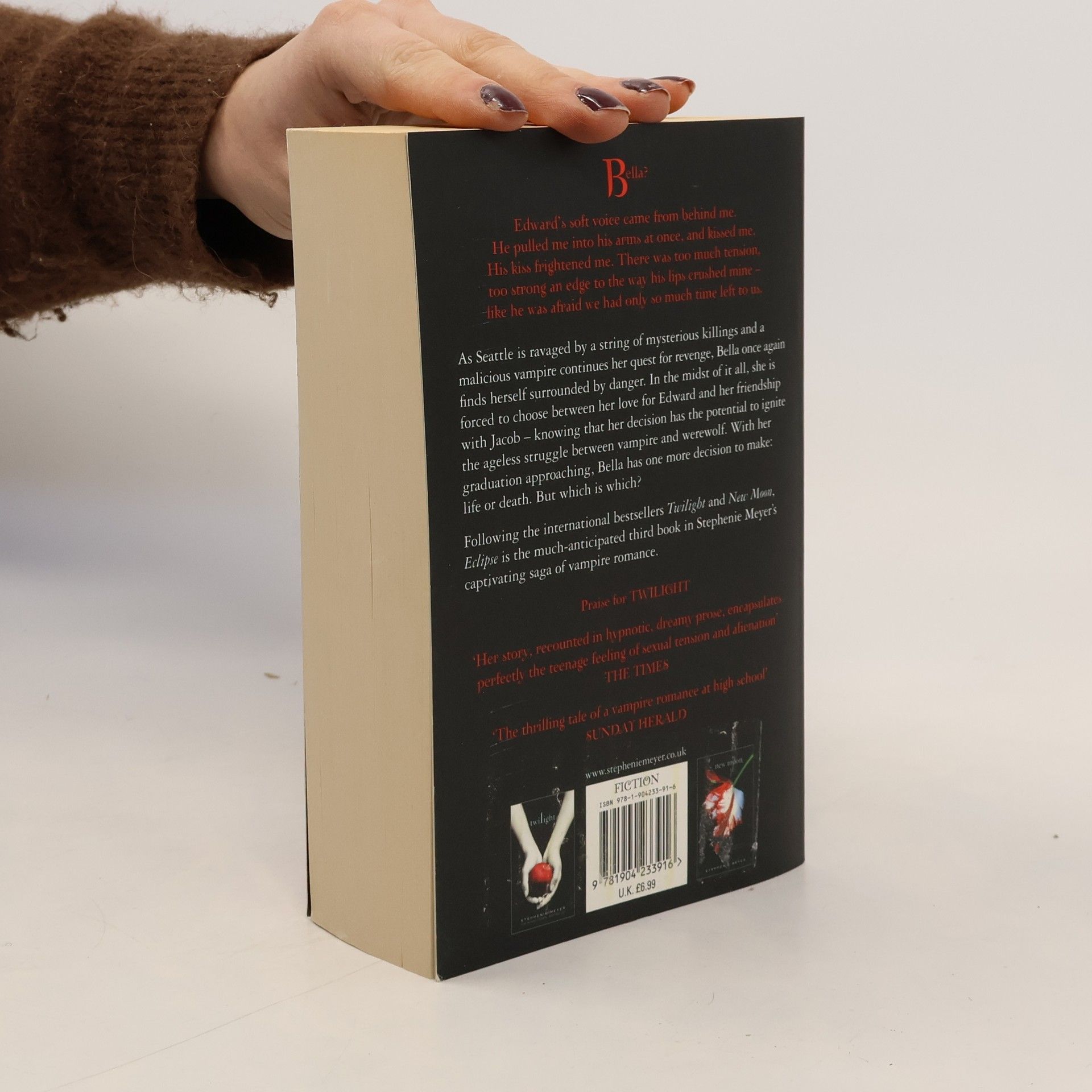 Bella?' Edward's soft voice came from behind me. I turned to see him spring lightly up the porch steps, his hair windblown from running. He pulled me into his arms at once, and kissed me again. His kiss frightened me. There was too much tension, too strong an edge to the way his lips crushed mine - like he was afraid we had only so much time left to us. As Seattle is ravaged by a string of mysterious killings and a malicious vampire continues her quest for revenge, Bella once again finds herself surrounded by danger. In the midst of it all, she is forced to choose between her love for Edward and her friendship with Jacob - knowing that her decision has the potential to ignite the ageless struggle between vampire and werewolf. With her graduation approaching, Bella has one more decision to make: life or death. But which is which? Following the international bestsellers Twilight and New Moon, Eclipse is the much-anticipated third book in Stephenie Meyer's captivating saga of vampire romance.